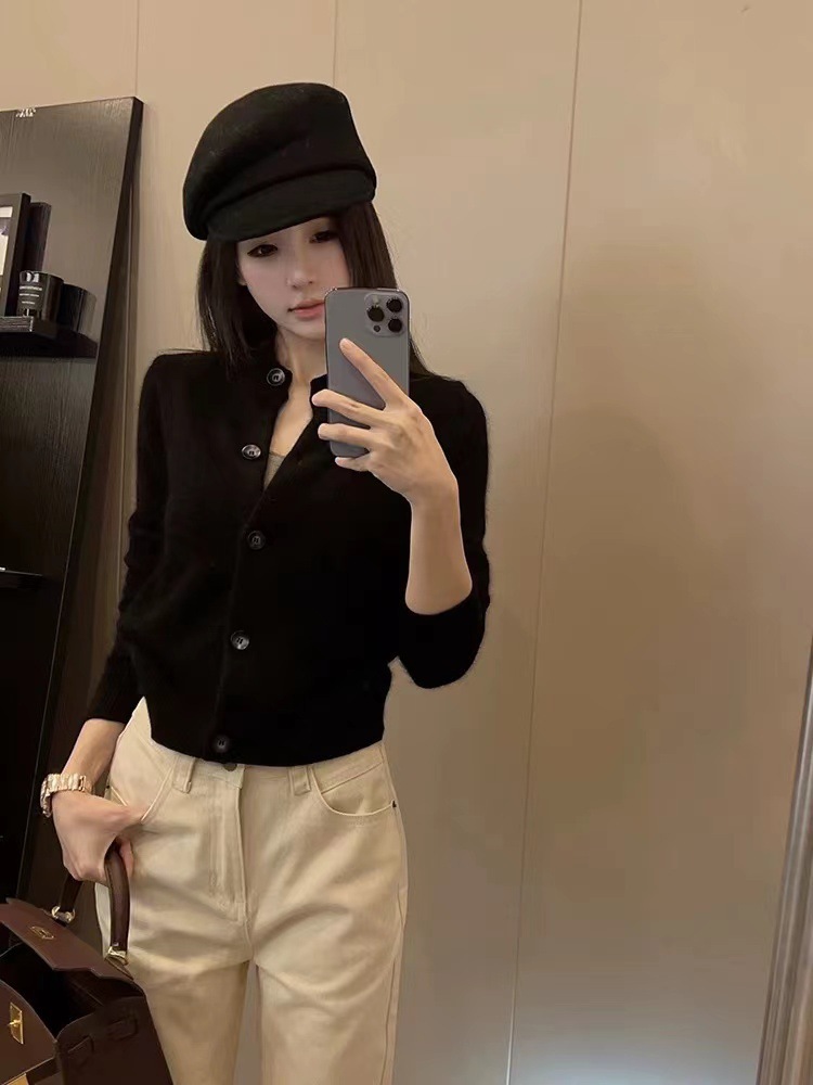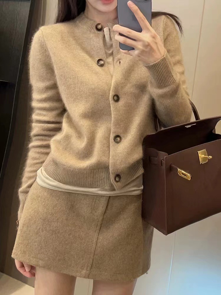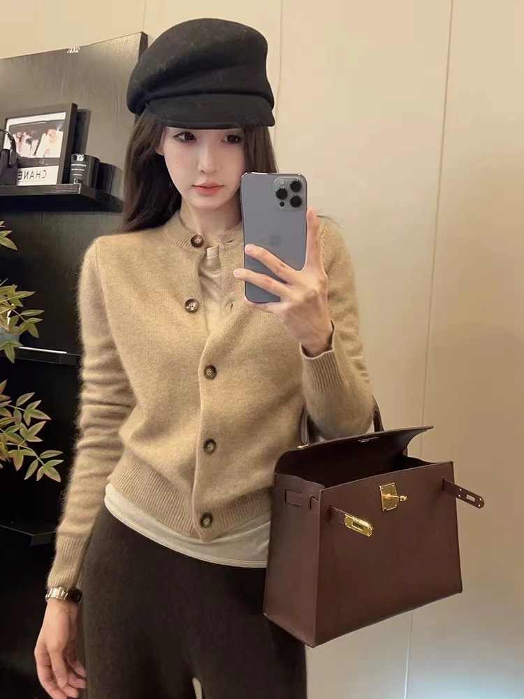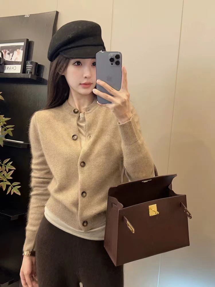 Xiaoxiangfeng 연예인 세련된 라운드 넥 짧은 울 카디건 여성 가을, 겨울 복고풍 스타일 슬림 소프트 밀랍 스웨터 얇은