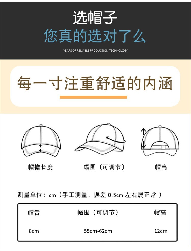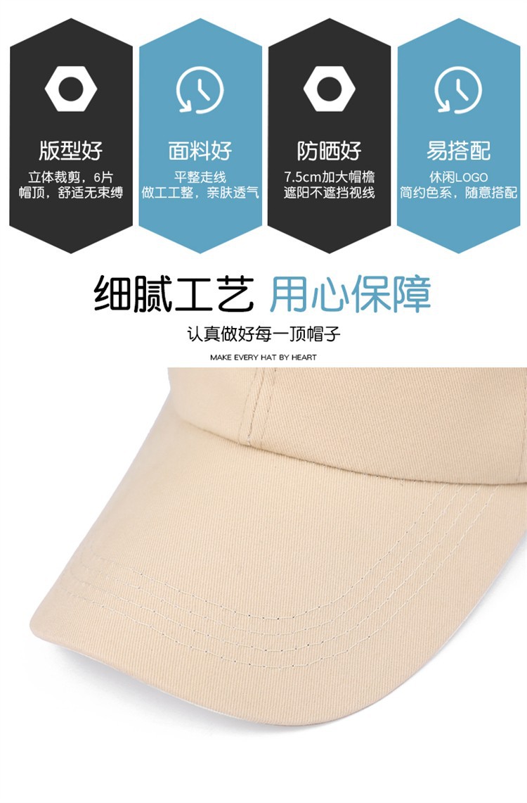 | 帽檐款式 | 弯檐 | 颜色 | 白色, 卡其色, 藏青色, 蓝色, 酒红色, 桔色, 黑色, 橙色, 深蓝色 |