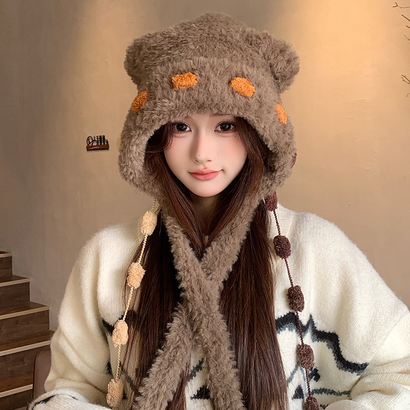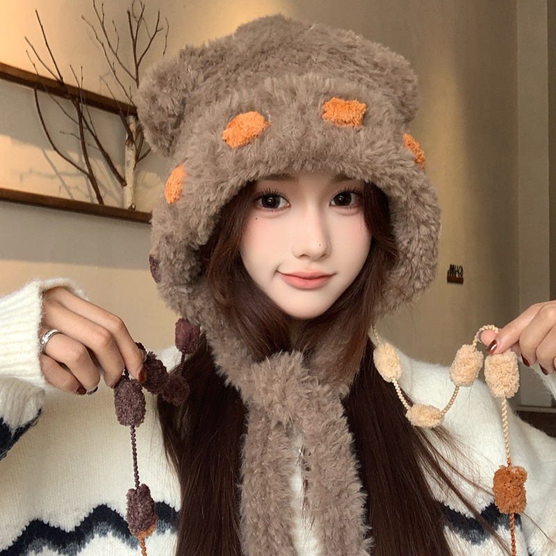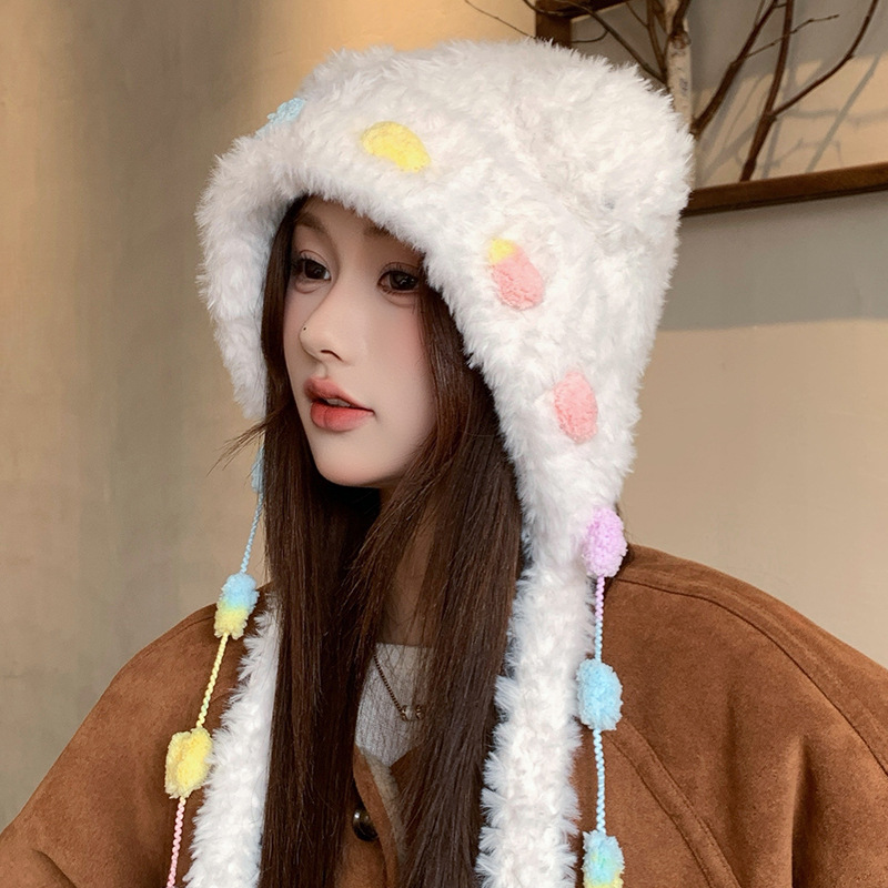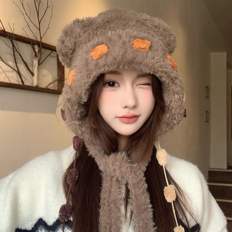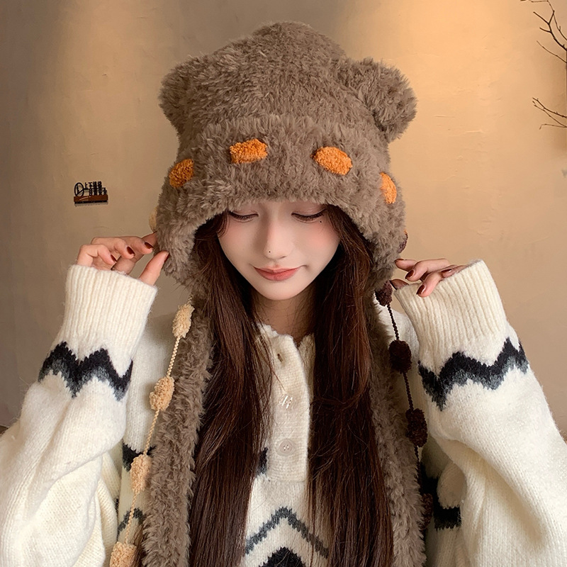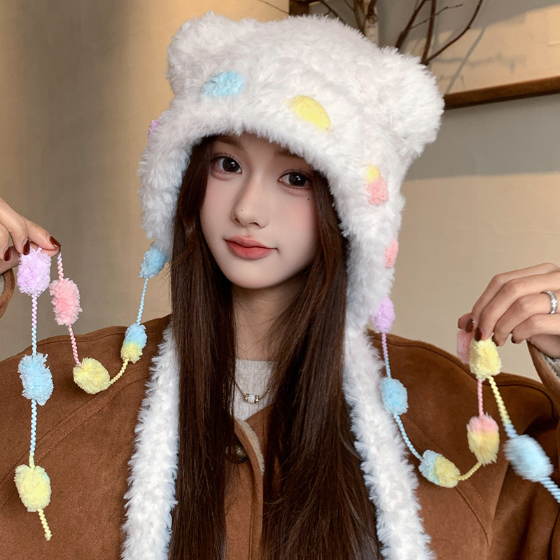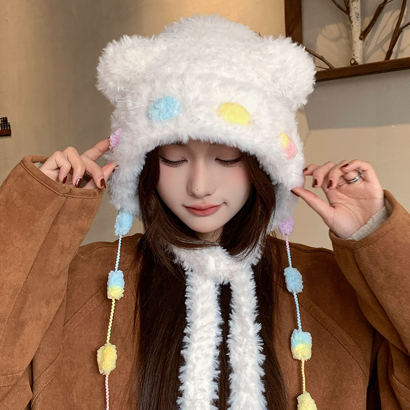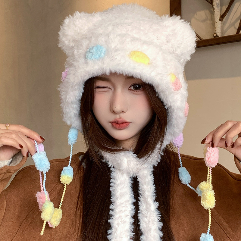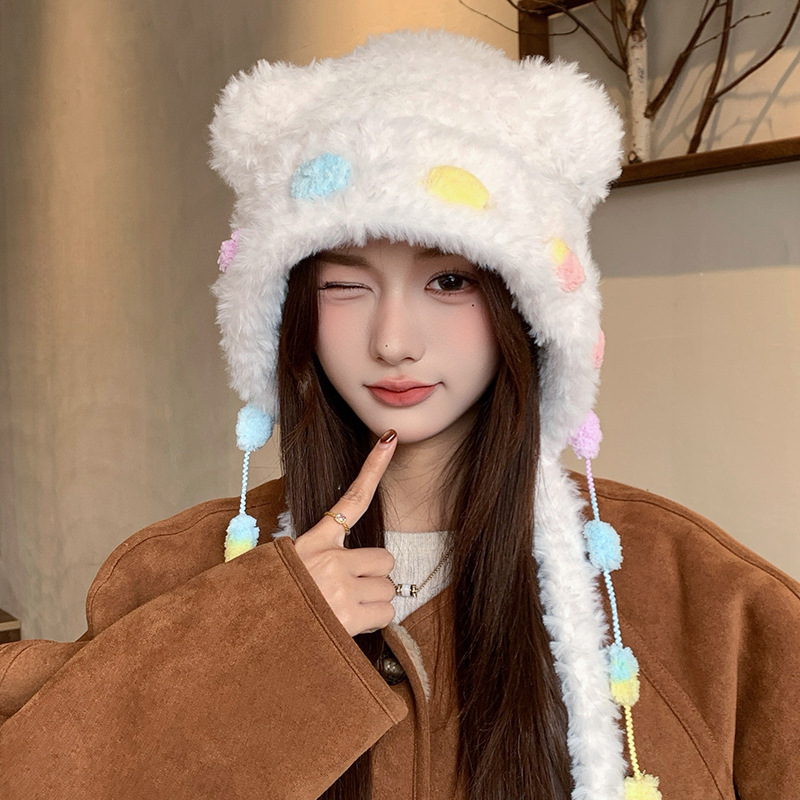 拼色彩条毛绒小熊耳朵毛线帽子女冬季加厚保暖防寒护耳雷锋帽