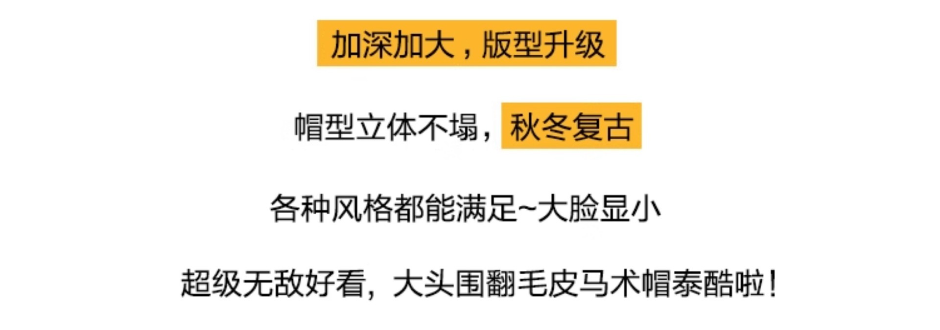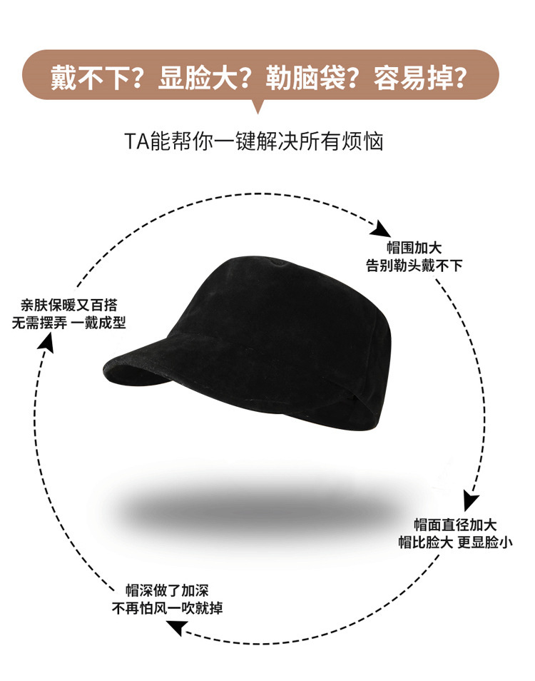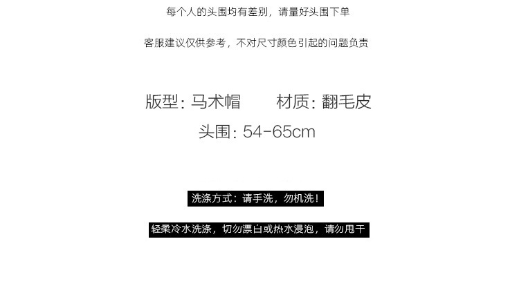 | 颜色 | 翻毛皮平顶马术帽-黑色, 翻毛皮平顶马术帽-卡其色, 翻毛皮平顶马术帽-复古棕, 翻毛皮平顶马术帽-米白色 | 尺码 | 均码款(54-59cm) |