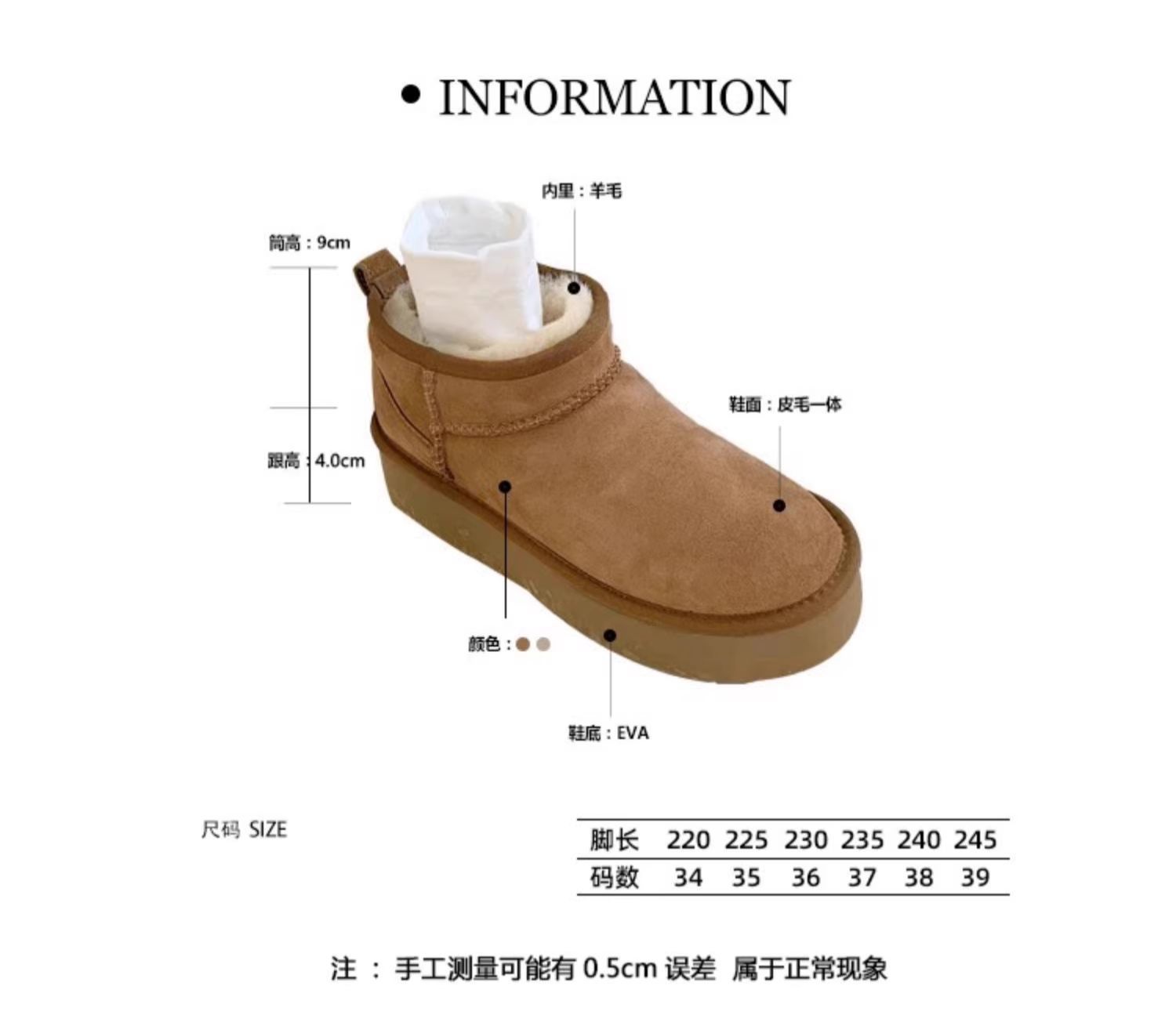 | 颜色 | 栗色(4cm)羊毛版 | 尺码 | 35, 36, 37, 38, 39, 40 |