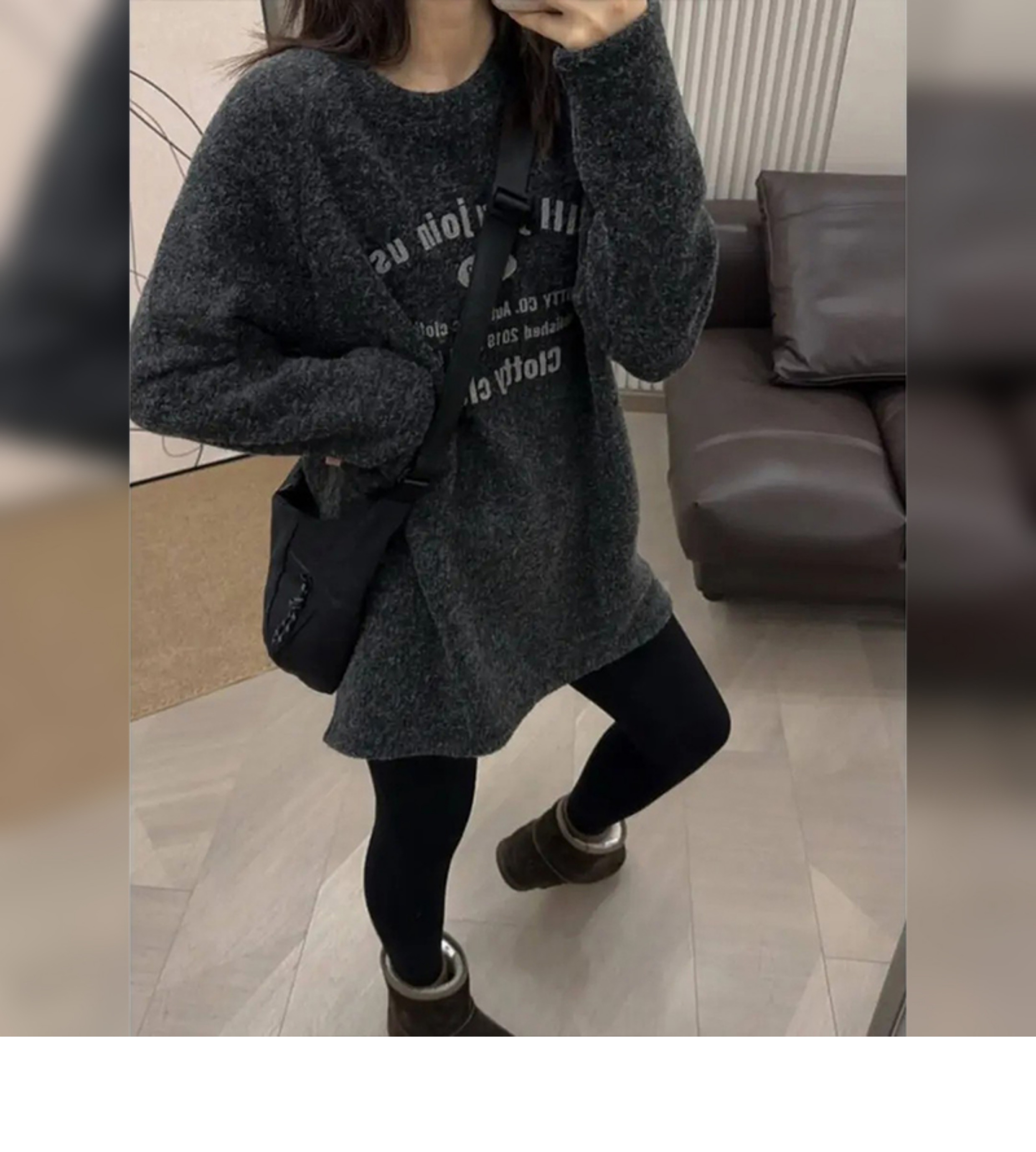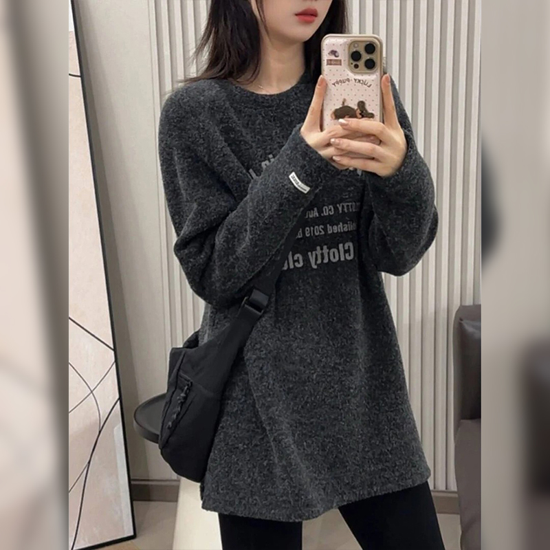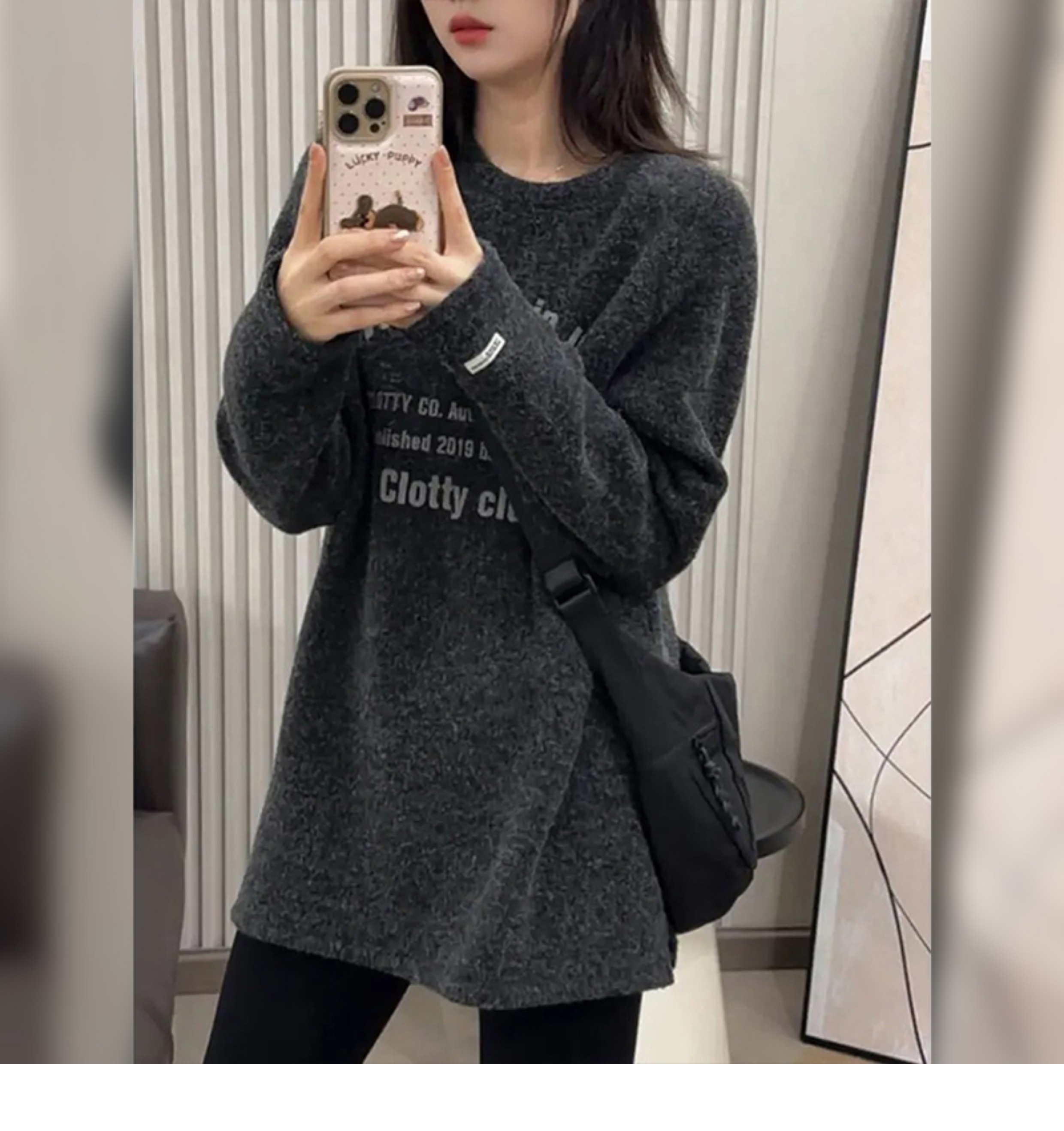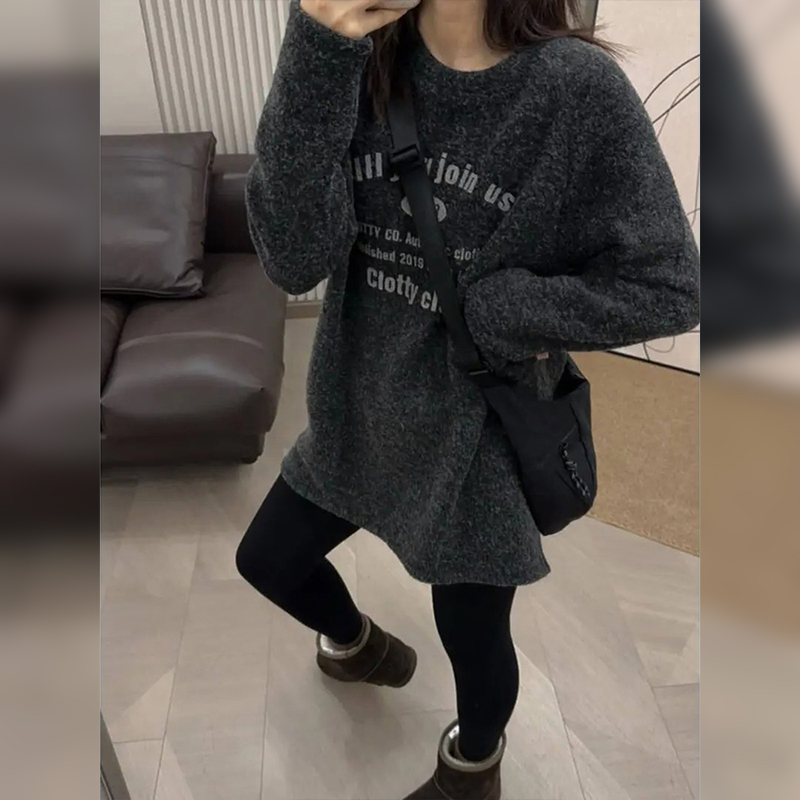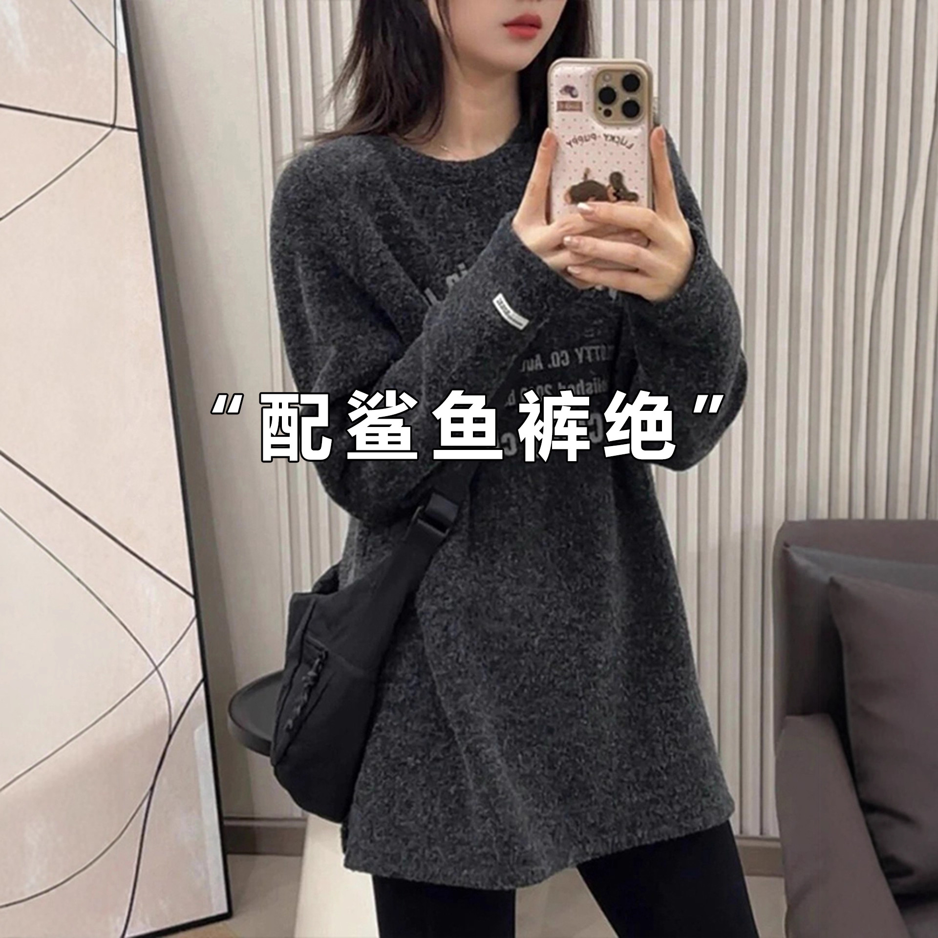 中长款打底衫女秋冬卫衣叠穿内搭字母印花长袖T恤配鲨鱼裤的上衣