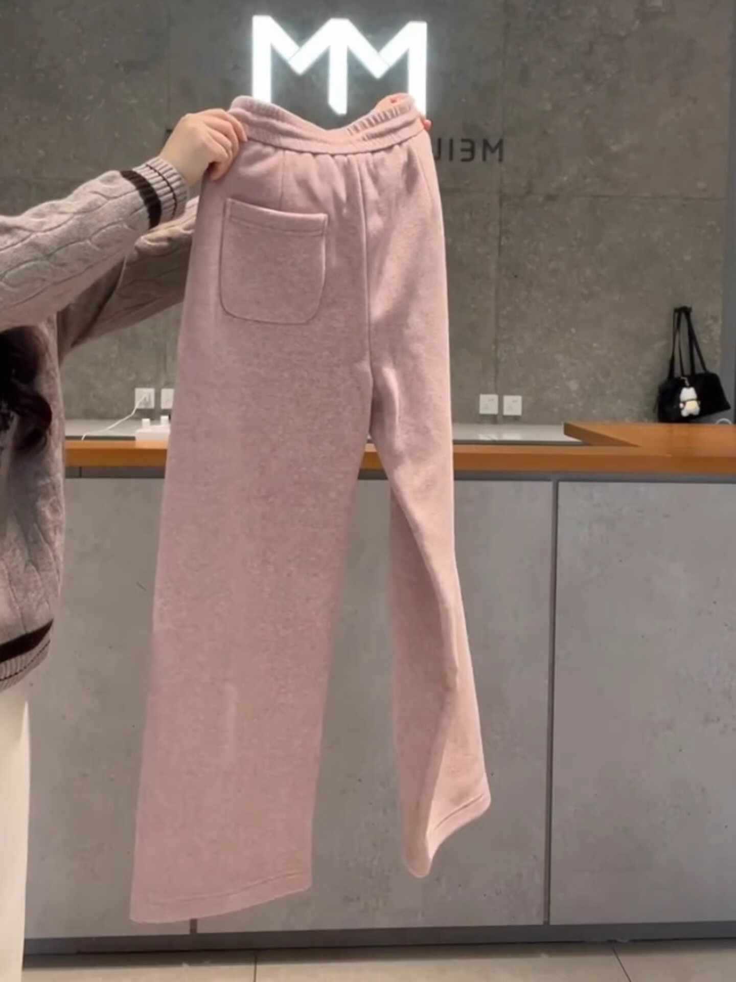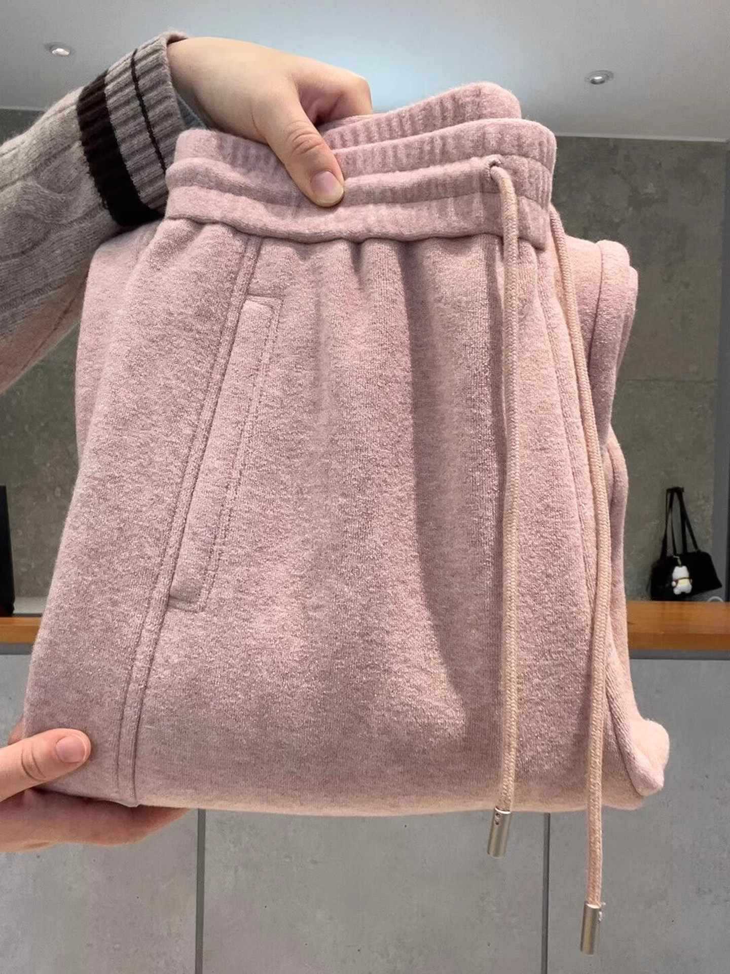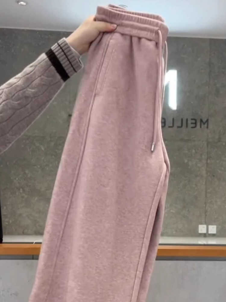 粉色磨毛加绒卫裤女冬季新款时尚舒适保暖松紧腰垂感休闲直筒裤女