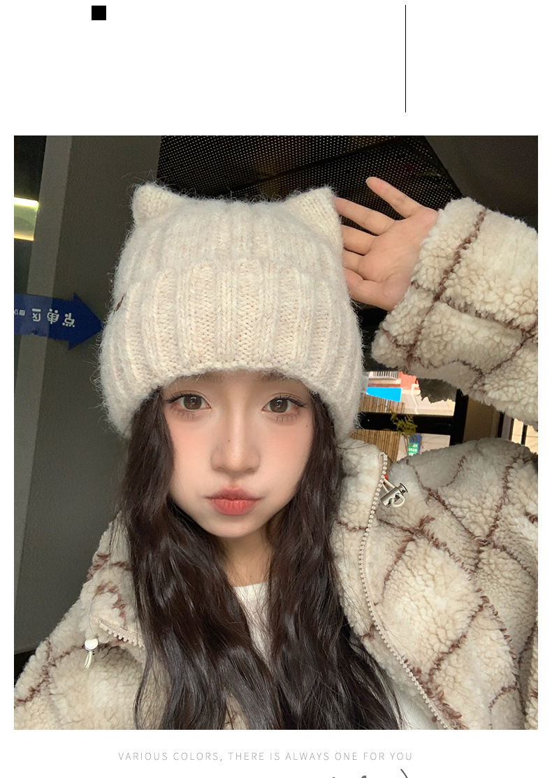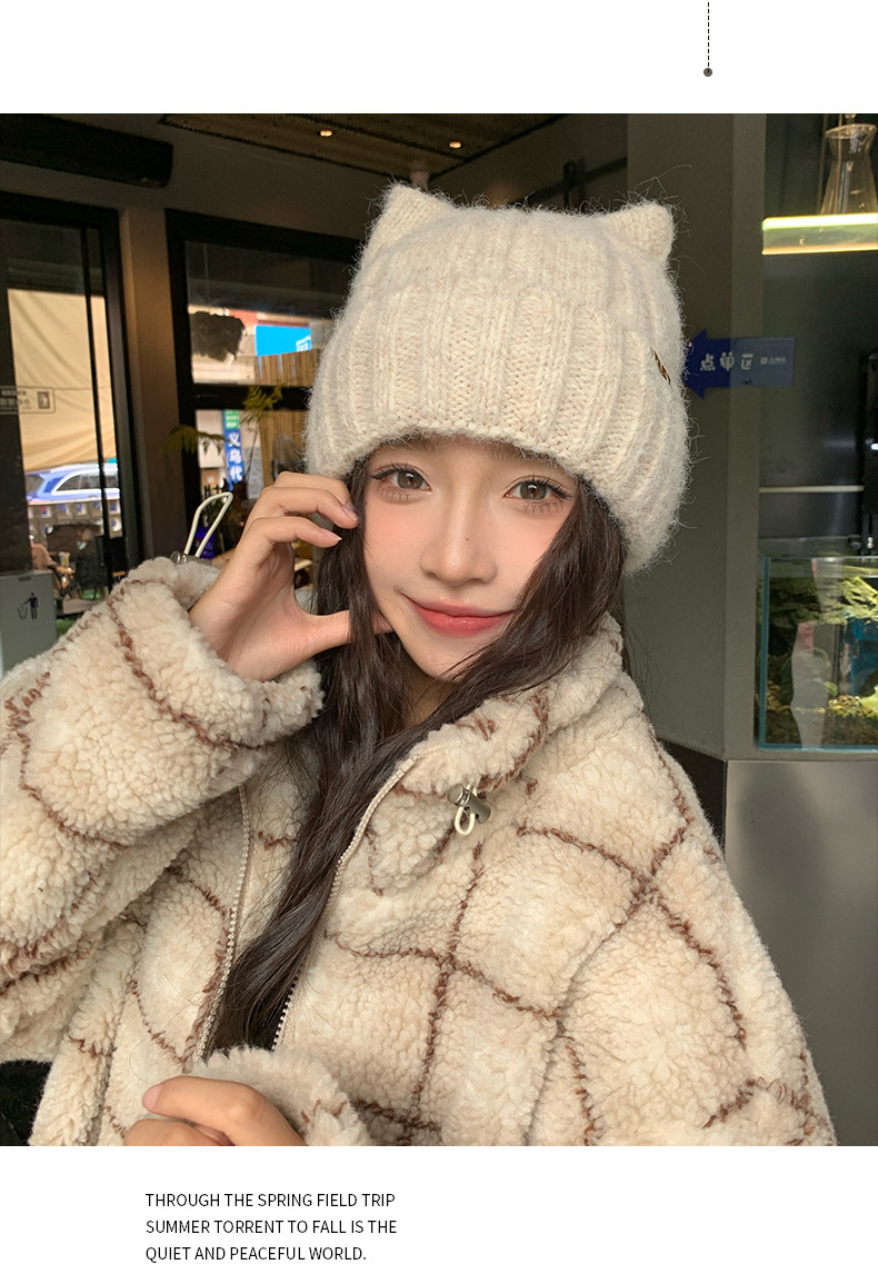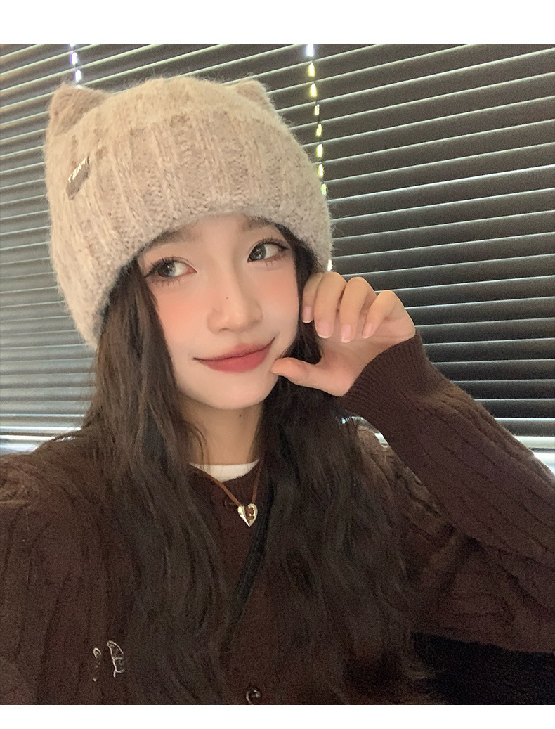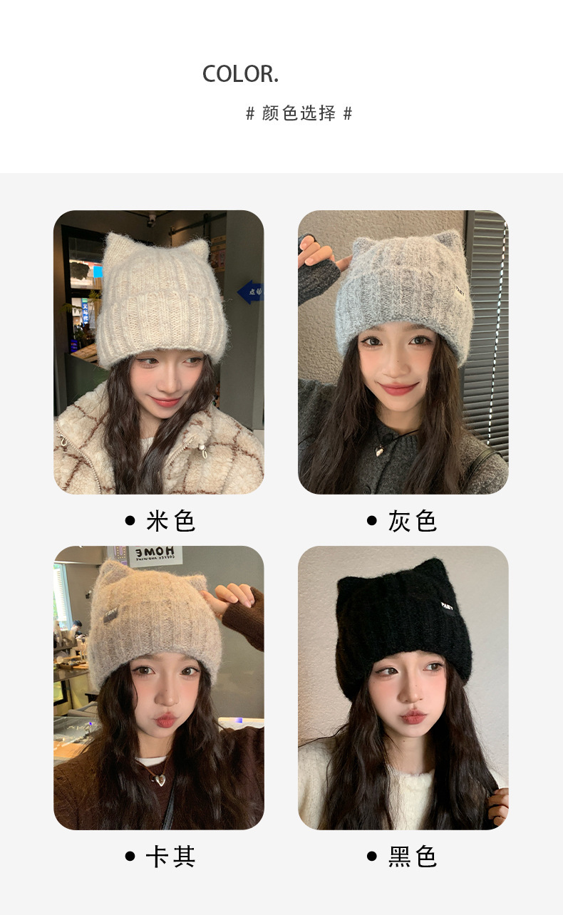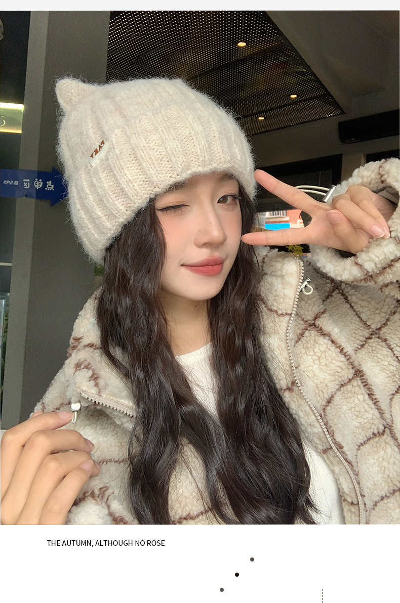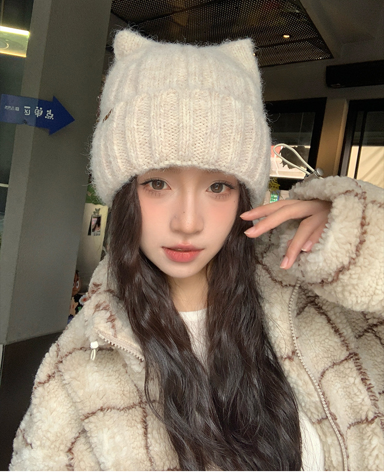 秋冬季加绒猫耳韩版保暖毛线帽新款大头围显脸小护耳帽针织帽子女
