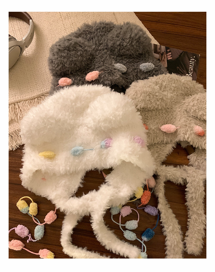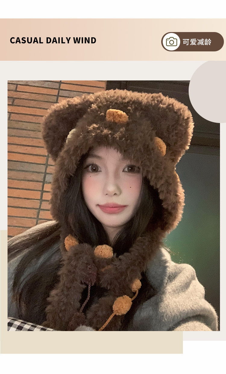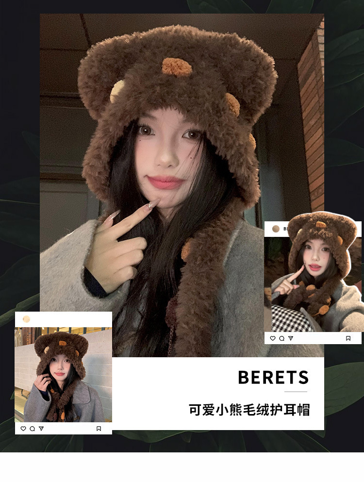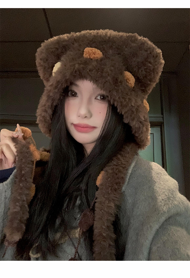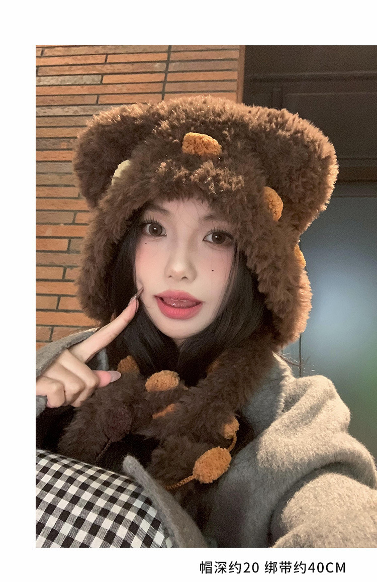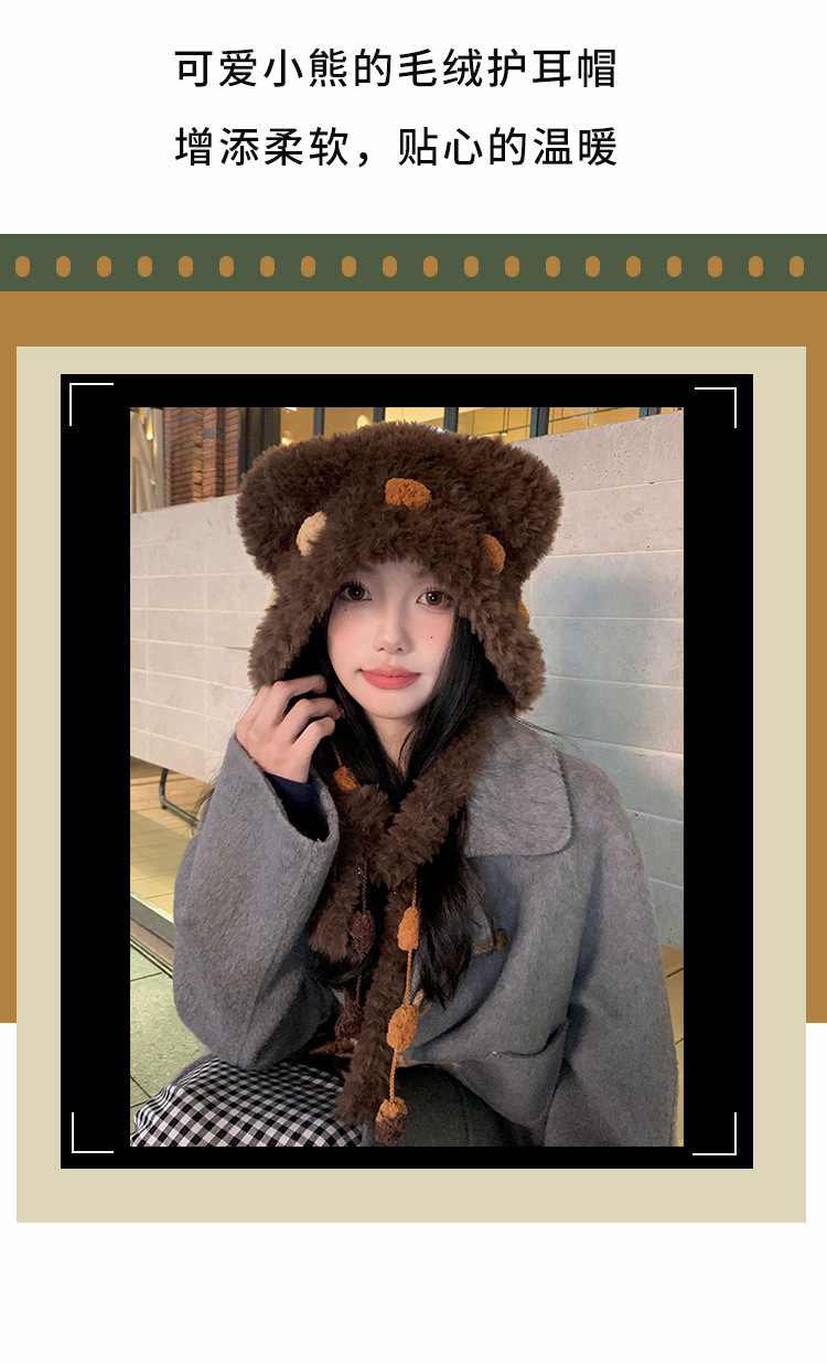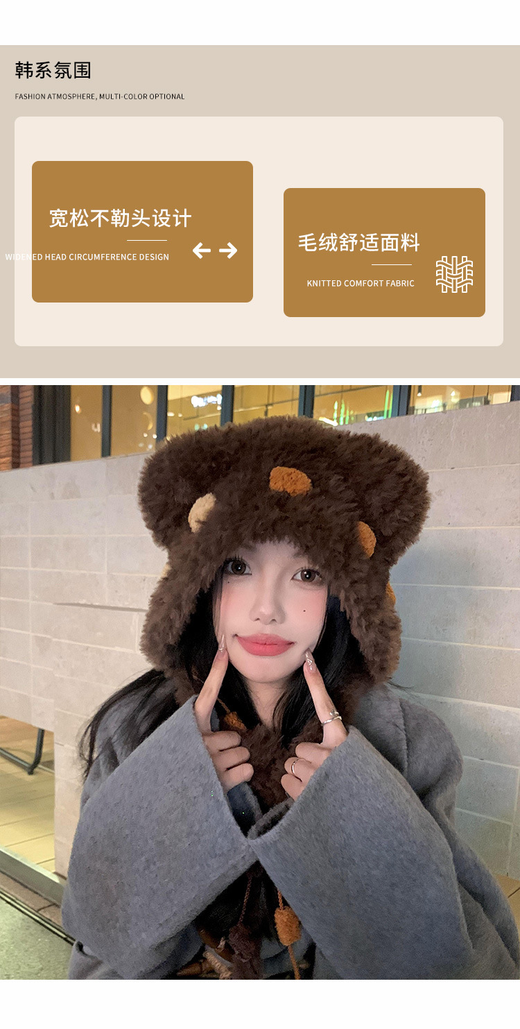 小熊耳朵毛绒针织帽女冬季可爱显脸小保暖护耳毛线帽防寒雷锋帽子
