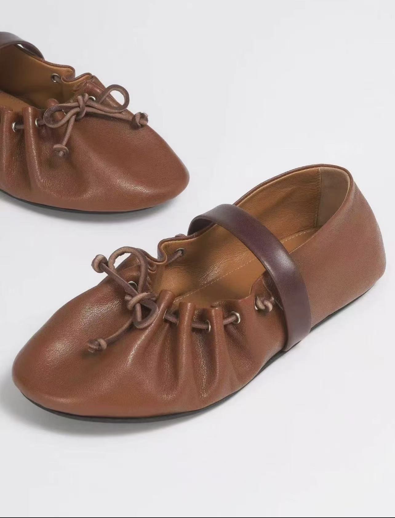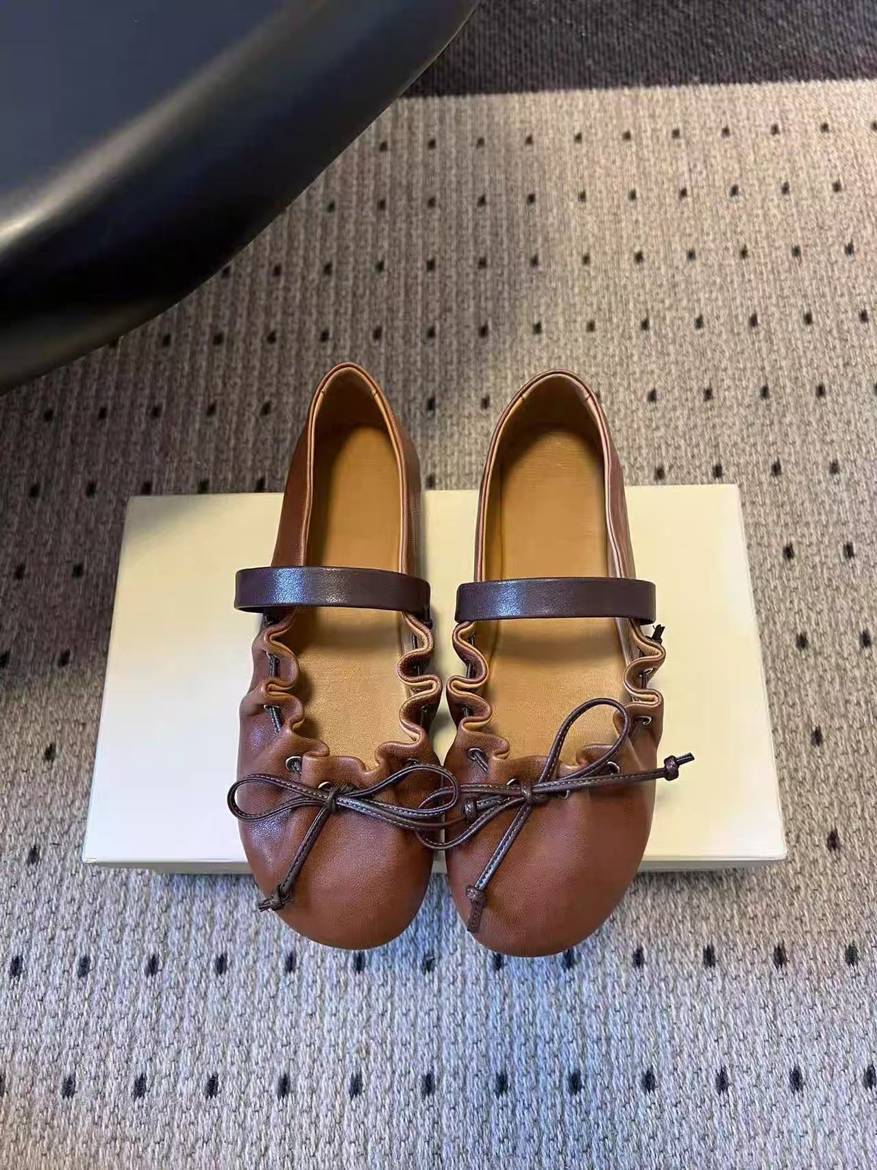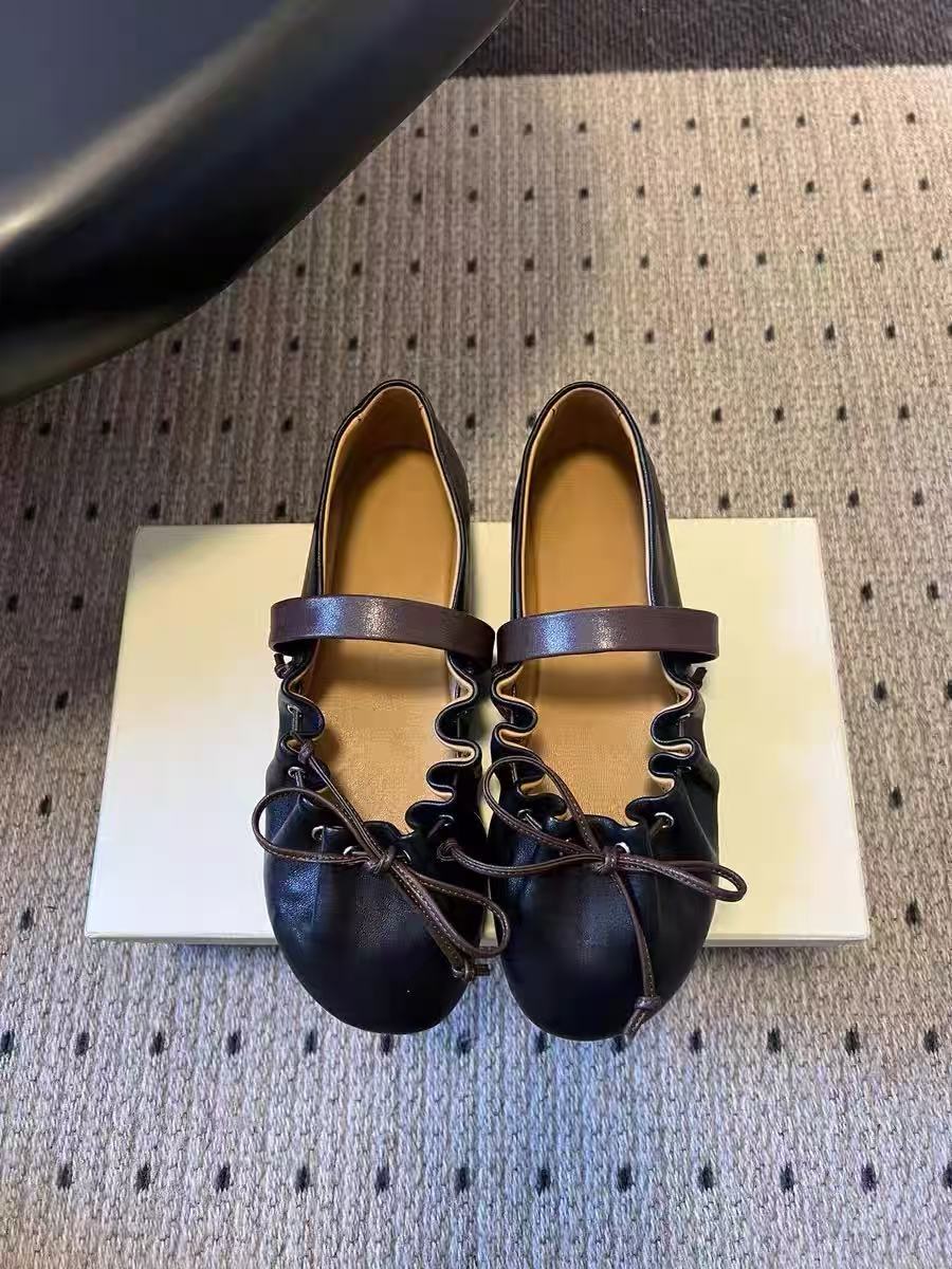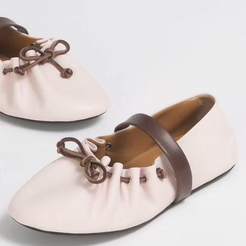 高版小众新款蝴蝶结芭蕾舞鞋女平底真皮褶皱可调一字带玛丽珍单鞋