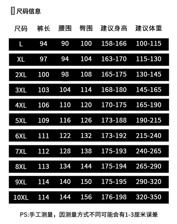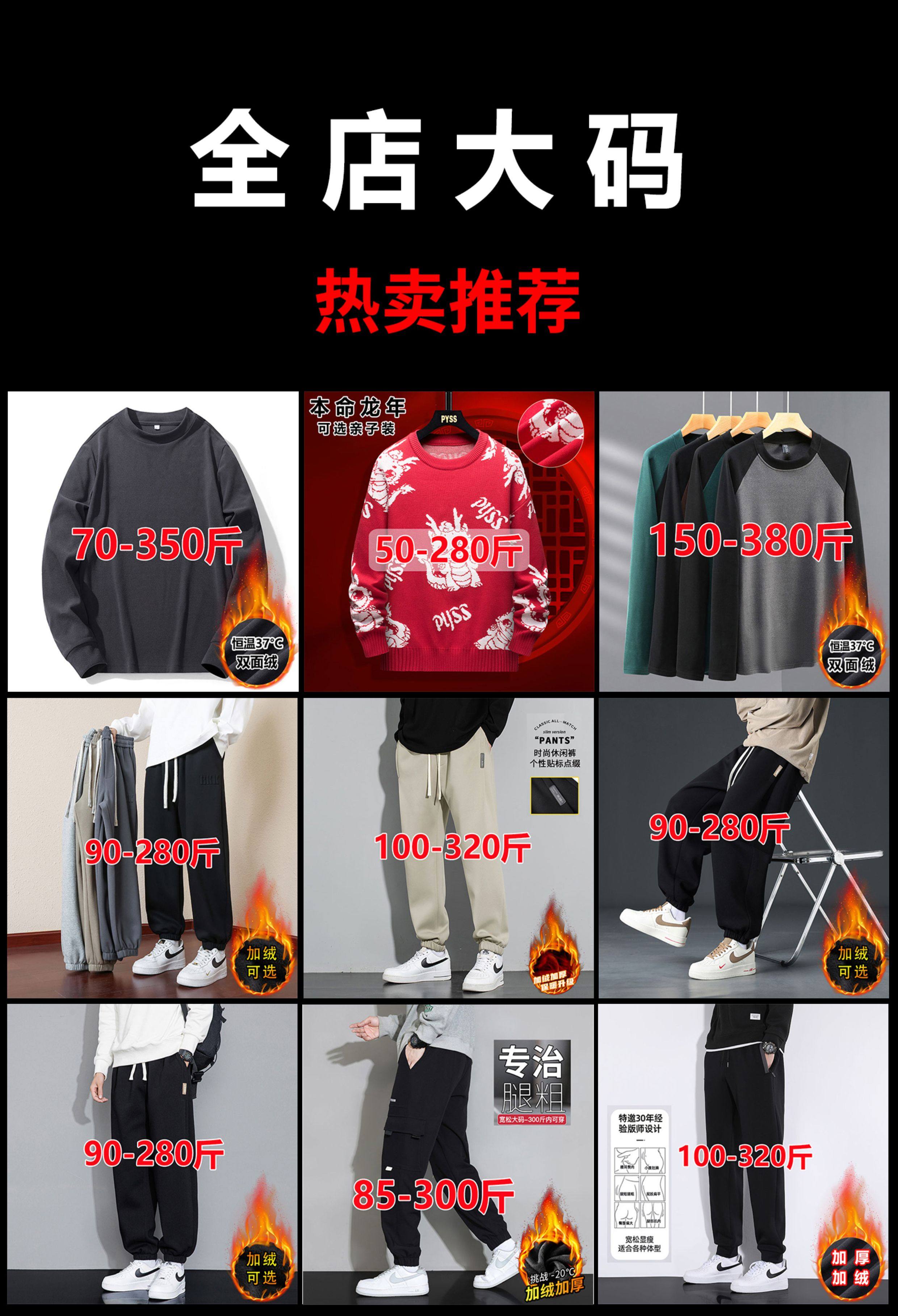| 颜色 | 黑色直筒常规款, 灰色直筒常规款, 咖色直筒常规款, 黑色束脚常规款, 灰色束脚常规款, 咖色束脚常规款, 黑色直角加绒款, 灰色直角加绒款, 咖色直角加绒款, 黑色束脚加绒款, 灰色束脚加绒款, 咖色束脚加绒款 | 尺码 | L【100-115斤】, XL【115-130斤】, XXL【130-145斤】, XXXL【145-165斤】, 4XL【165-190斤】, 5XL【190-215斤】, 6XL【215-240斤】, 7XL【240-265斤】, 8XL【265-290斤】, 9XL【290-320斤】, 10XL【320-350斤】 |