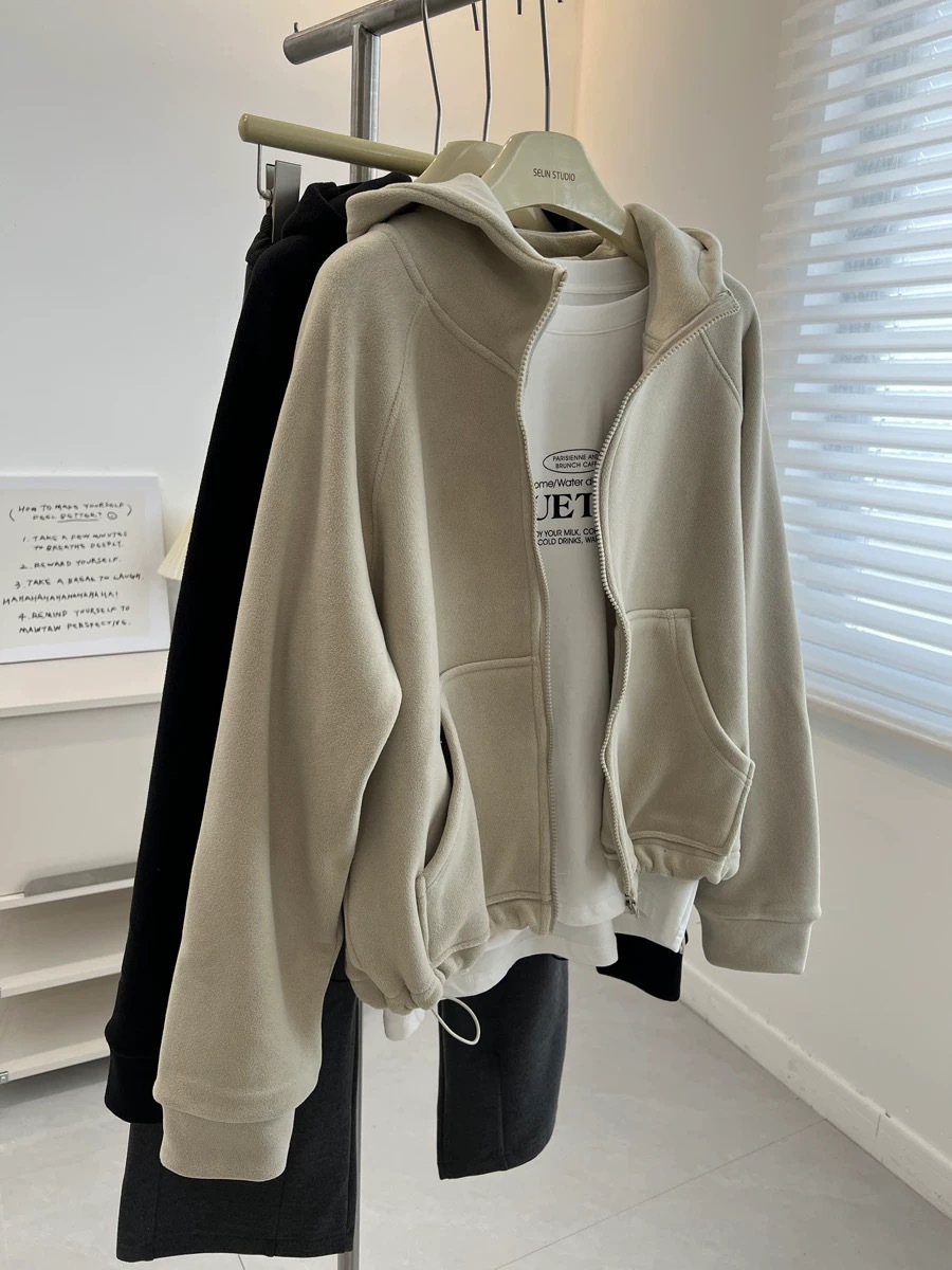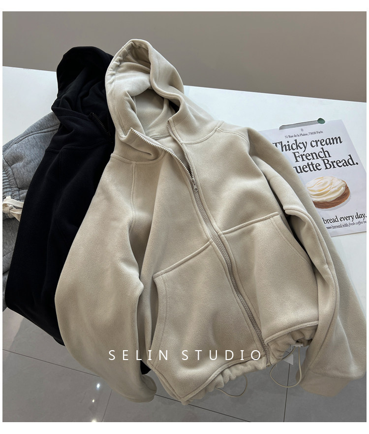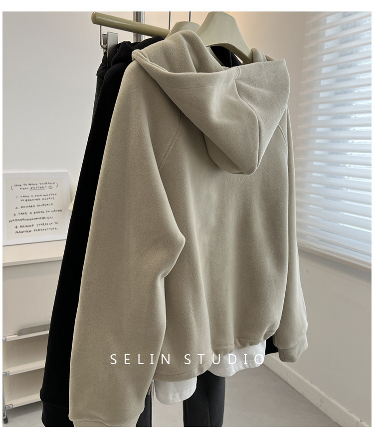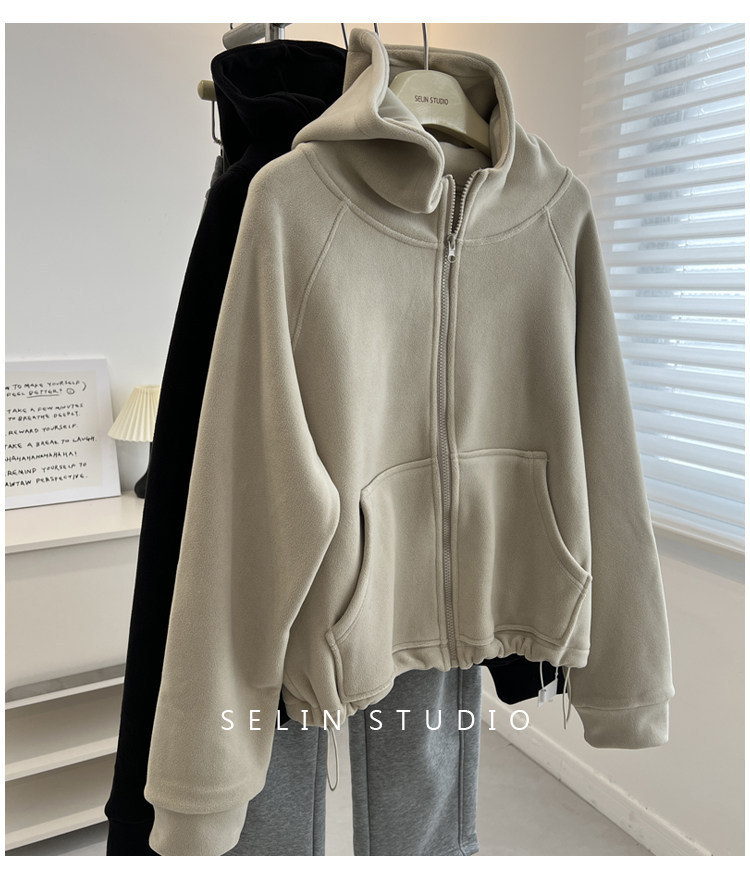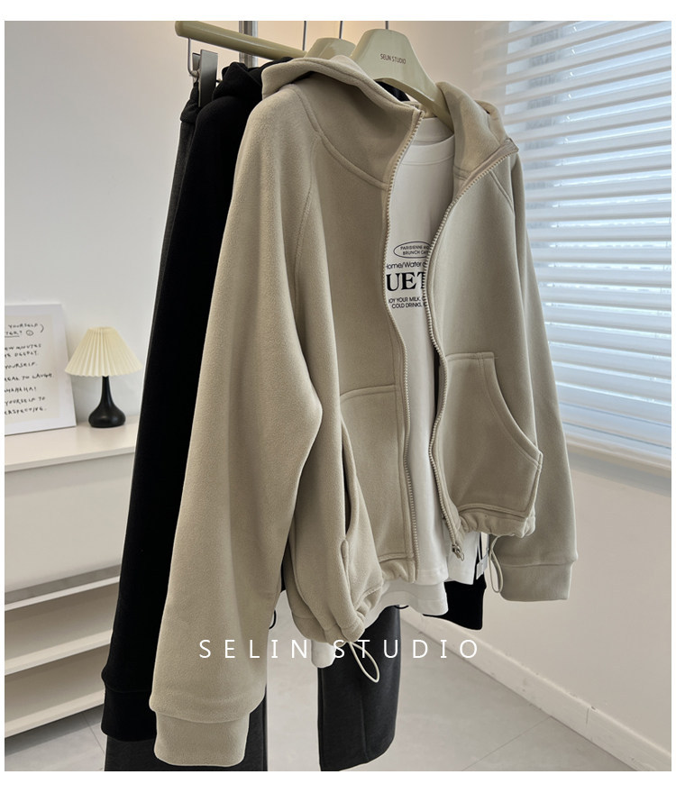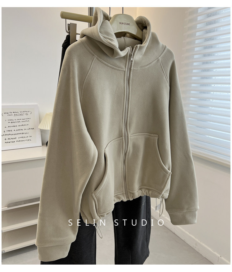 澳粒绒加大码240斤冬季纯色双面纯色开衫连帽卫衣女拉链休闲外套