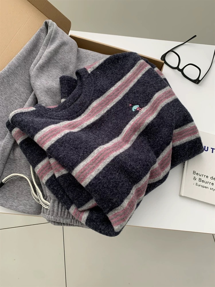 秋冬季加大码200斤厚实百搭休闲软糯撞色条纹T恤女刺绣打底衫