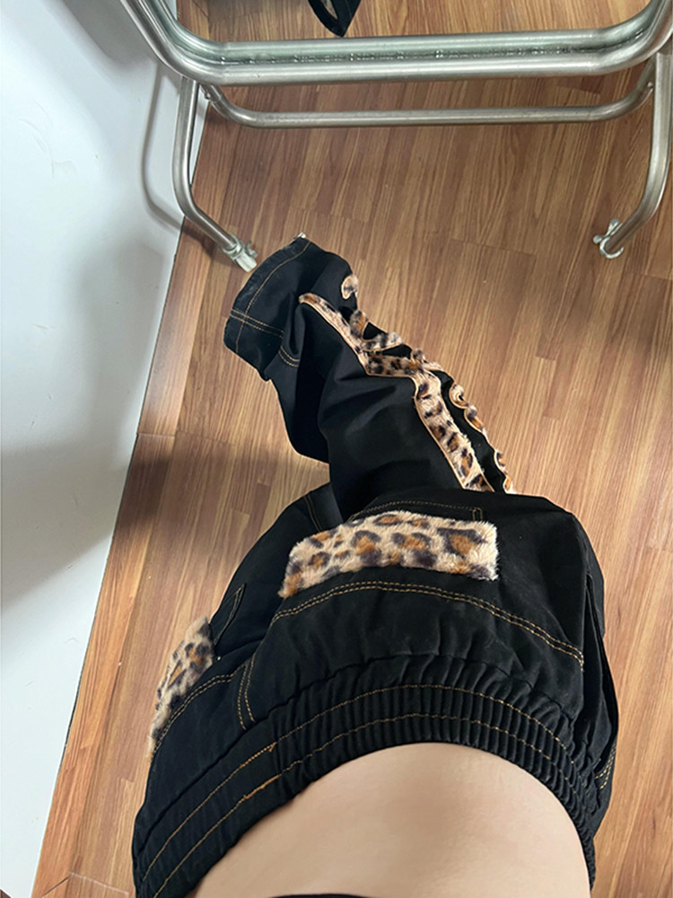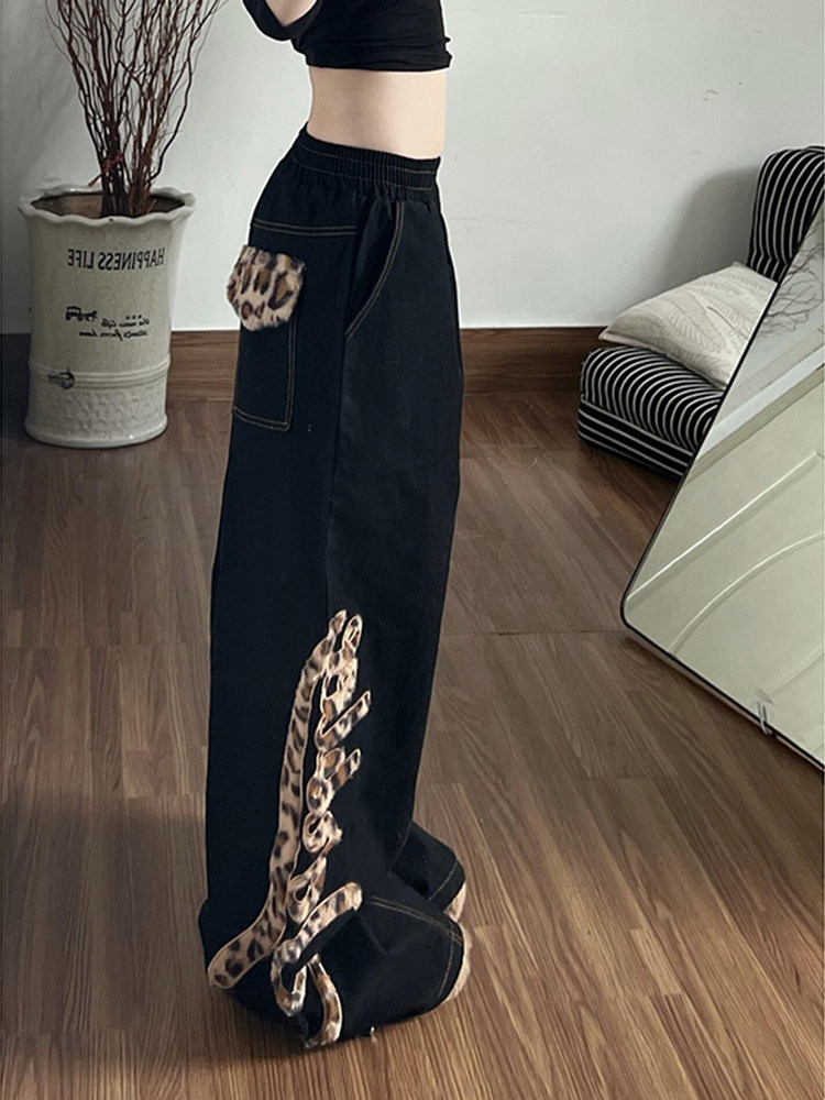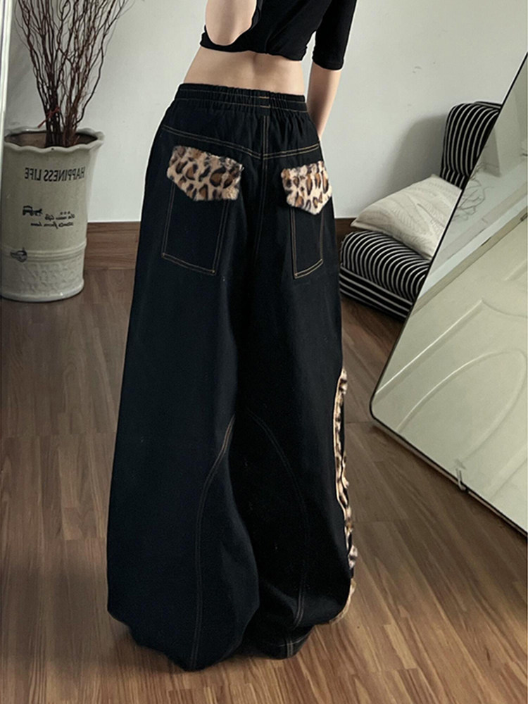 美式复古豹纹拼接弯刀牛仔裤女冬季2025新款低腰宽松直筒阔腿裤子