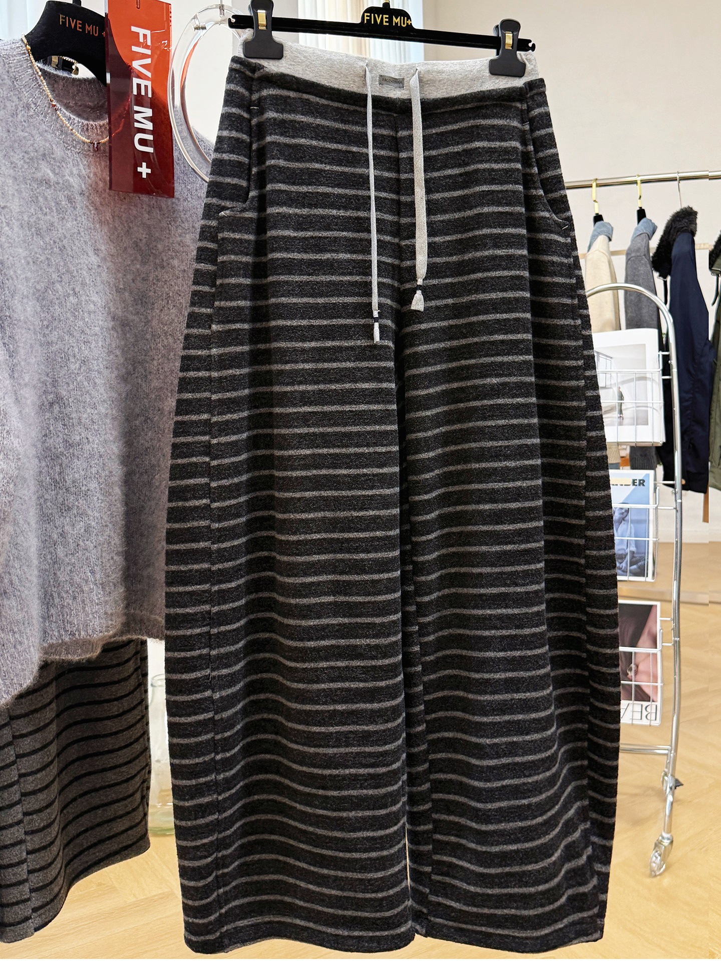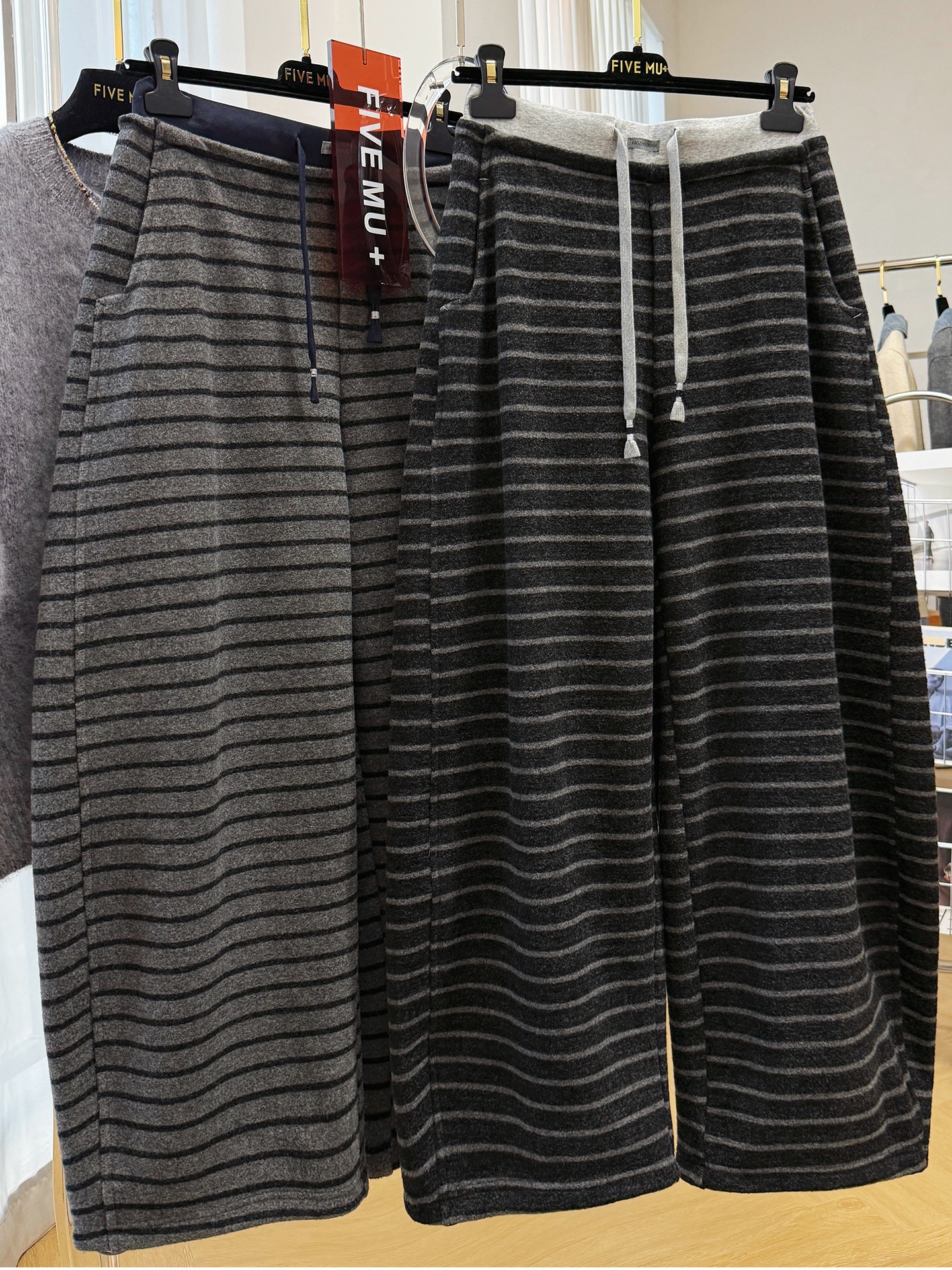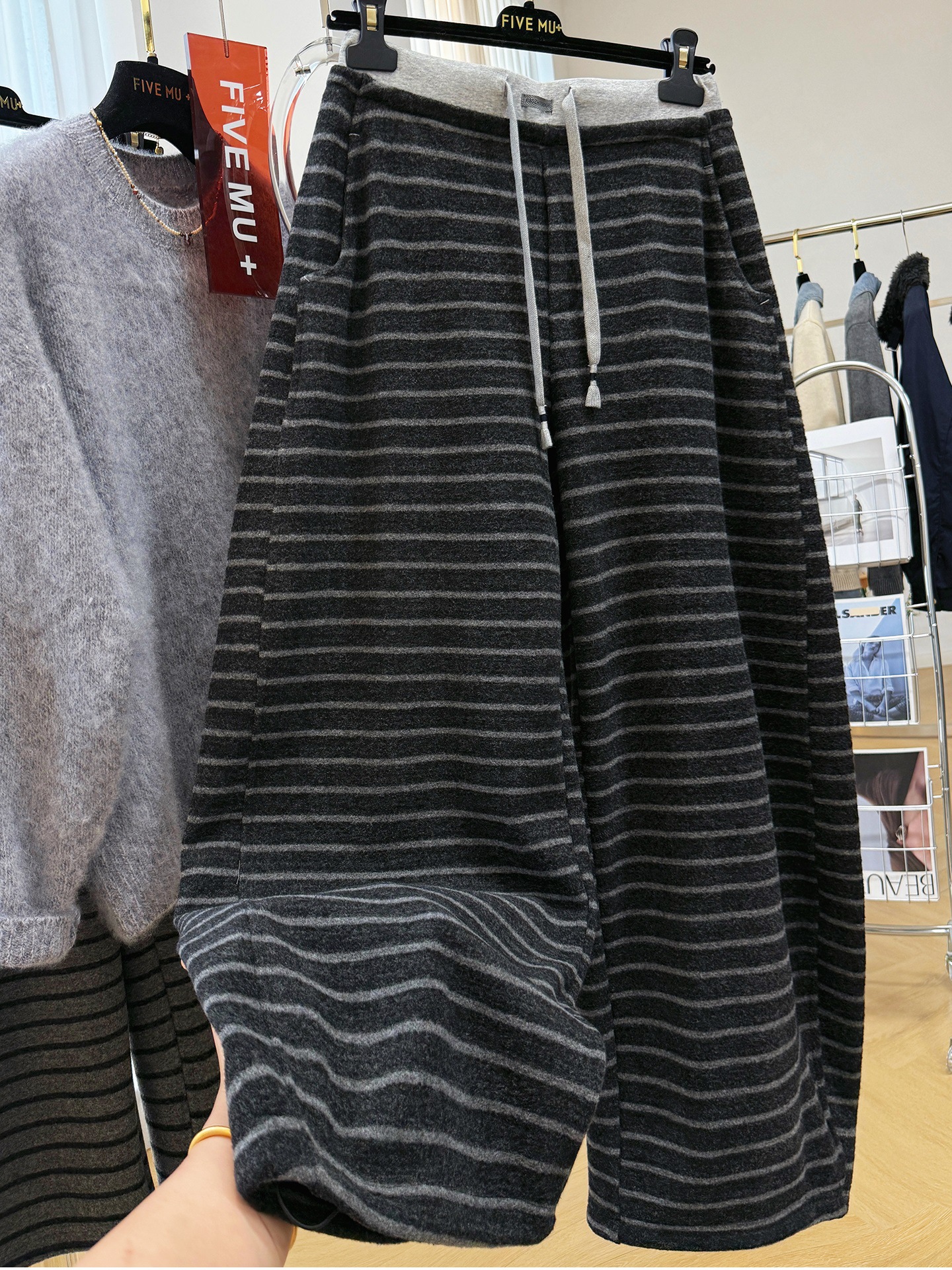 秋冬加大码200斤休闲百搭加绒松紧腰条纹裤弯刀裤松弛感宽松卫裤