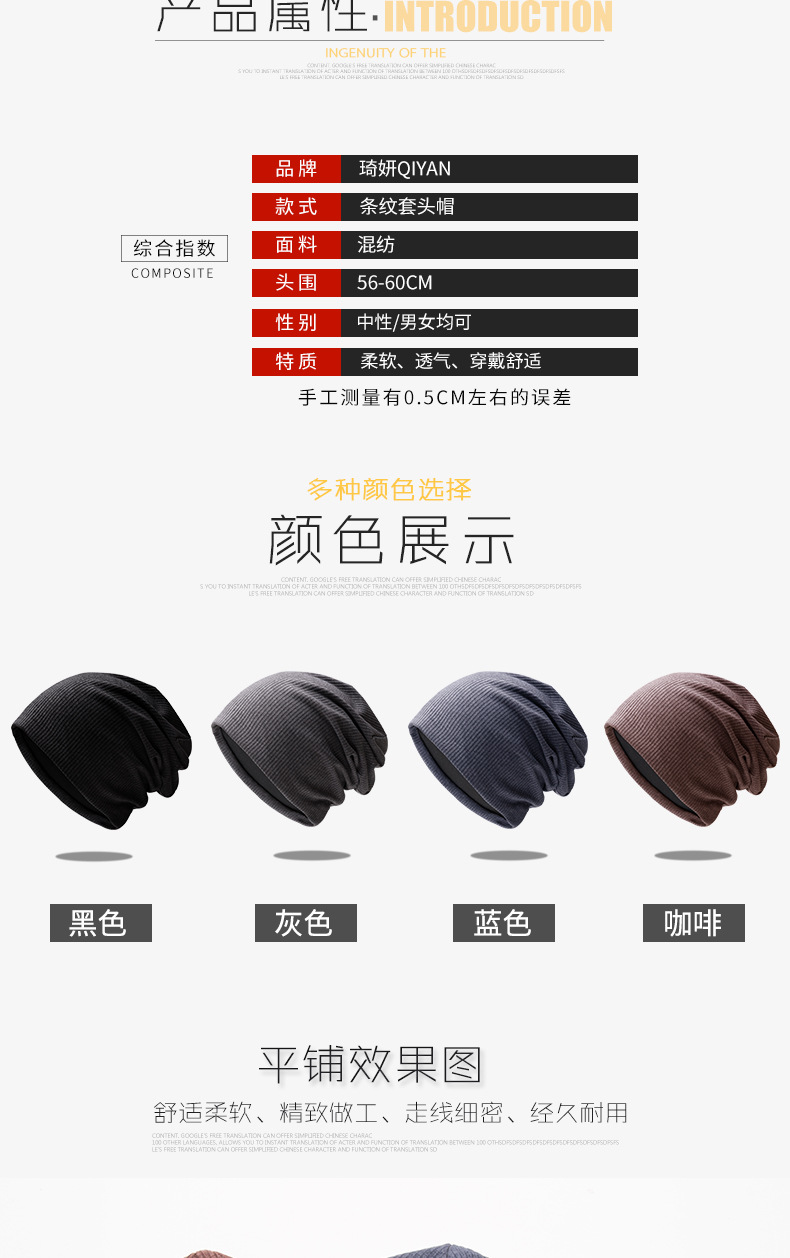| 帽檐款式 | 无檐 | 颜色 | 蓝色, 黑色, 灰色, 咖啡色, 薄款蓝色, 薄款黑色, 薄款灰色, 薄款咖啡色 |
