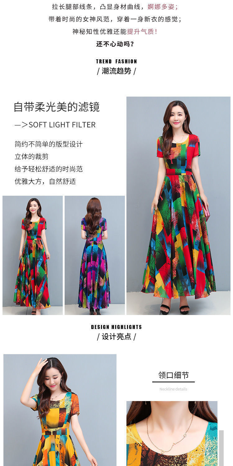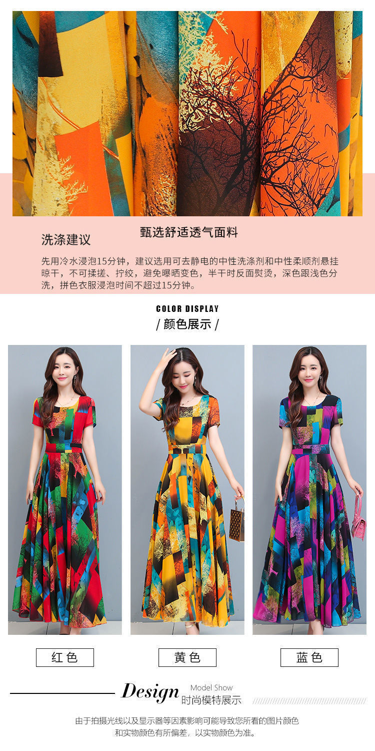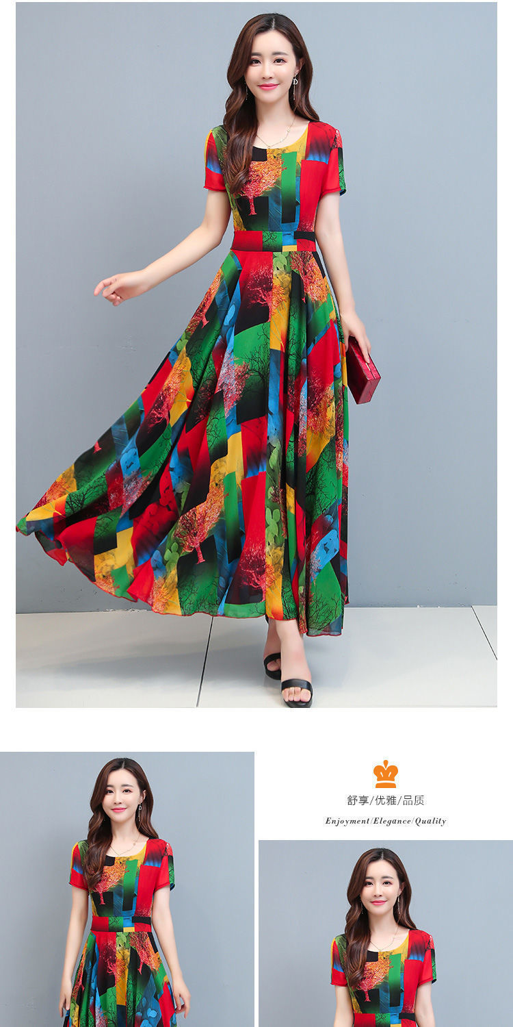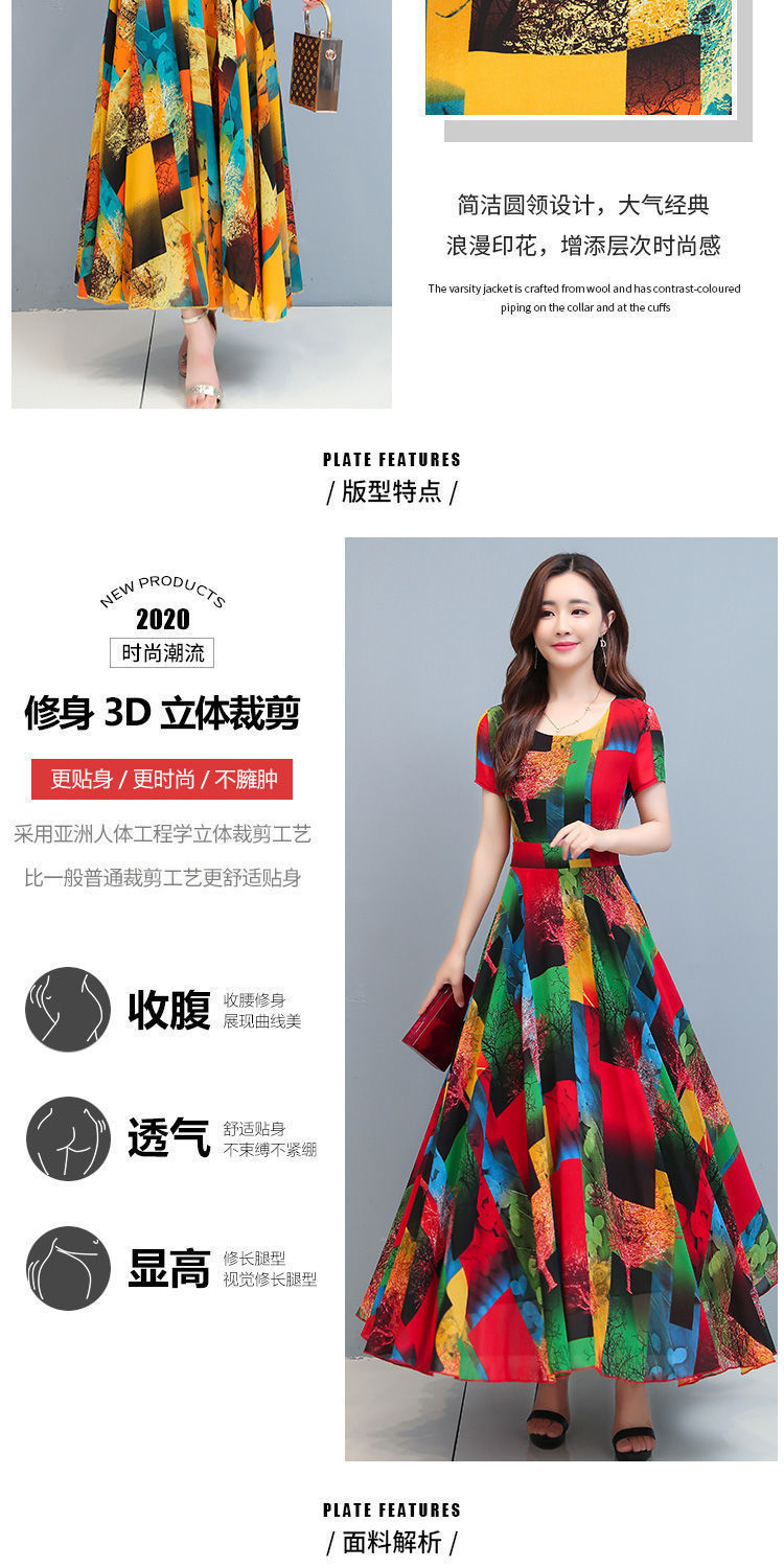 인쇄 된 여름 둥근 목 짧은 소매 대외 무역 꽃 스커트 어머니의 원피스 단단한 허리 플러스 사이즈 우아한 큰 스윙 스커트 인쇄 원피스