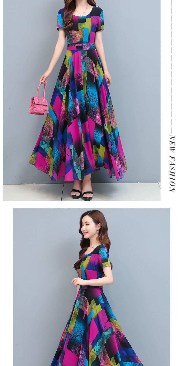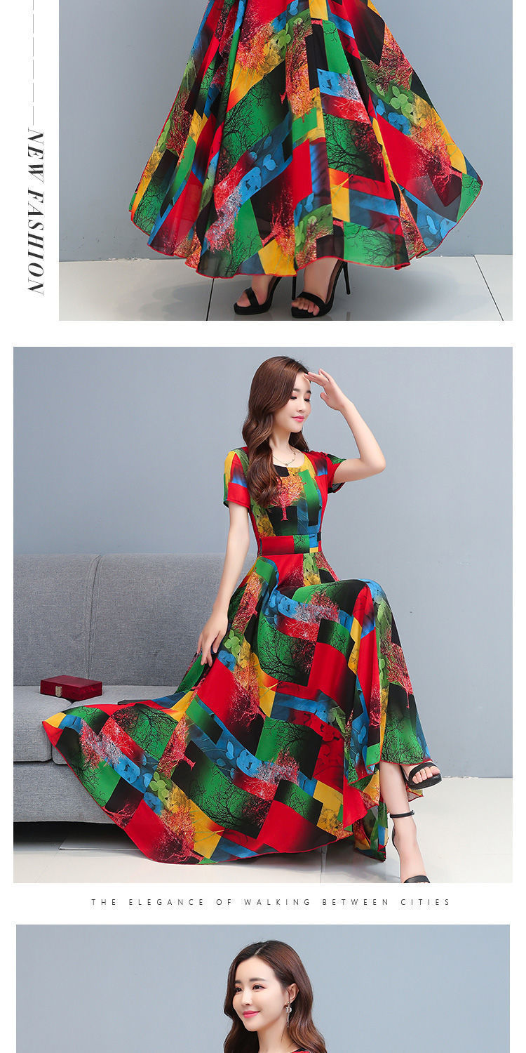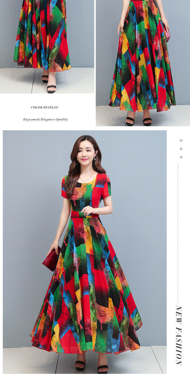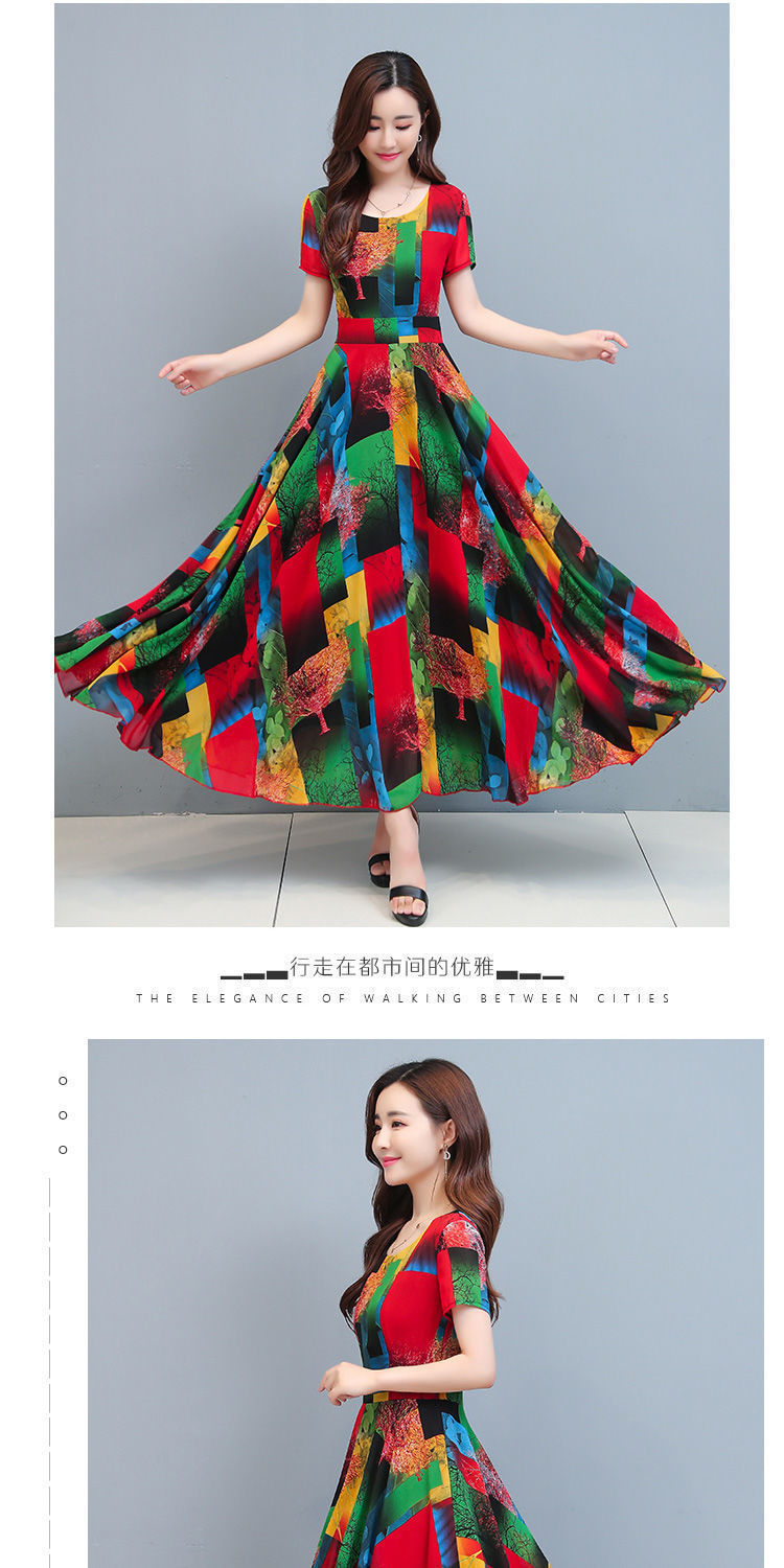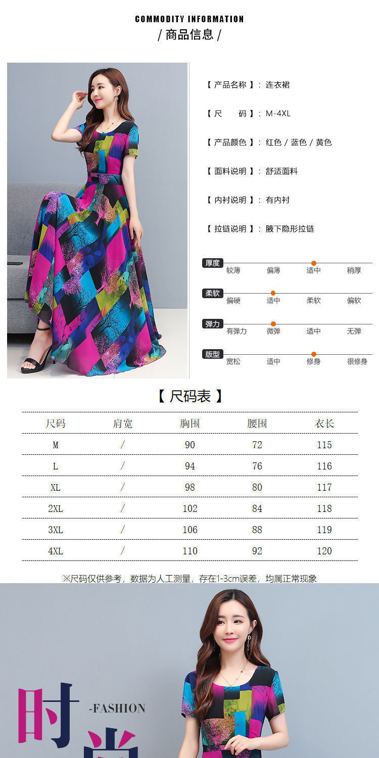 인쇄 된 여름 둥근 목 짧은 소매 대외 무역 꽃 스커트 어머니의 원피스 단단한 허리 플러스 사이즈 우아한 큰 스윙 스커트 인쇄 원피스