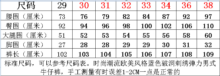 | 颜色 | 靛蓝 | 尺码 | 29, 30, 31, 32, 33, 34, 36, 38 |