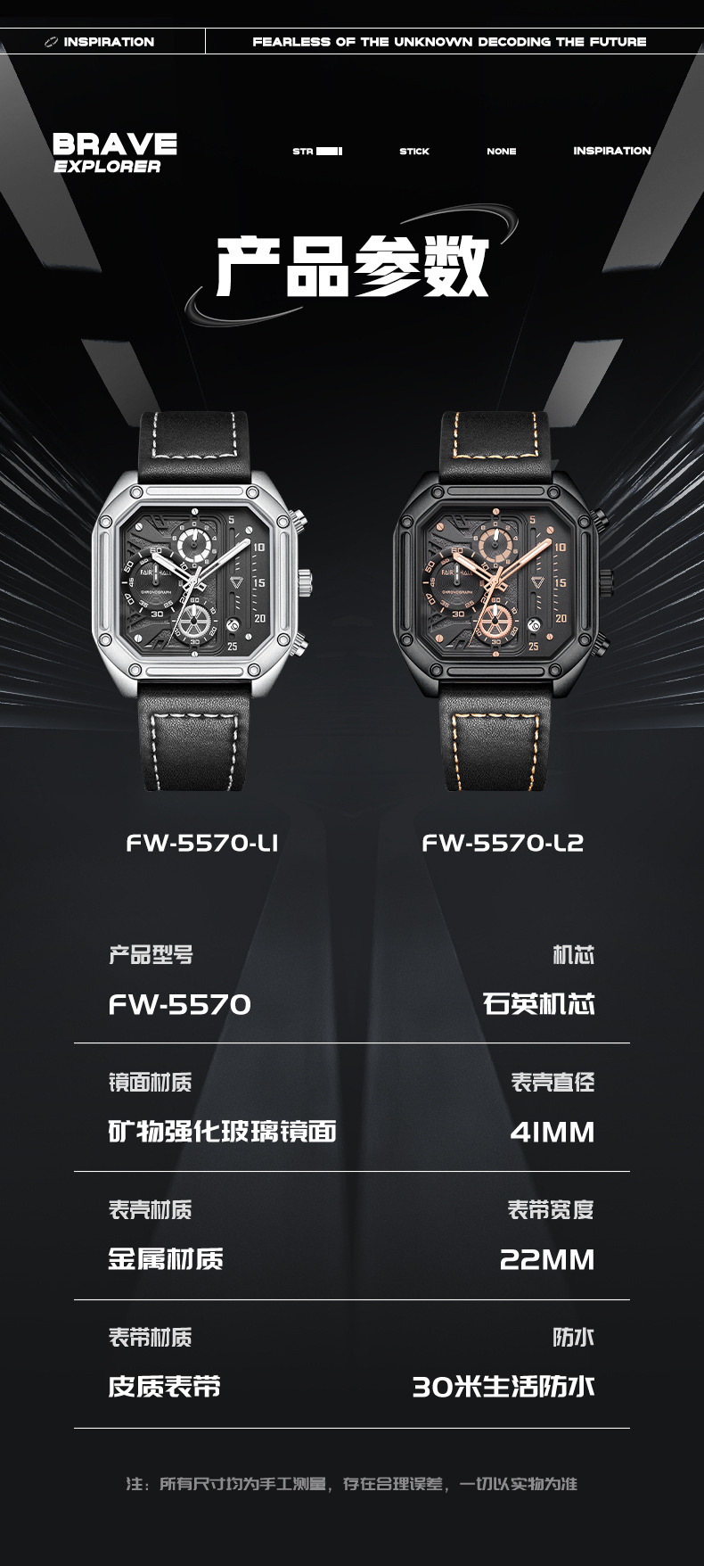 | 主要下游平台 | ebay, 亚马逊, wish, 速卖通, 独立站, LAZADA | 颜色 | FW-5570-L1银壳黑面黑色皮带, FW-5570-L2黑壳黑面黑色皮带 |