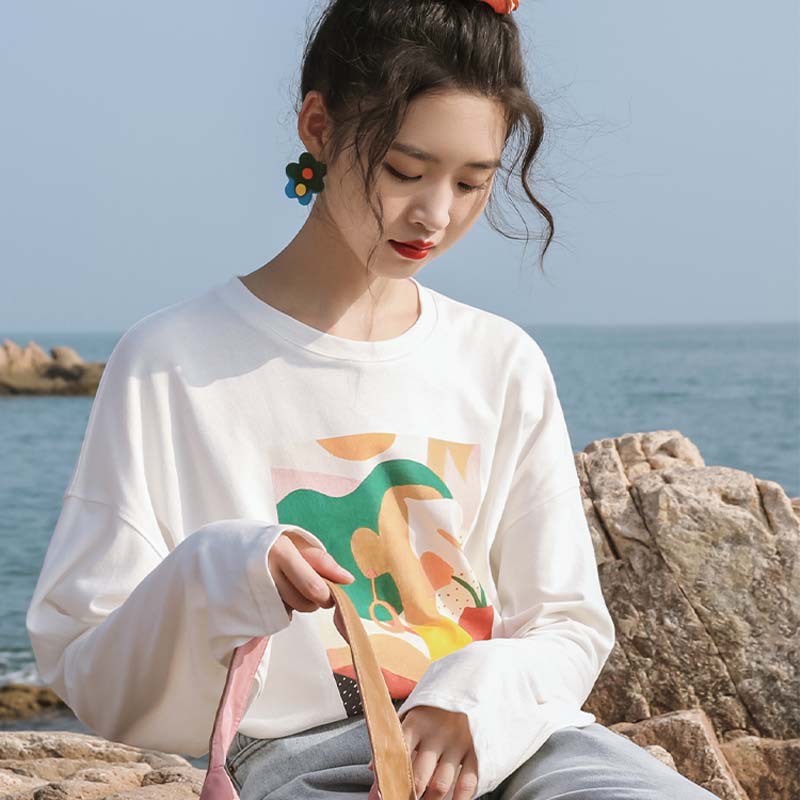 캐주얼 퓨어 코튼 유화 프린트 티셔츠 여성용 루즈한 한국식 올매치 화이트 라운드넥 긴팔 언더셔츠 in 트렌디