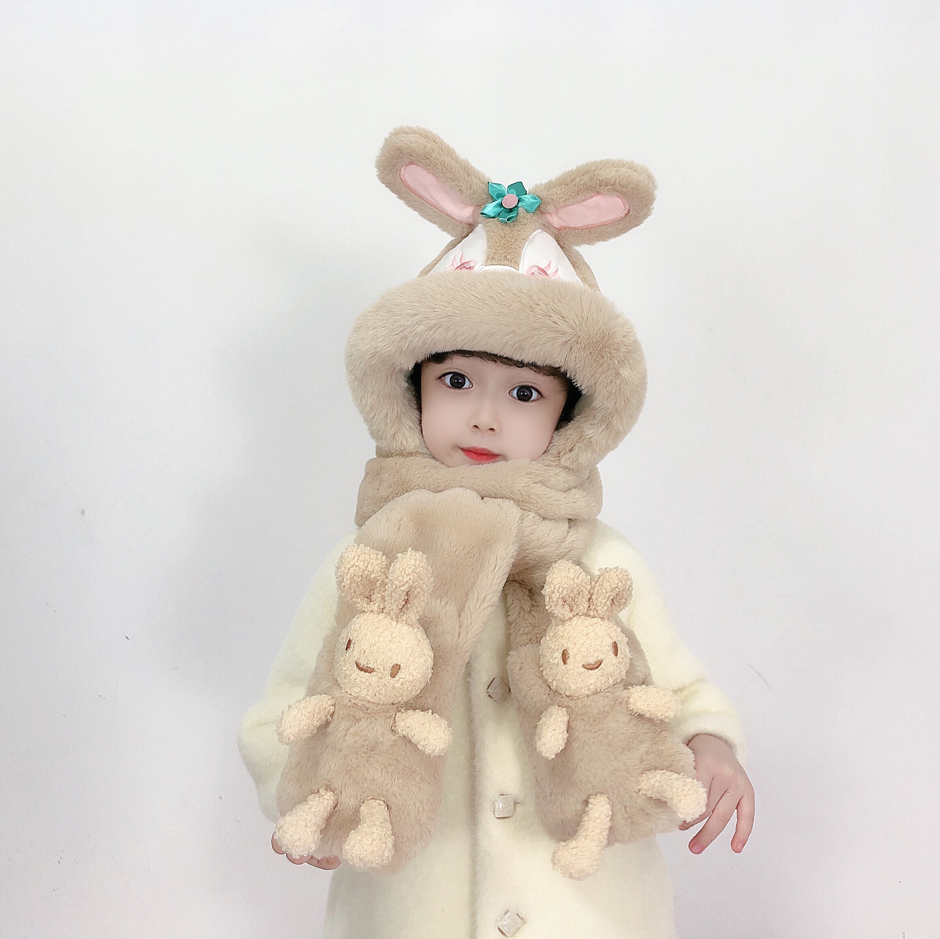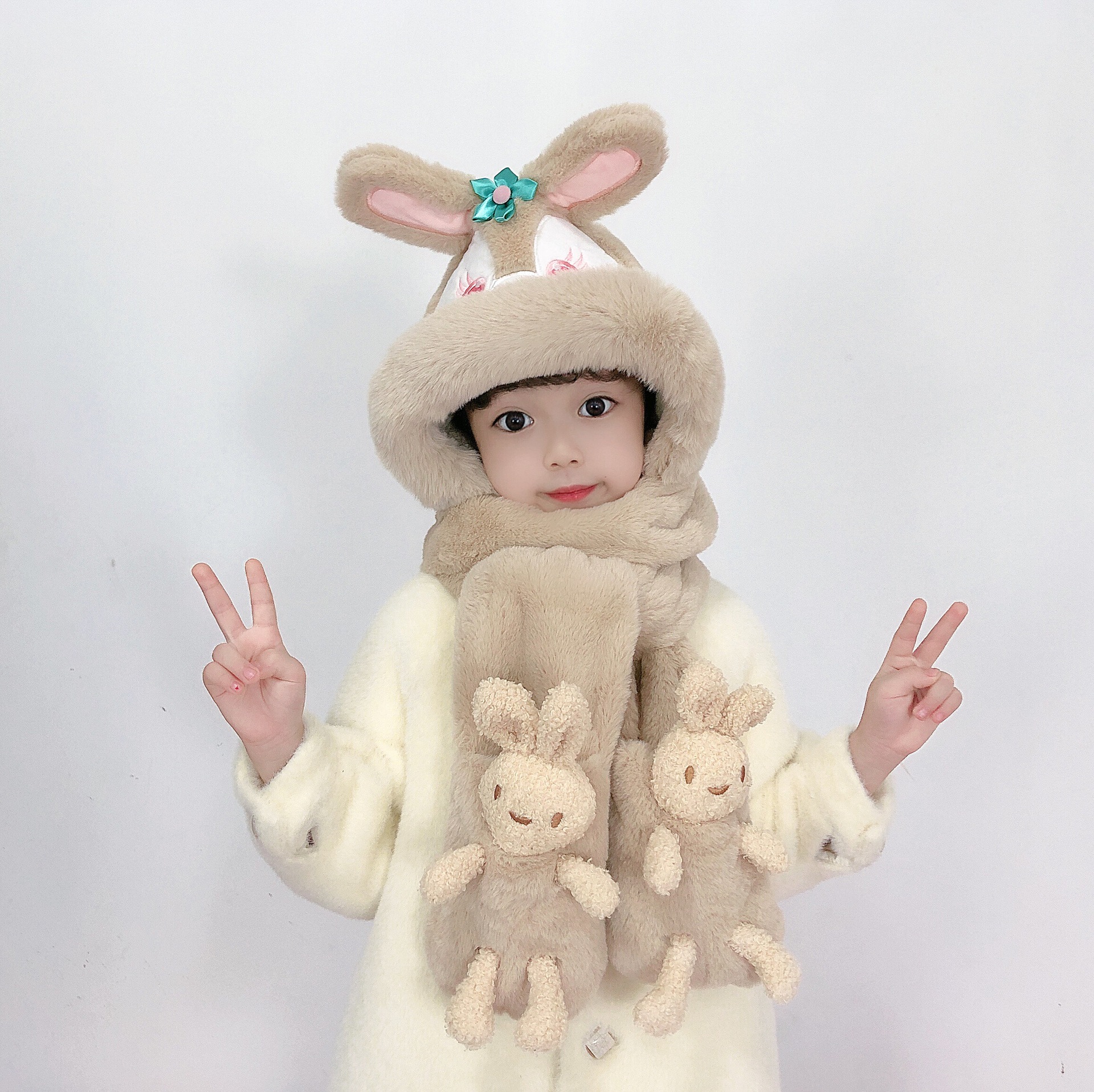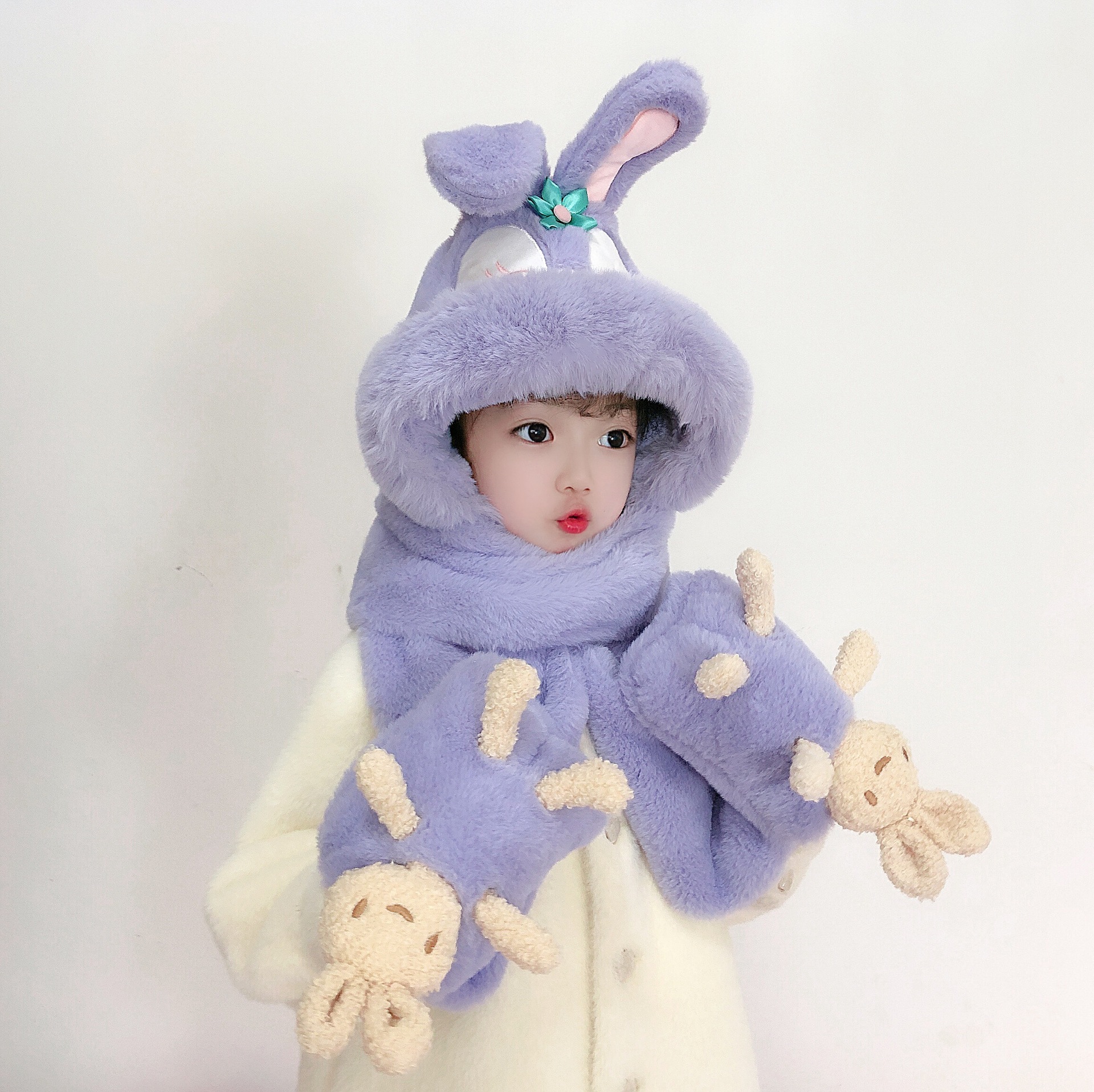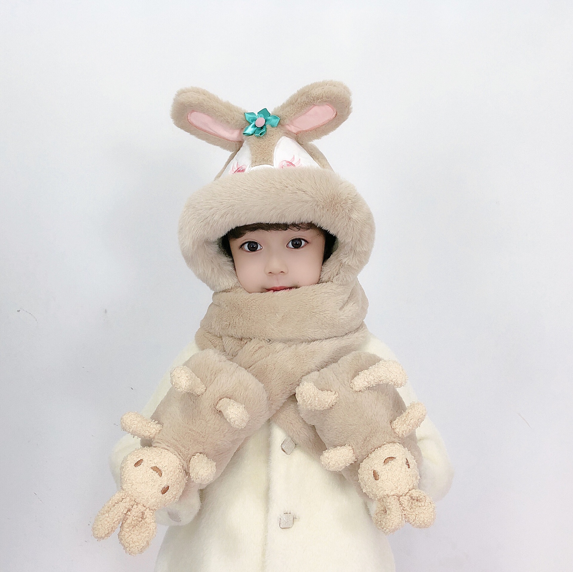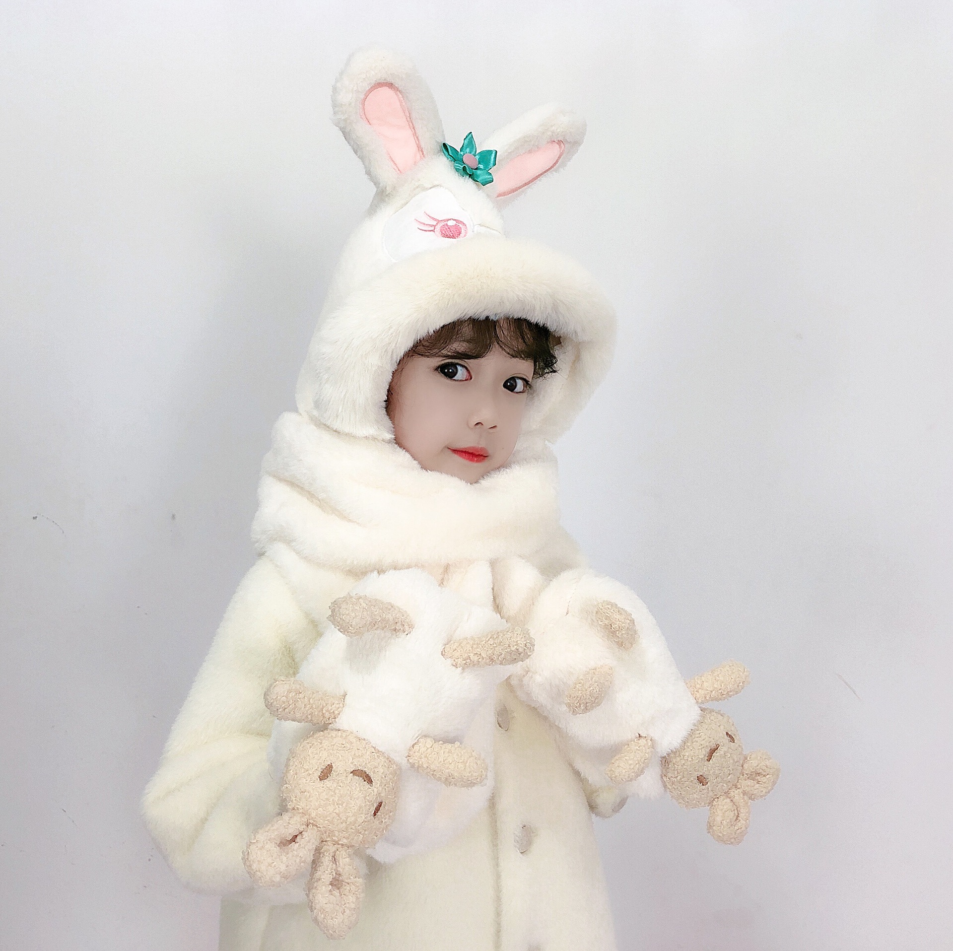 가을과 겨울 새로운 만화 토끼 귀 어린이 모자 여자 모자 스카프 장갑 3 피스 세트 두꺼운 원피스 모자