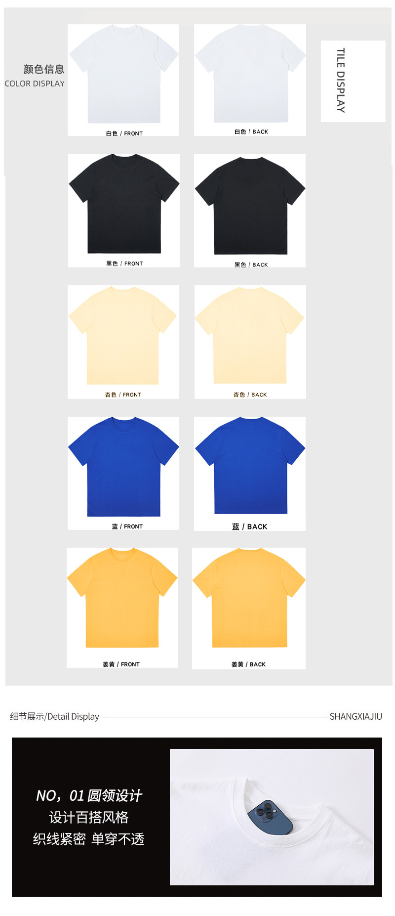 | 颜色 | 白色 短袖 220g棉, 黑色 短袖 220g棉, 莱茵蓝 短袖 220g棉, 杏 短袖 220g棉, 鲜黄 短袖 220g棉 | 尺码 | S, M, L, XL, XXL |