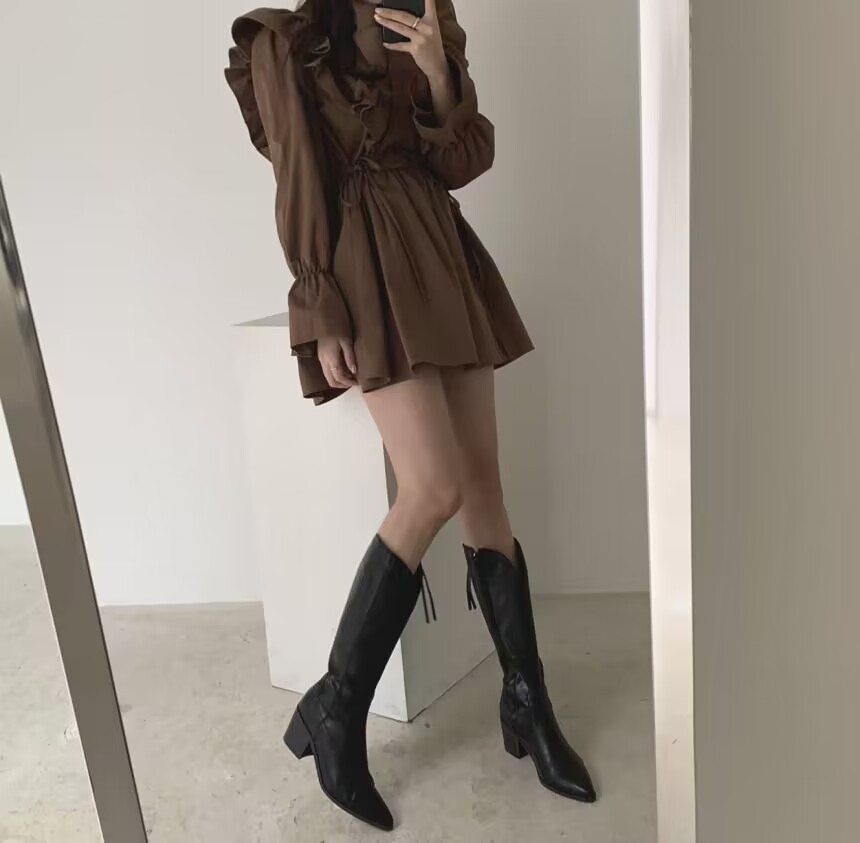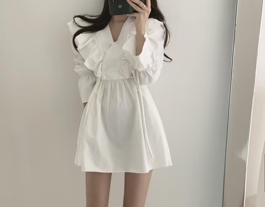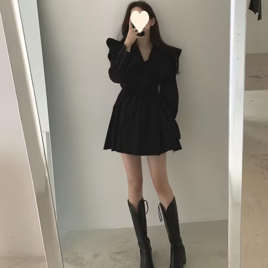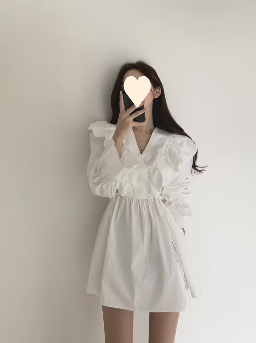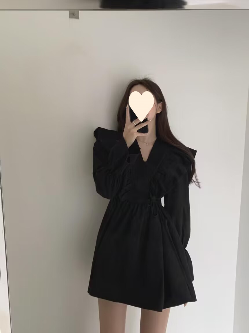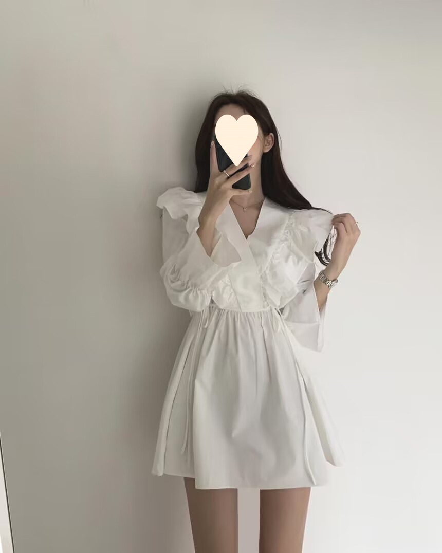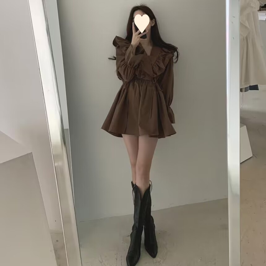 2025년 신상 초가을 복고풍 브이넥 크로스 러플 레이스 업 허리 벨 슬리브 쇼트 스몰 드레스