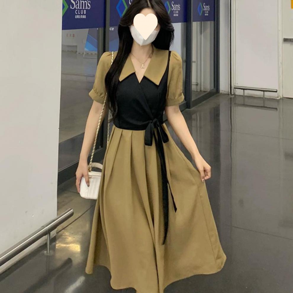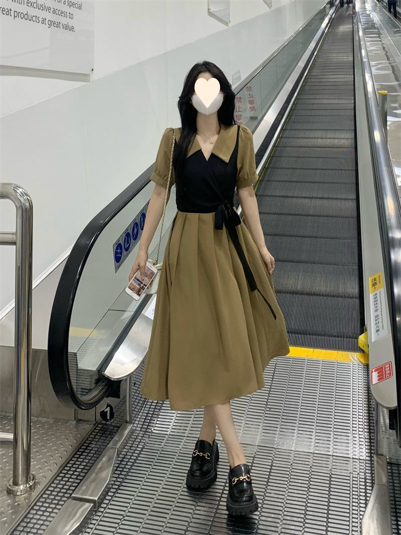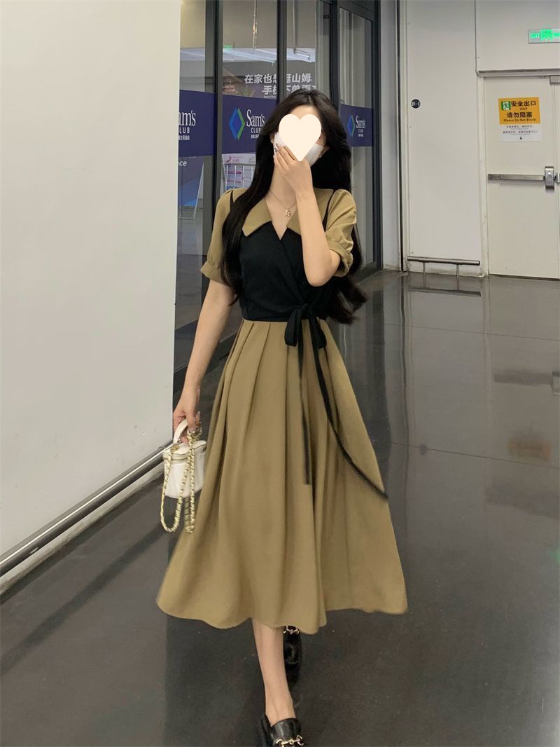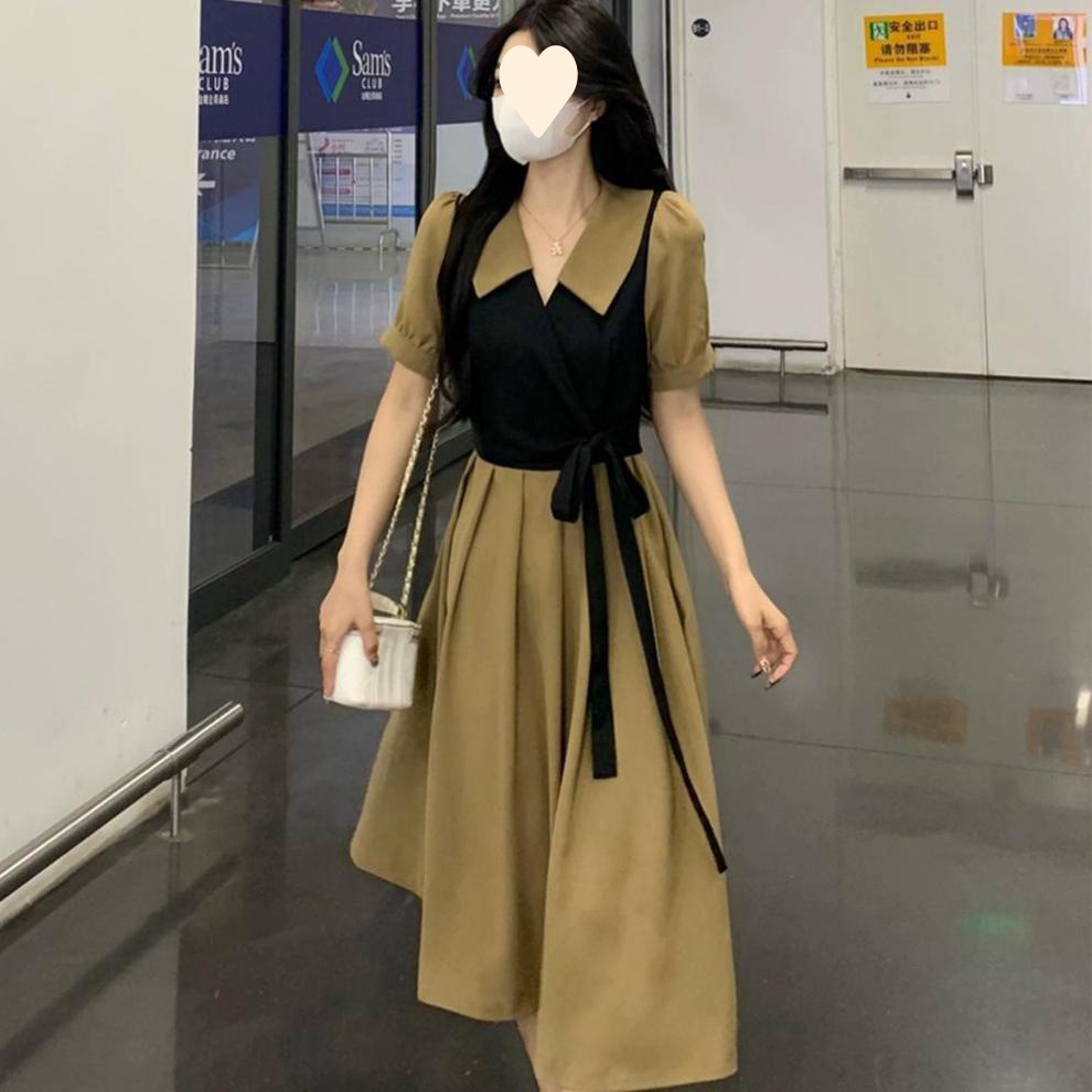 플러스 사이즈 차 휴식 프랑스어 복고풍 가짜 투피스 원피스 여성의 여름 약간의 슬리밍 스커트 질감 고급 미디 원피스