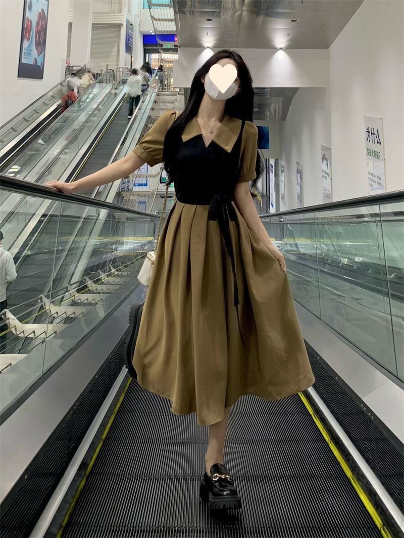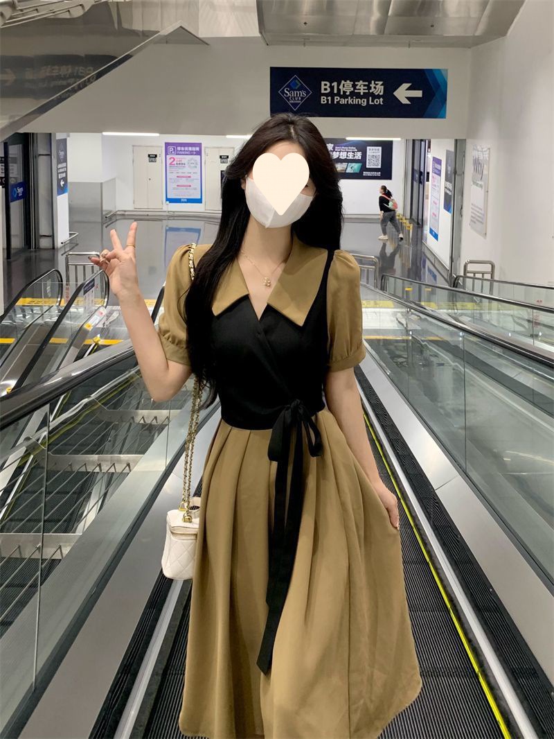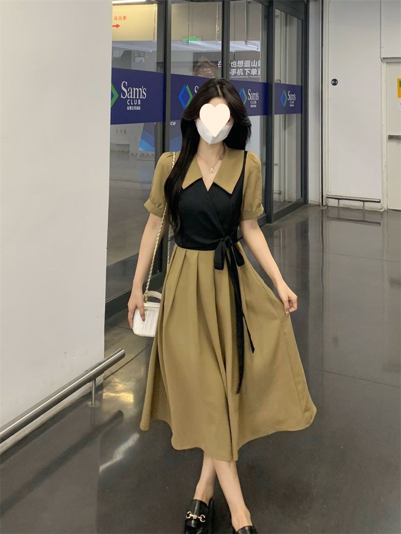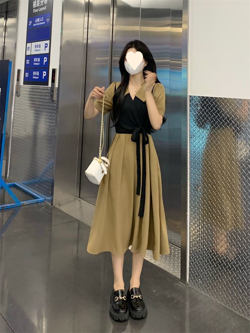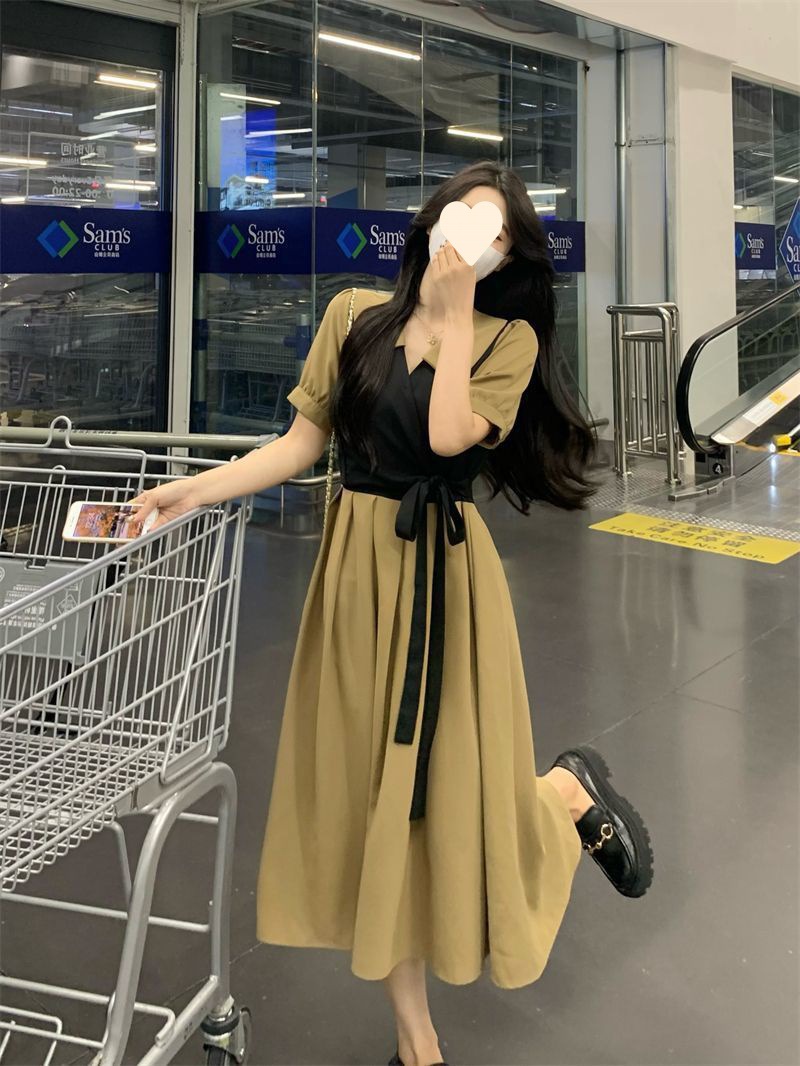 플러스 사이즈 차 휴식 프랑스어 복고풍 가짜 투피스 원피스 여성의 여름 약간의 슬리밍 스커트 질감 고급 미디 원피스