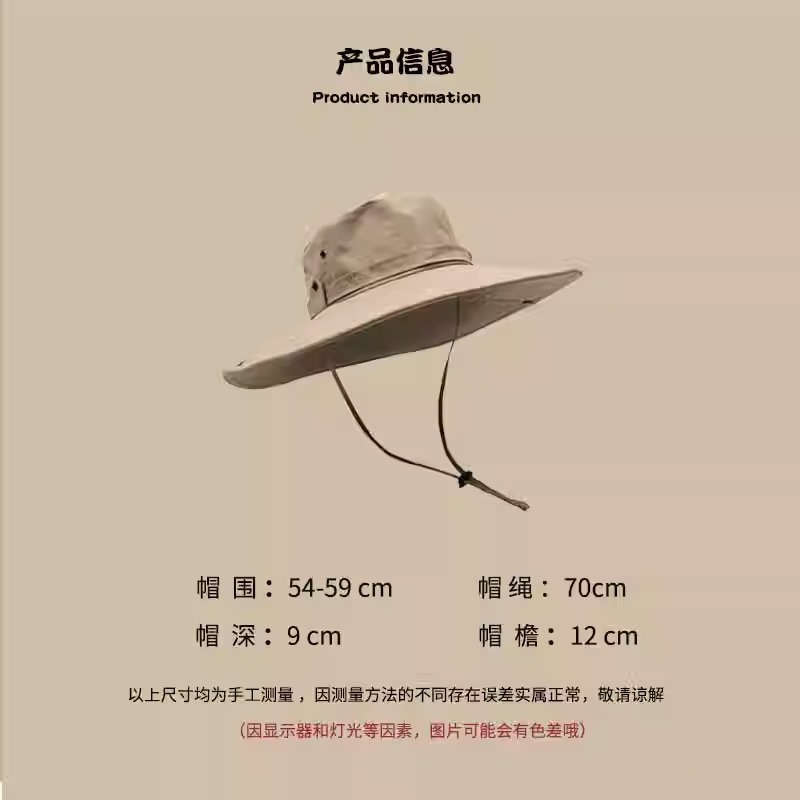 | 帽檐款式 | 大檐 | 颜色 | 户外大帽檐12cm-黑色, 户外大帽檐12cm-粉色, 户外大帽檐12cm-藏青色, 户外大帽檐12cm-军绿色, 户外大帽檐12cm-咖啡色, 户外大帽檐12cm-灰色, 户外大帽檐12cm-卡其 |