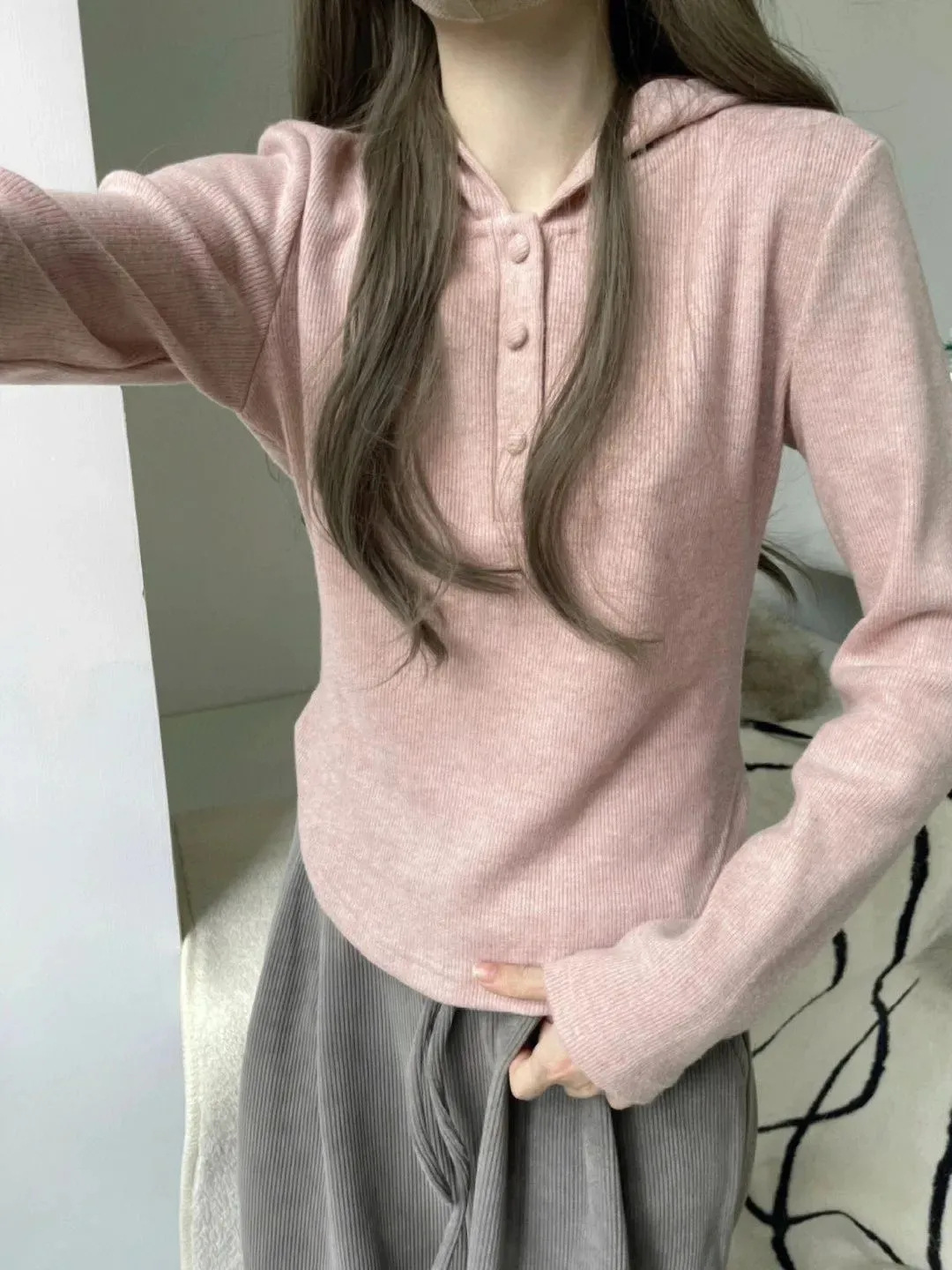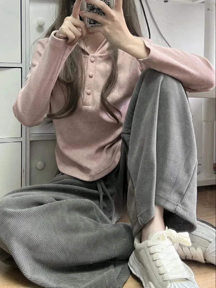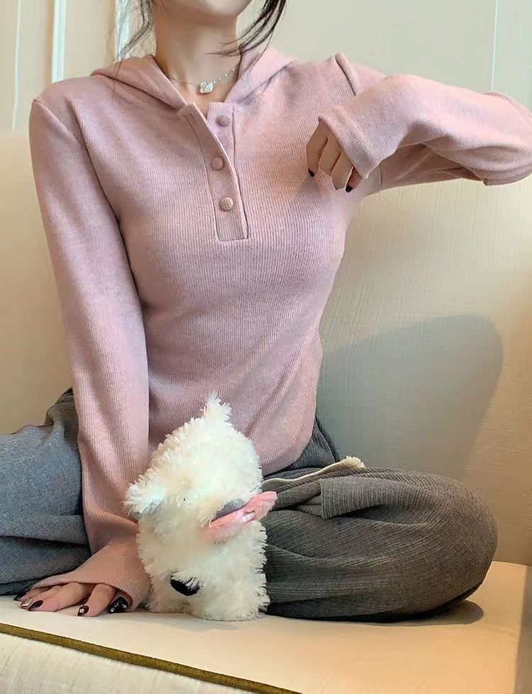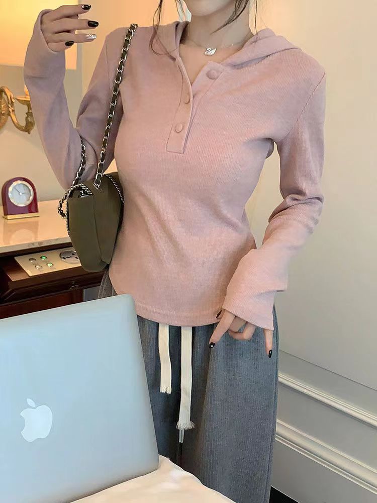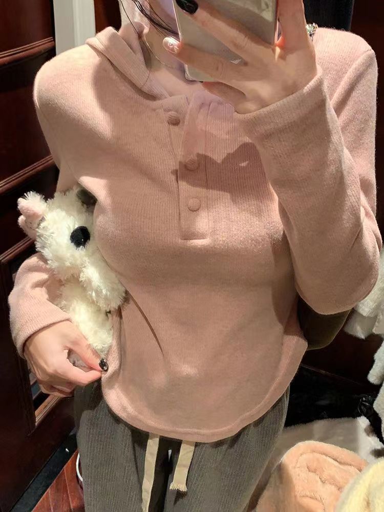 숄더 후드 긴팔 티셔츠 순수한 욕망 스타일의 여성용 짧은 봄과 가을 내부 셔츠 불규칙한 베이스 셔츠 슬림핏 티셔츠 얇은 티셔츠