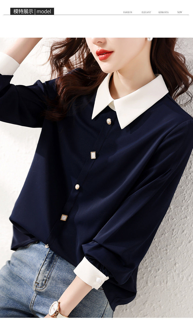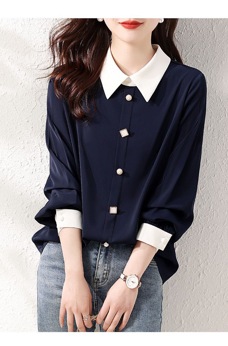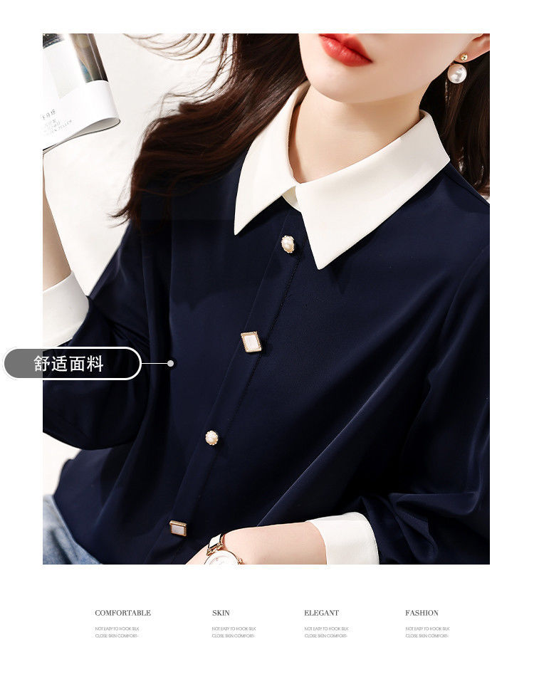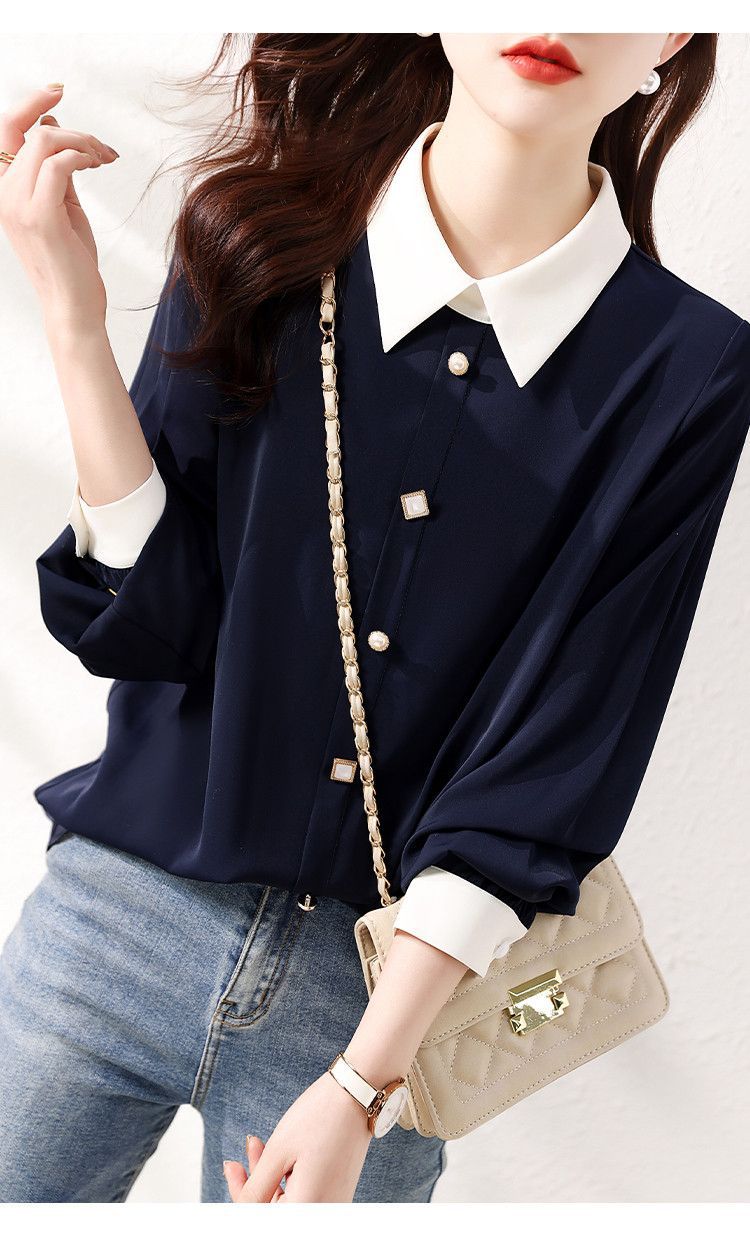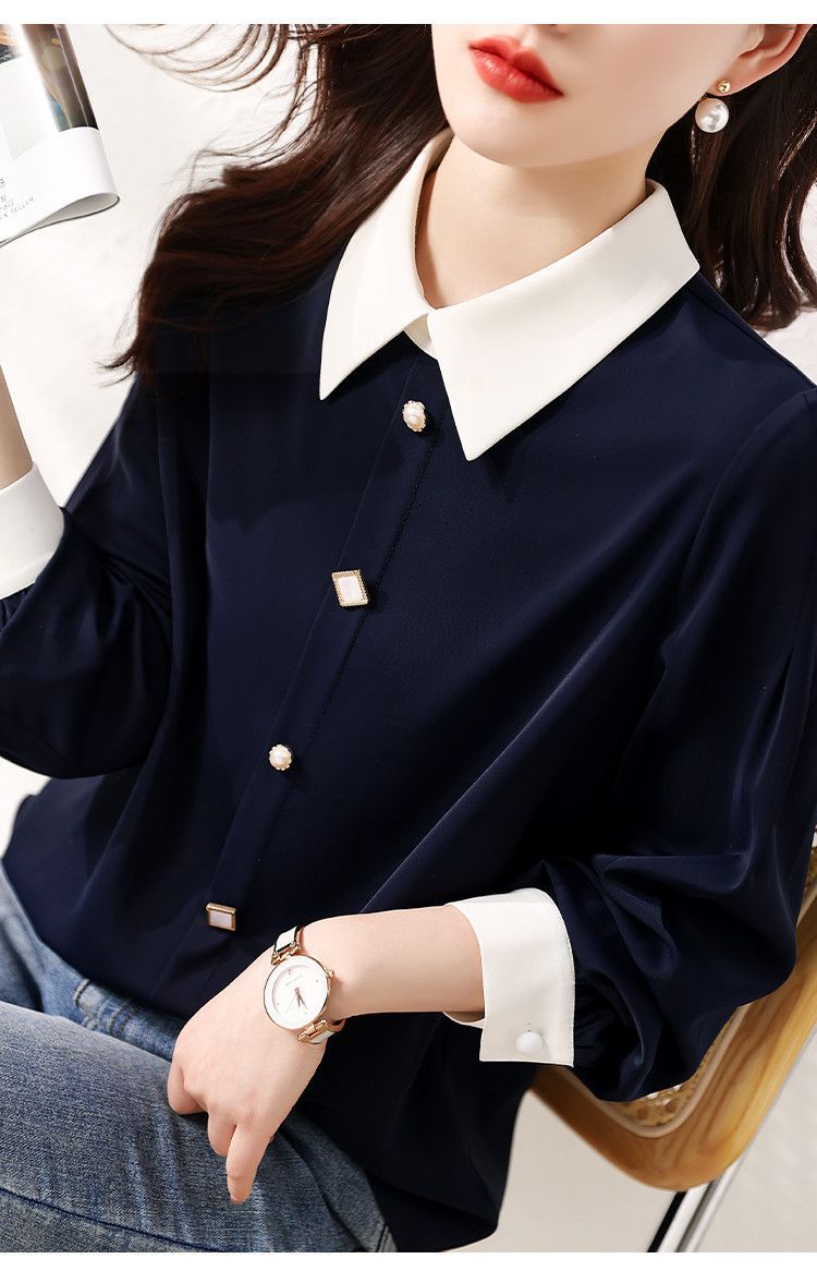 2025 봄과 가을 새로운 패션 간단한 통근 기질 대비 색상 스티치 디자인 감각 옷깃 다목적 여성 셔츠