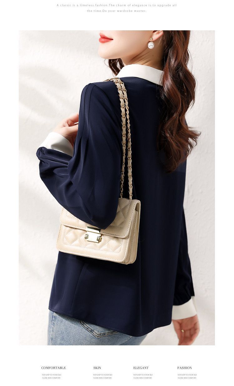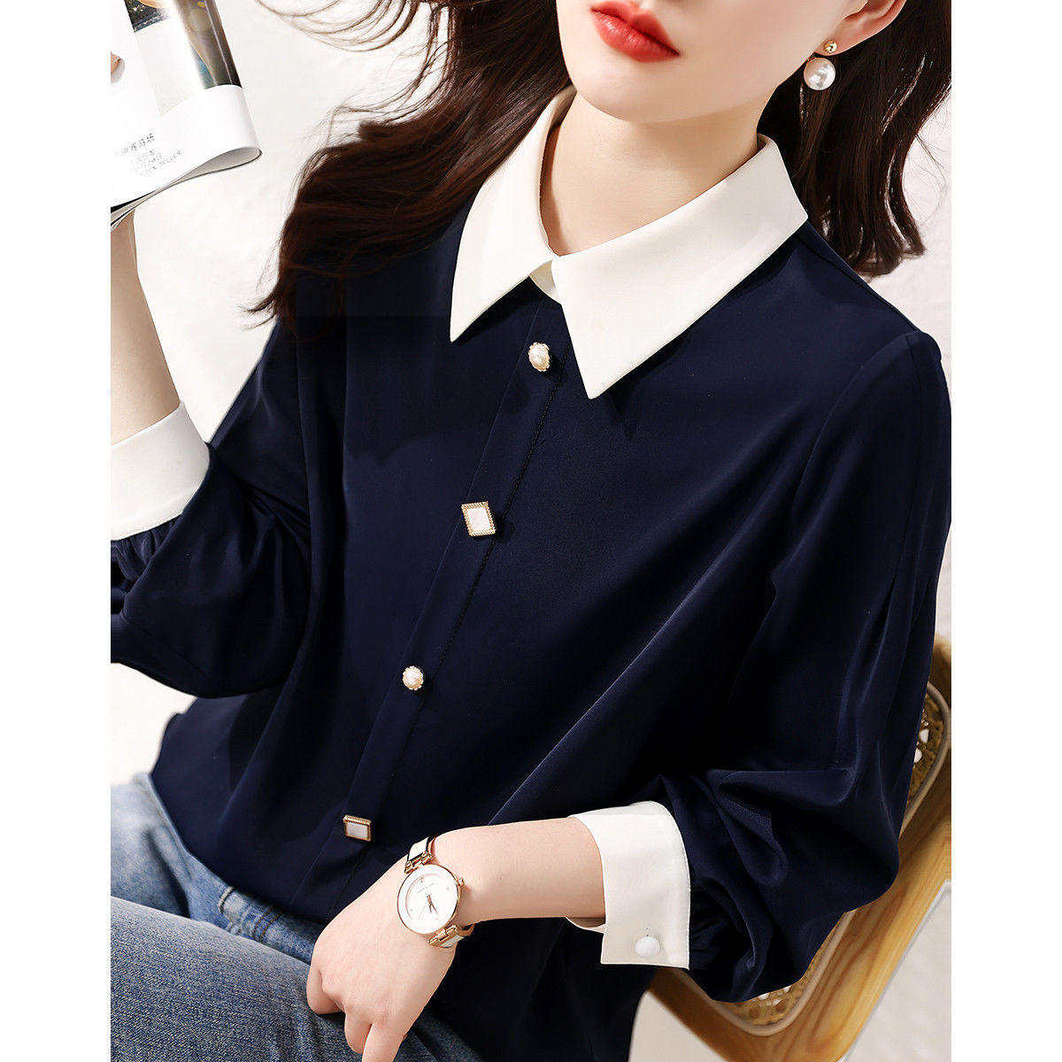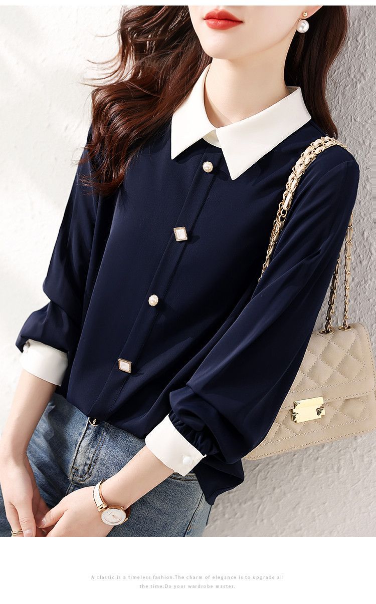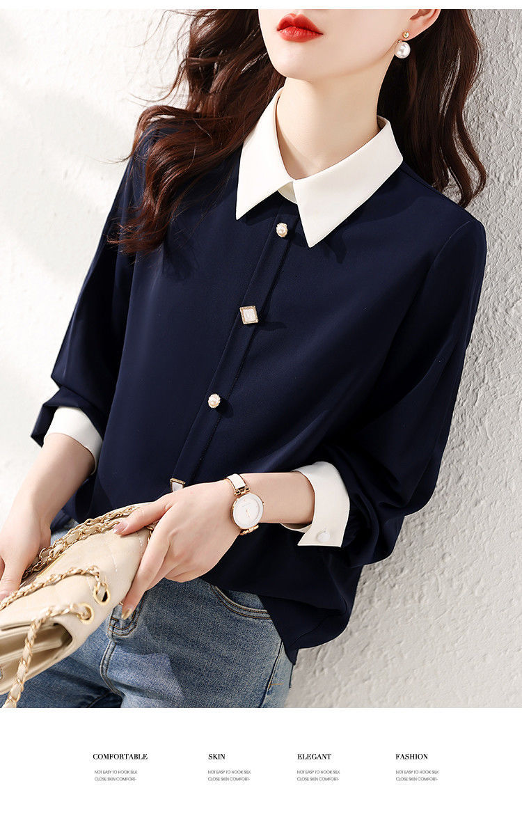 2025 봄과 가을 새로운 패션 간단한 통근 기질 대비 색상 스티치 디자인 감각 옷깃 다목적 여성 셔츠