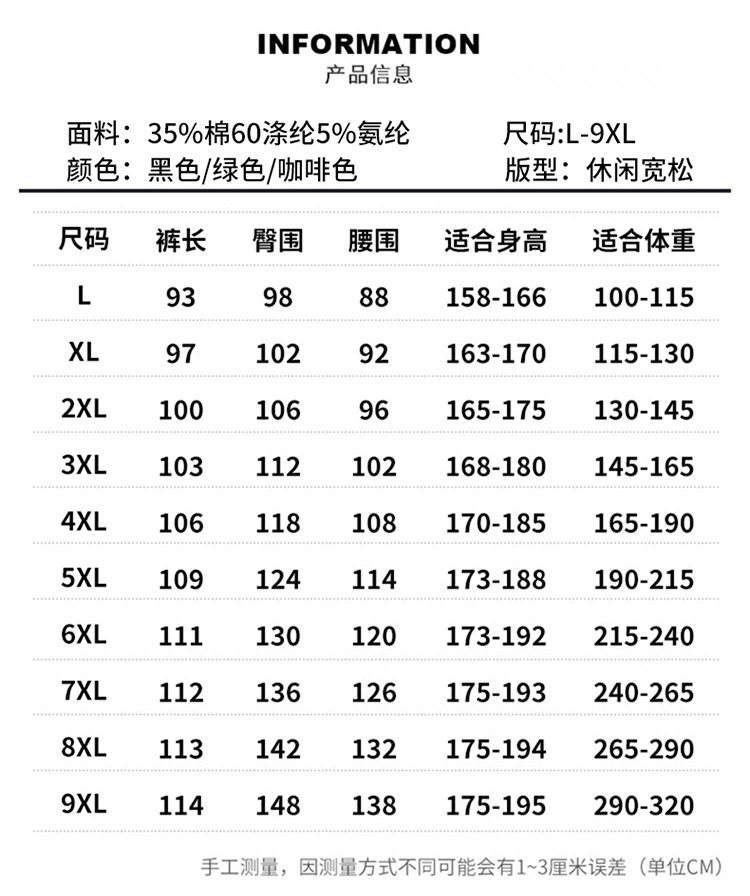 | 颜色 | 黑色【春款 束脚】, 咖啡色【春款 束脚】, 绿色【春款 束脚】, 黑色【春款 直角】, 绿色【春款 直角】, 咖色【春款 直角】, 黑色【束脚加绒加厚】, 绿色【束脚加绒加厚】, 咖色【束脚加绒加厚】, 黑色【直角加绒加厚】, 绿色【直角加绒加厚】, 咖色【直角加绒加厚】 | 尺码 | L【100-115斤】, XL【115-130斤】, 2XL【130-145斤】, 3XL【145-165斤】, 4XL【165-190斤】, 5XL【190-215斤】, 6XL【215-240斤】, 7XL【240-265斤】, 8XL【265-290斤】, 9XL【290-320斤】, 10XL【320-350斤】 |