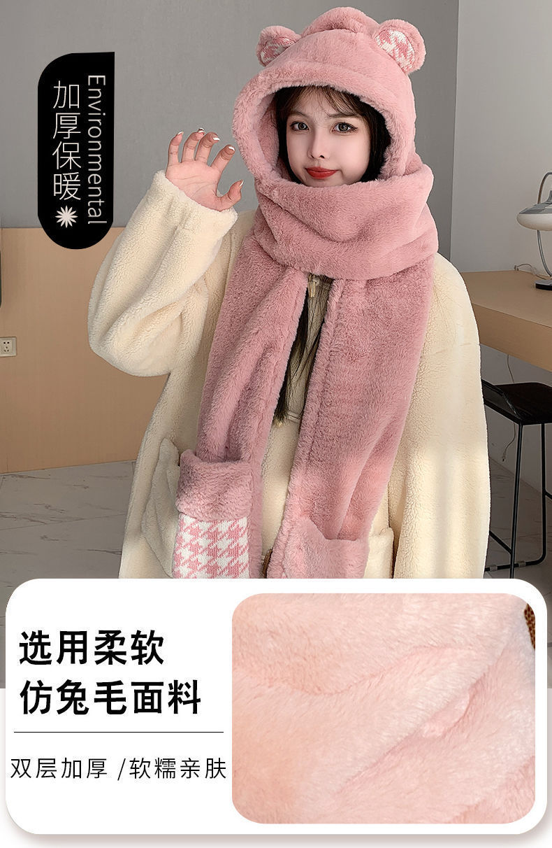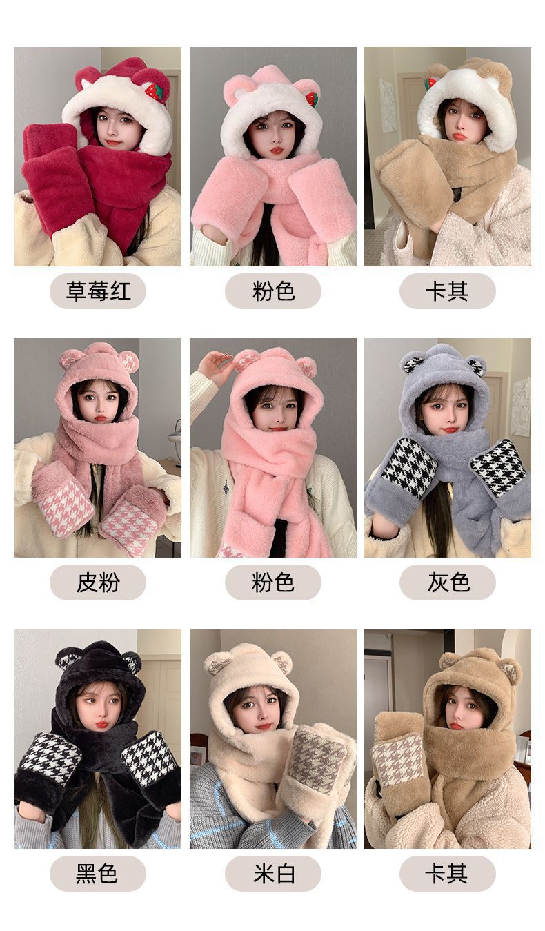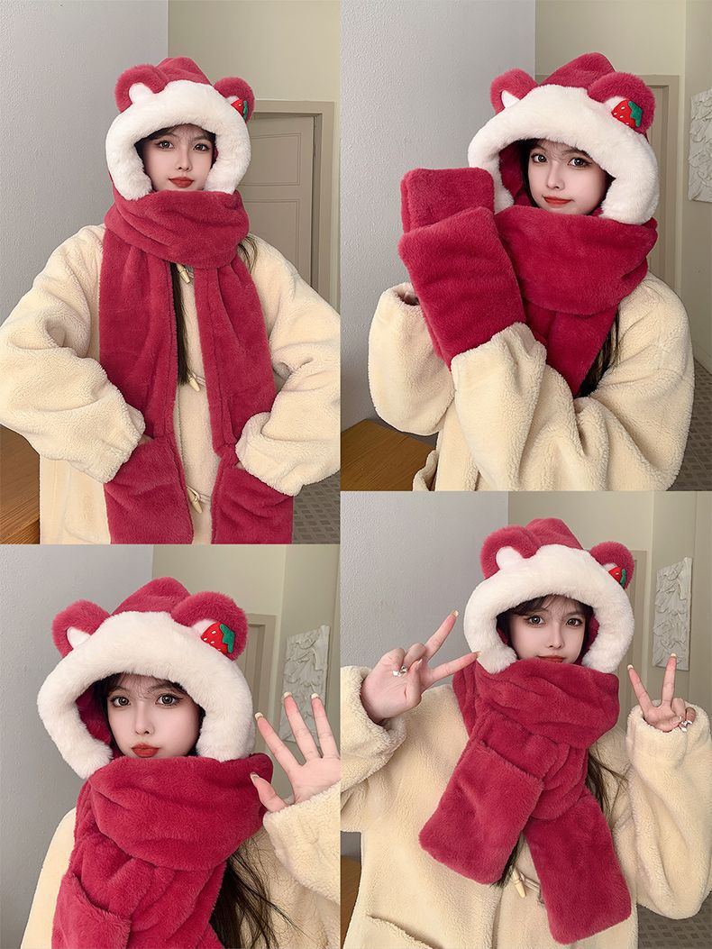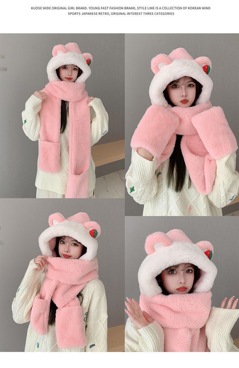 여성용 겨울 방한 보온 3종 세트 딸기곰 귀 스카프 겨울 장갑 3in1 후드