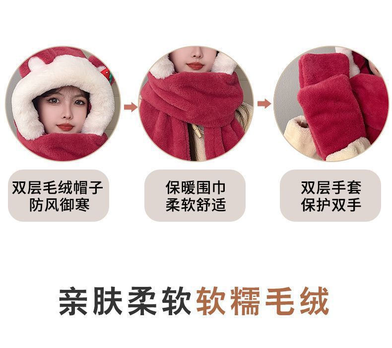 | 颜色 | 帽子围巾手套一体【可爱款-草莓红】, 帽子围巾手套一体【可爱款-草莓粉】, 帽子围巾手套一体【可爱款-草莓卡其】 | 适合季节 | 冬季 |