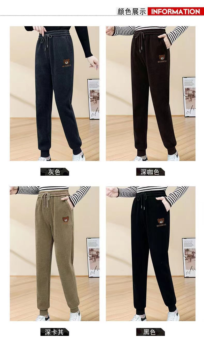 벨벳 안감 두꺼운 여성용 스웨트팬츠 봄 가을 겨울 하이웨이스트 조거 팬츠 슬림핏 곰 자수 코듀로이 캐주얼 스포츠 팬츠