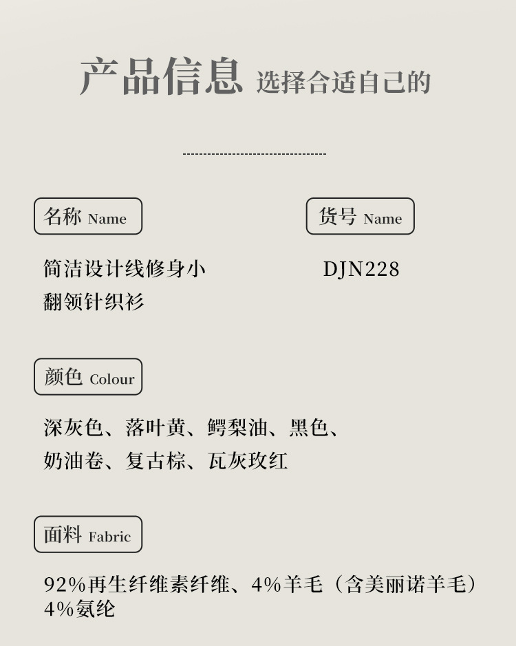 | 颜色 | 深灰色, 落叶黄, 鳄梨油, 奶油卷, 黑色, 复古棕, 瓦灰玫红 | 尺码 | S, M, L, XL |