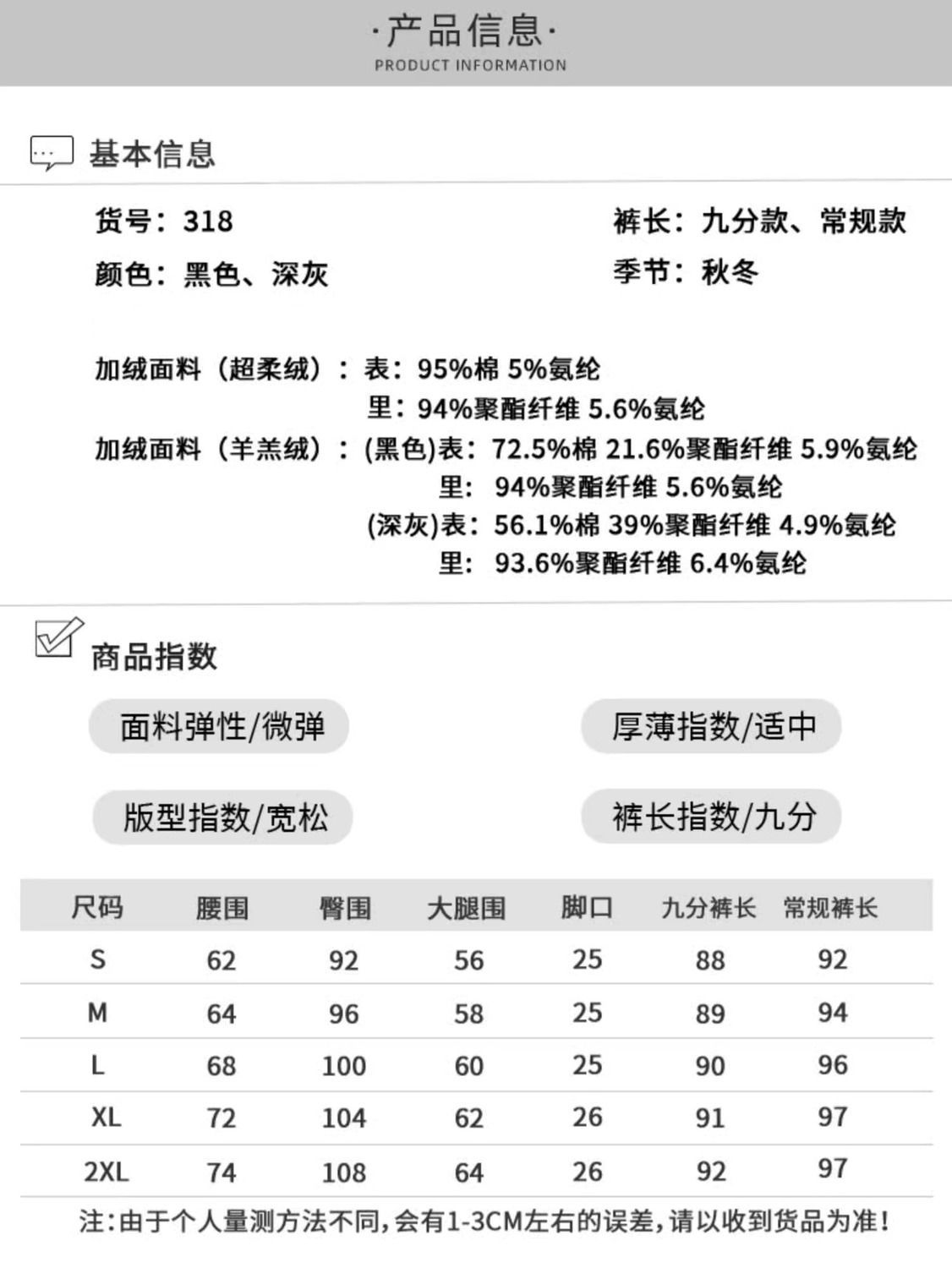 | 颜色 | 黑色长裤【加绒】法国罗纹, 浅灰色长裤【加绒】法国罗纹, 深灰色长裤【加绒】法国罗纹, 黑色九分裤【加绒】法国罗纹, 浅灰色九分裤【加绒】法国罗纹, 深灰色九分裤【加绒】法国罗纹 | 尺码 | S, L, XL, 2XL, M |