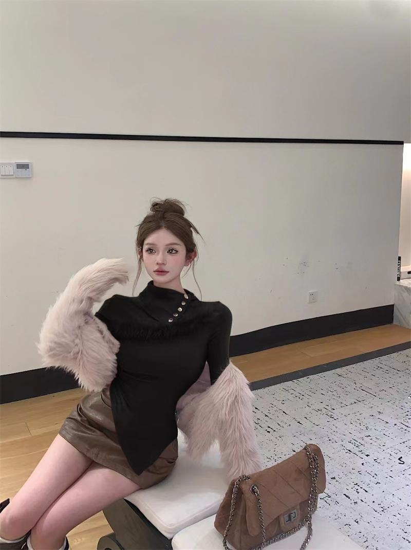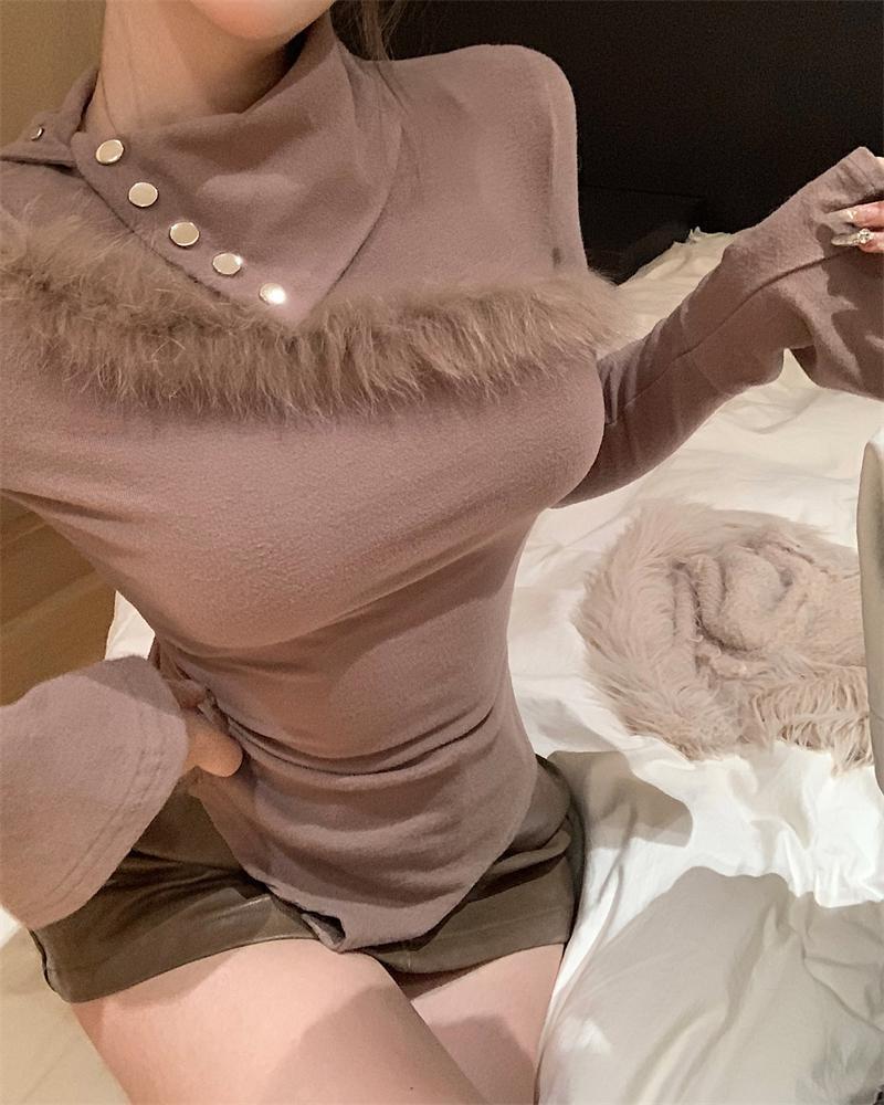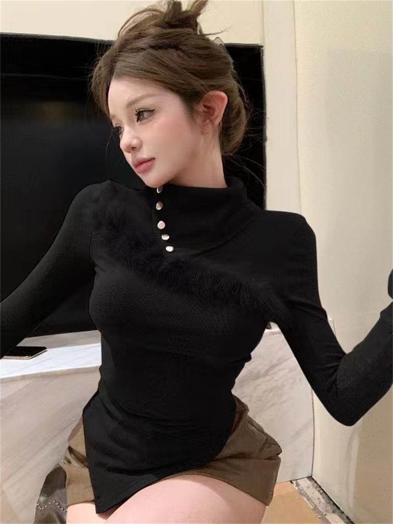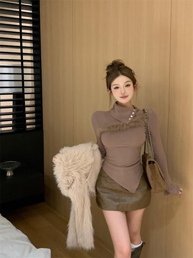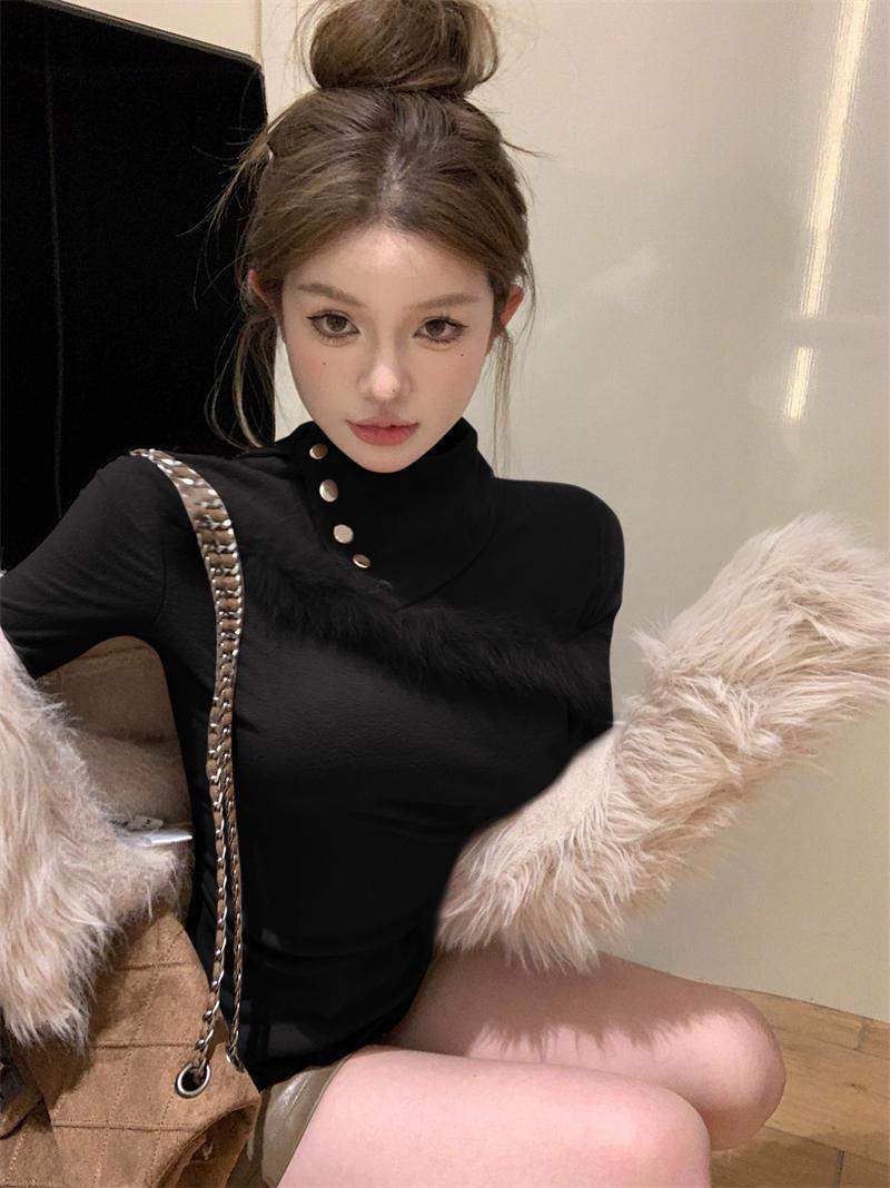 드 벨벳 불규칙한 터틀넥 모피 스티칭 티셔츠 여성용 슬림 바닥 셔츠 디자인 감각 틈새 긴 소매 어깨 탑