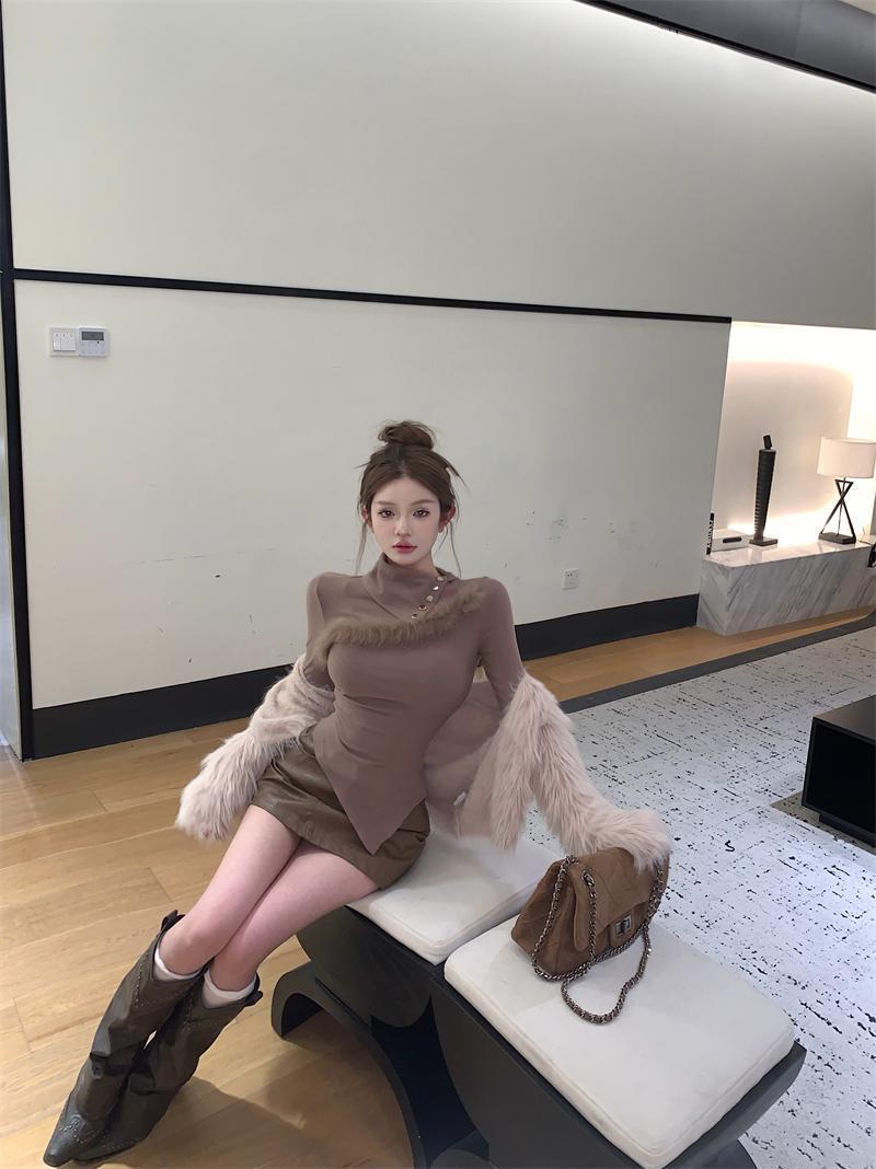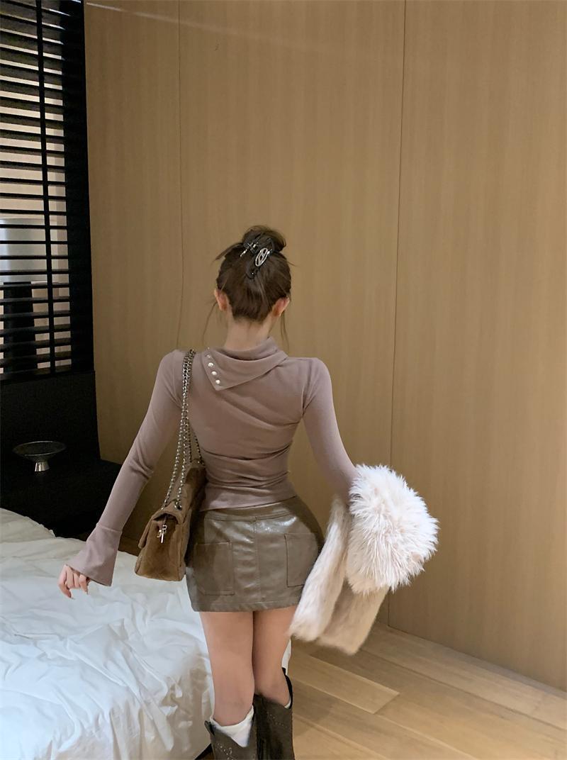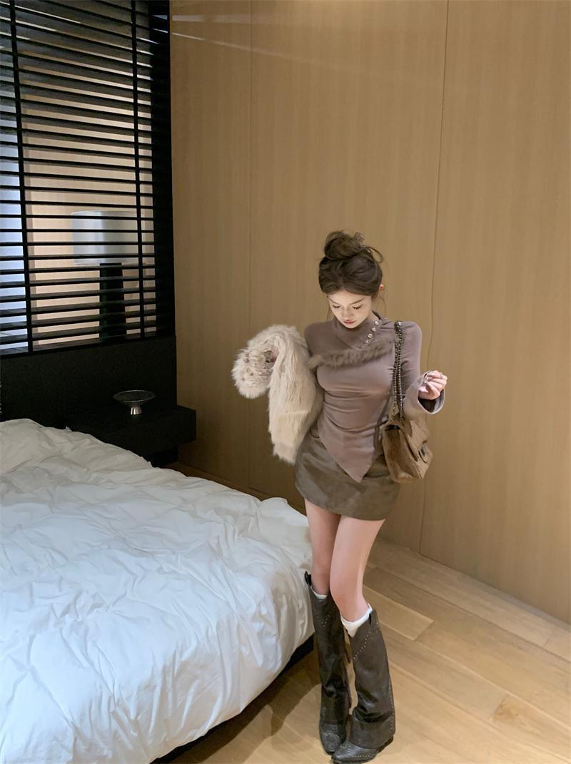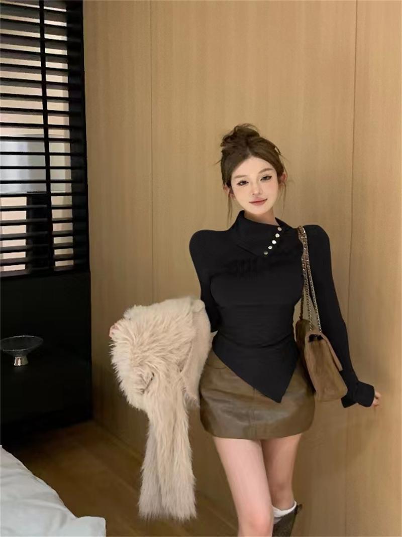 드 벨벳 불규칙한 터틀넥 모피 스티칭 티셔츠 여성용 슬림 바닥 셔츠 디자인 감각 틈새 긴 소매 어깨 탑
