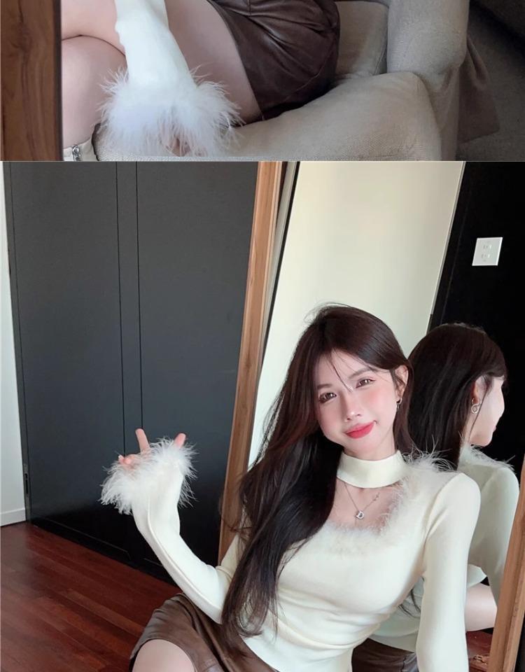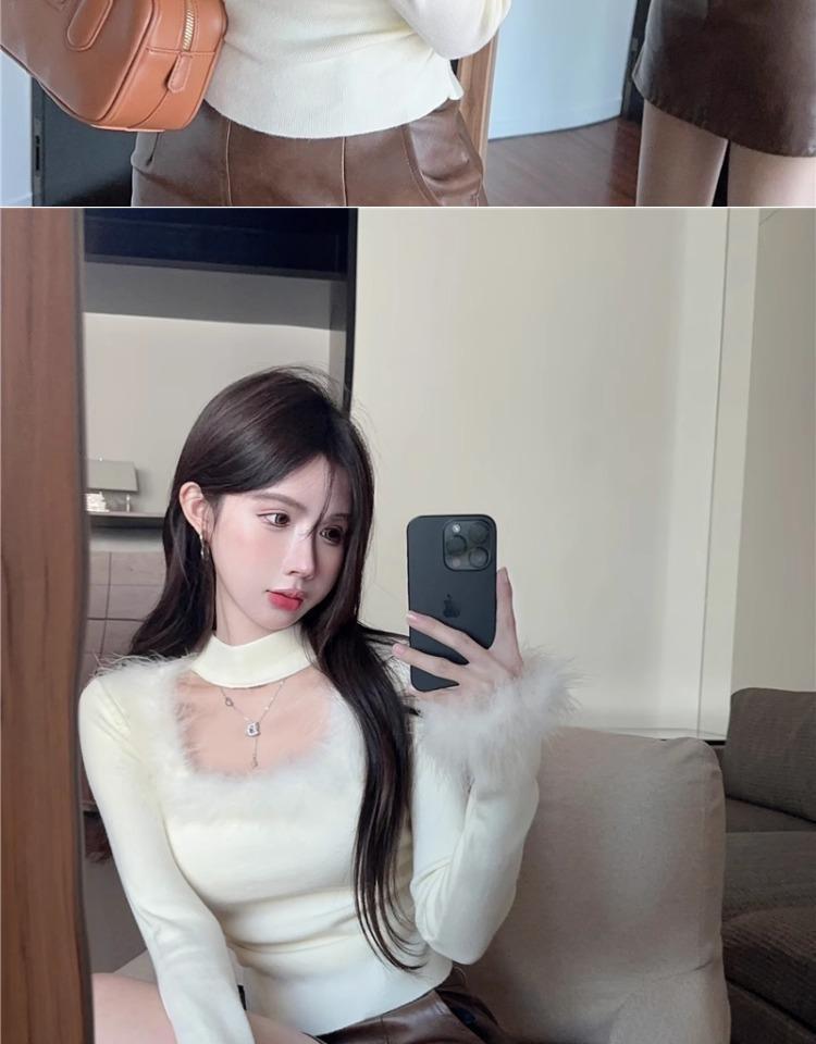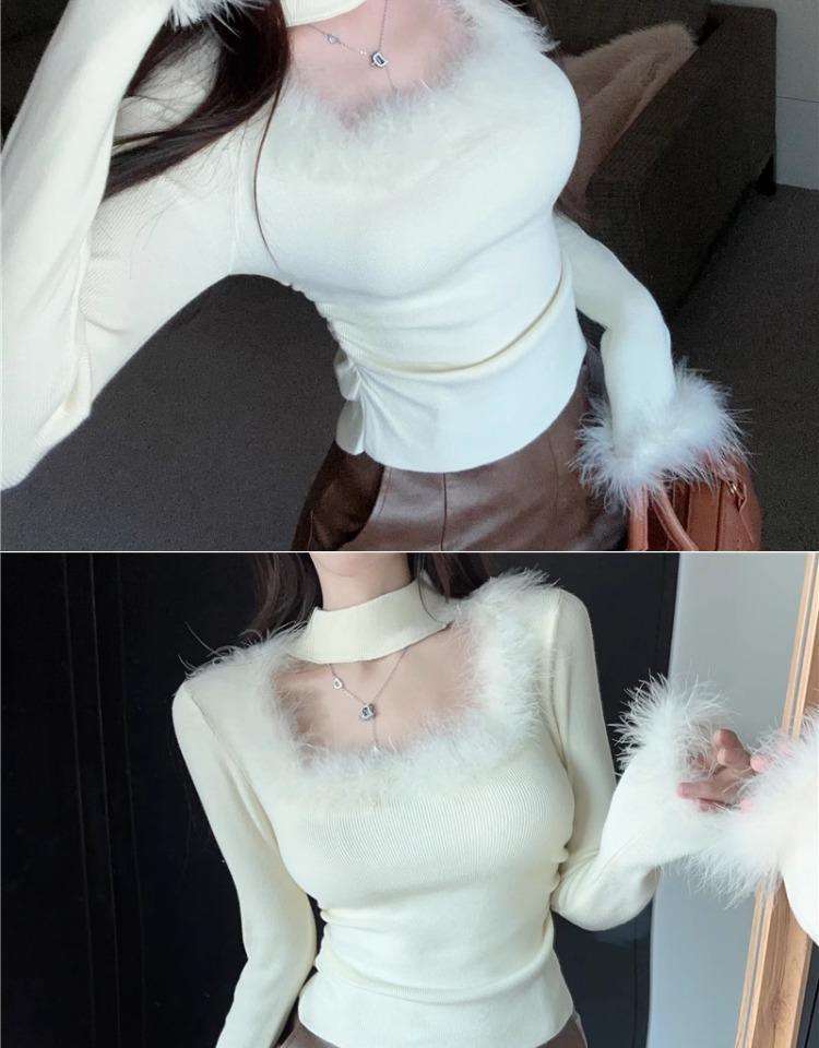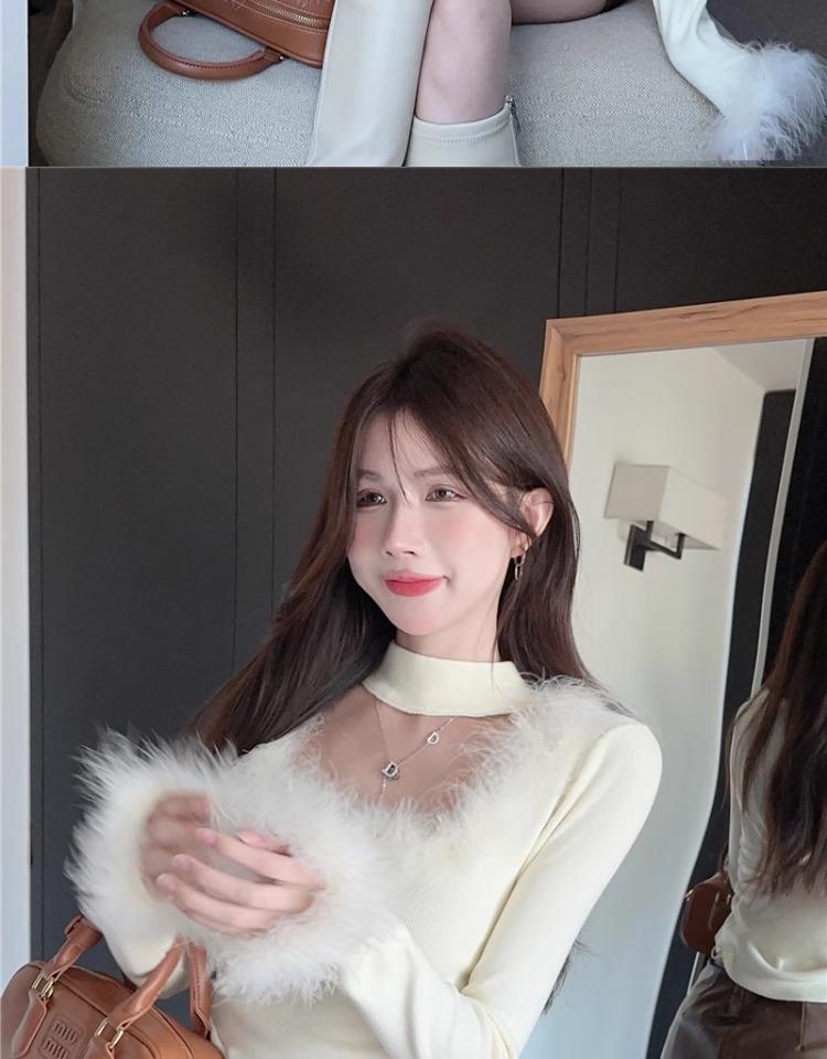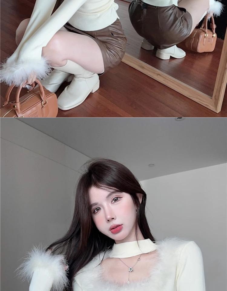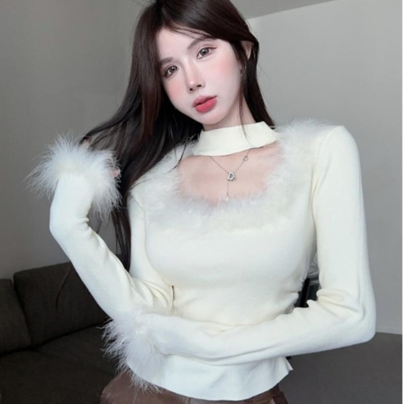 가을 겨울 달콤하고 매운 플러시 스퀘어넥 홀터넥 슬림핏 숏탑 디자인 여성용 레이디셔츠