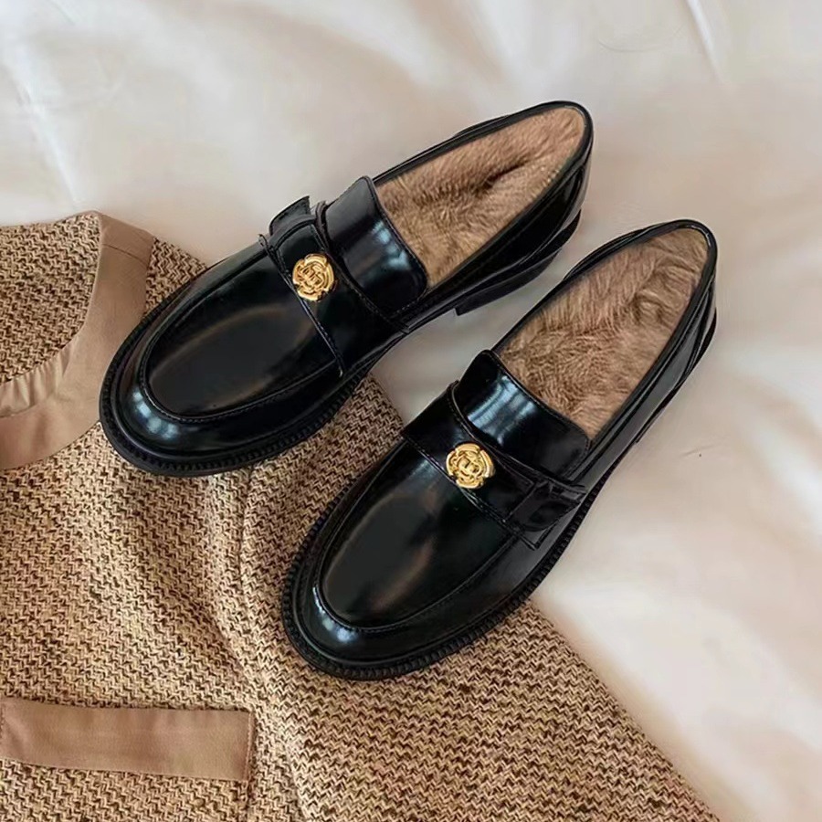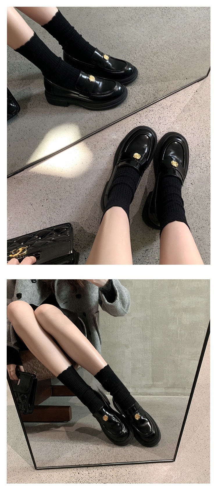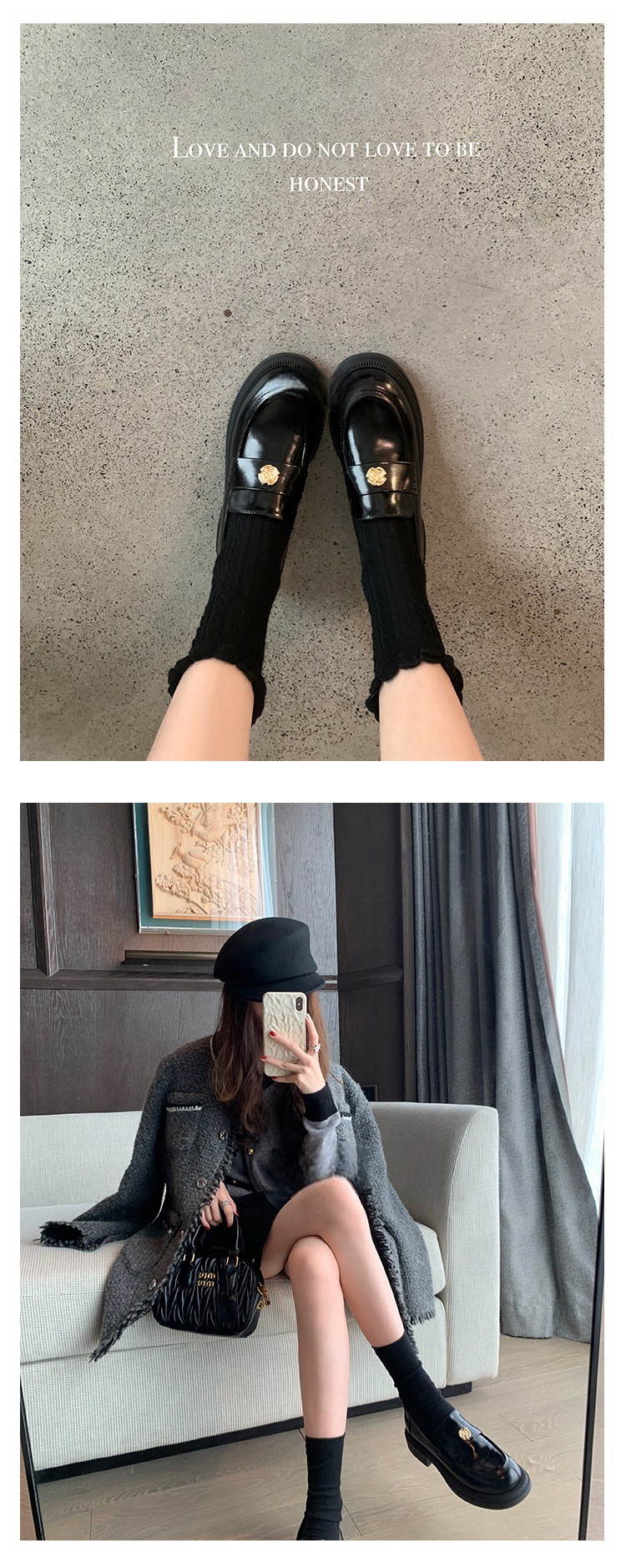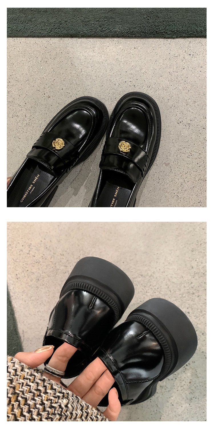 가죽 동백꽃 여성용 가을 겨울 두꺼운 굽 슬립온 로퍼 여성용 단화 편안하고 따뜻한 로리타 스타일