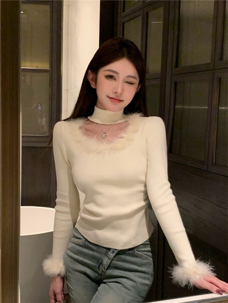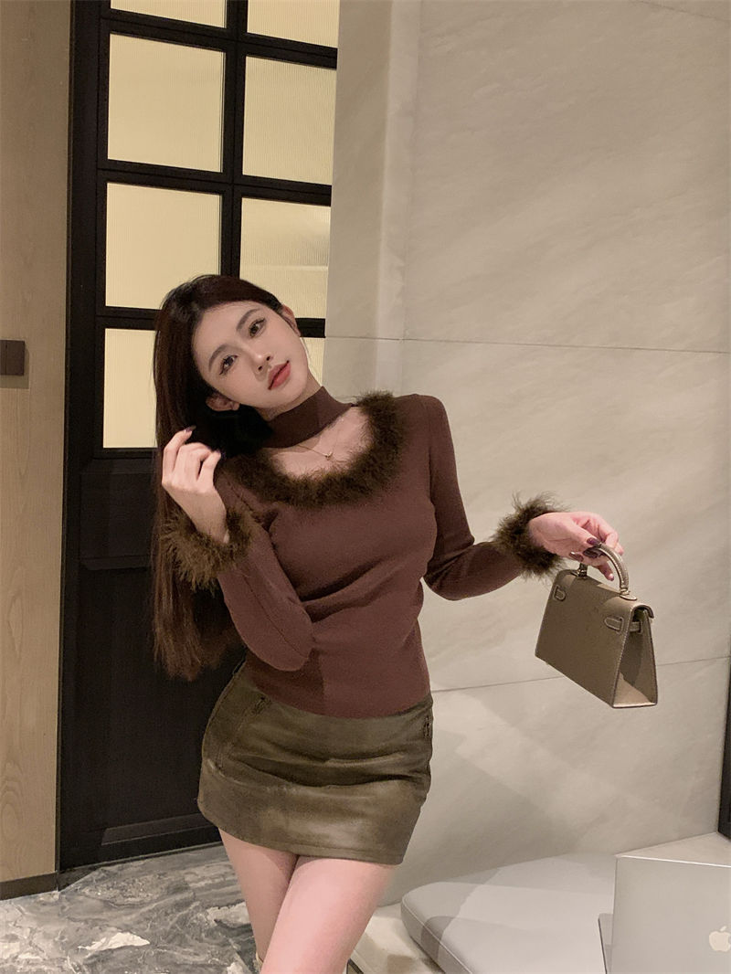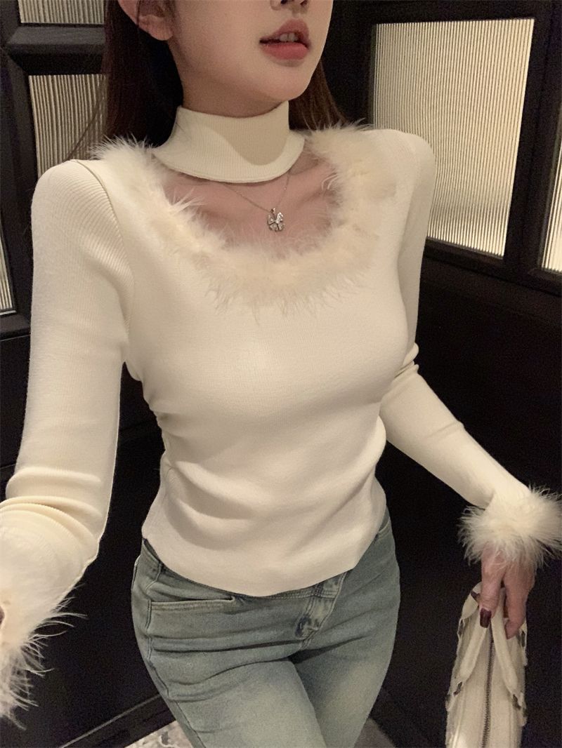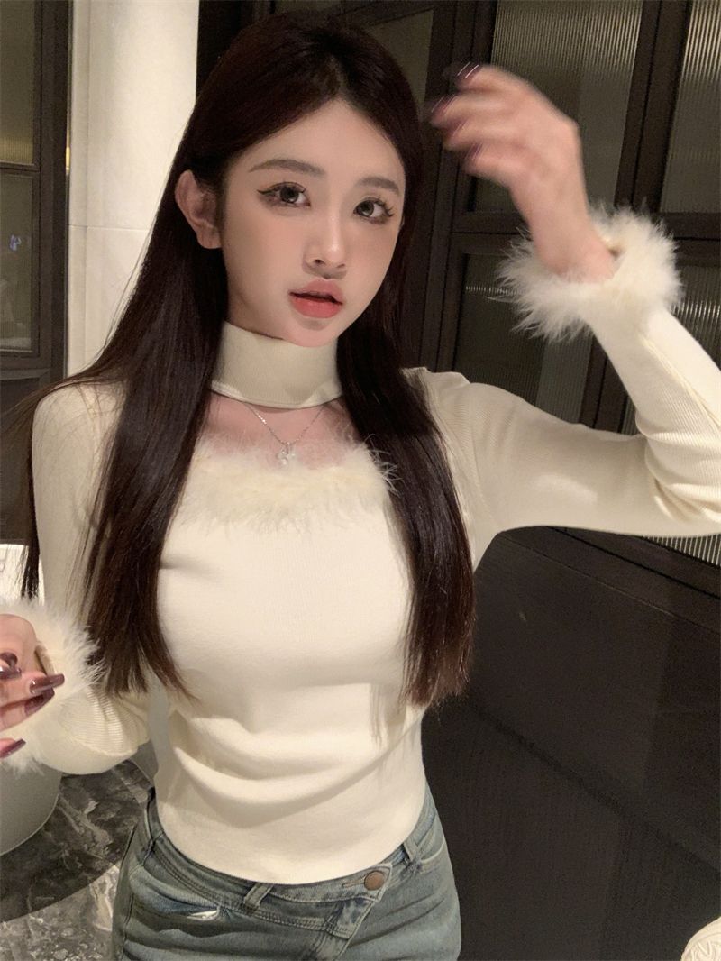 모피 스티칭 홀터 둥근 목 부드러운 Nuode 벨벳 바닥 셔츠 가을 및 겨울 여성을위한 새로운 슬림 핏 슬리밍 내부 긴 소매 탑