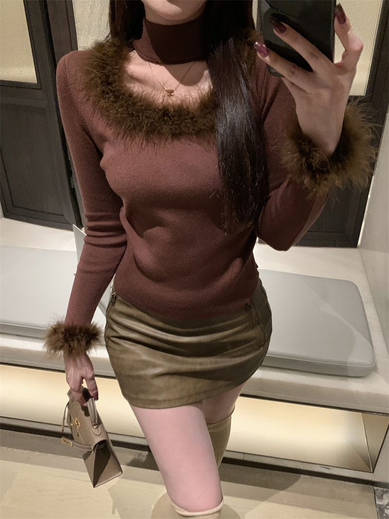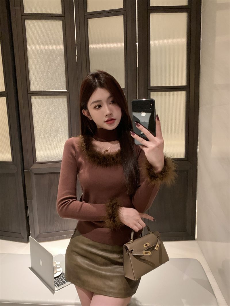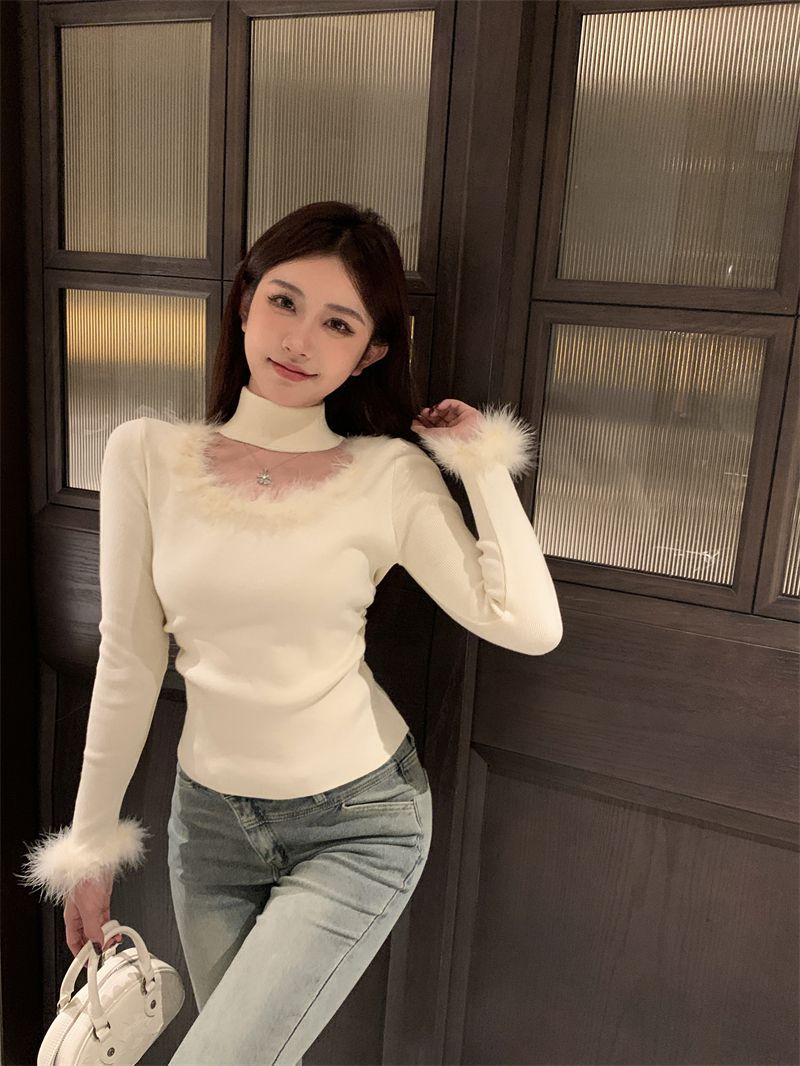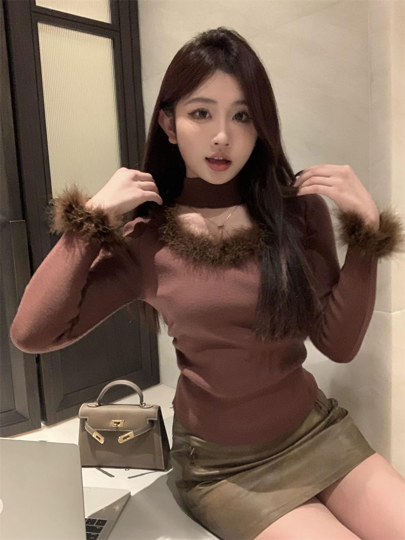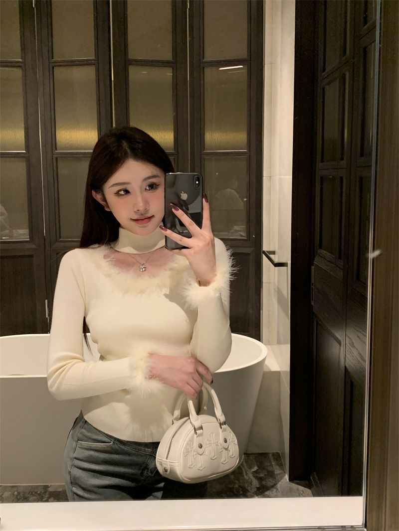 모피 스티칭 홀터 둥근 목 부드러운 Nuode 벨벳 바닥 셔츠 가을 및 겨울 여성을위한 새로운 슬림 핏 슬리밍 내부 긴 소매 탑