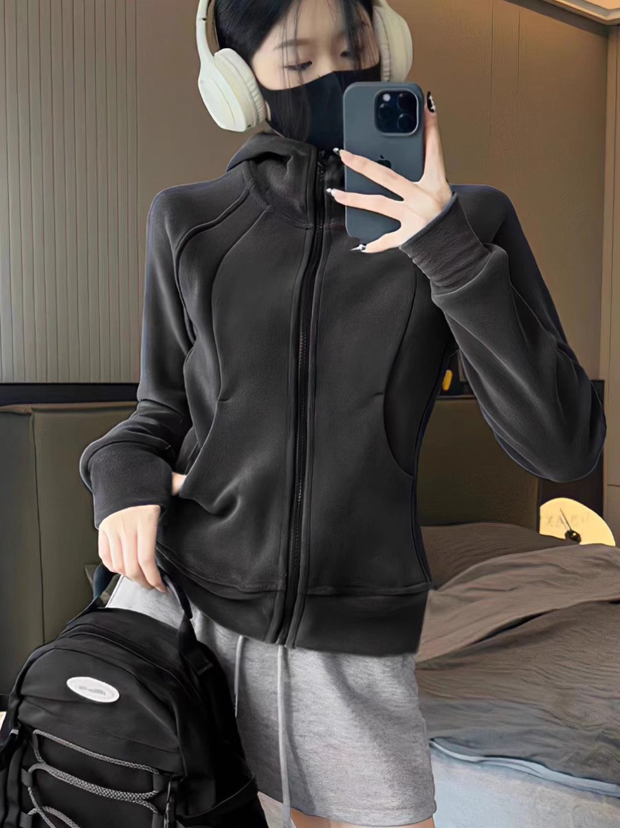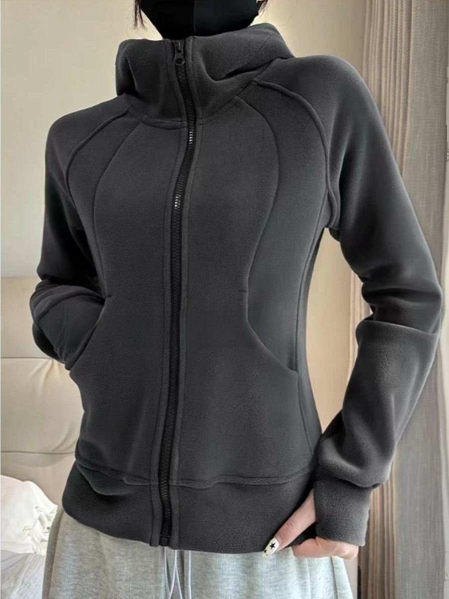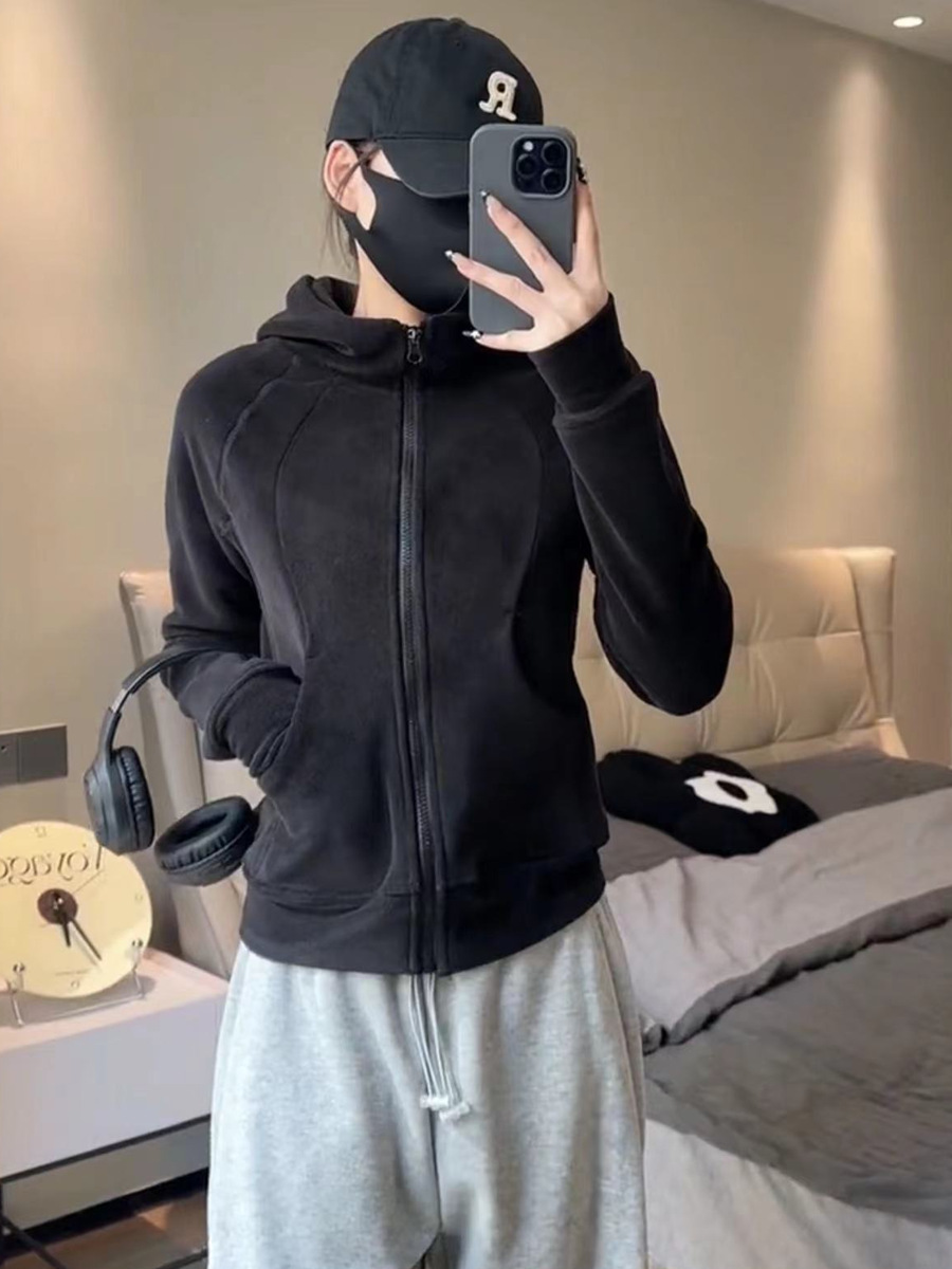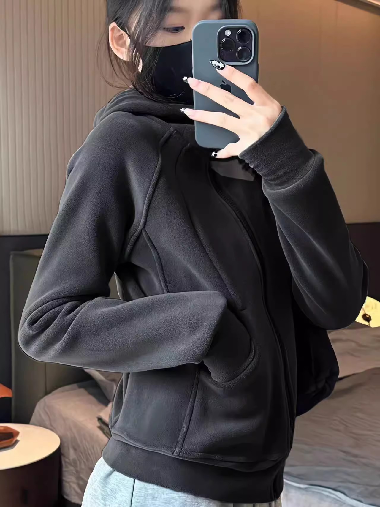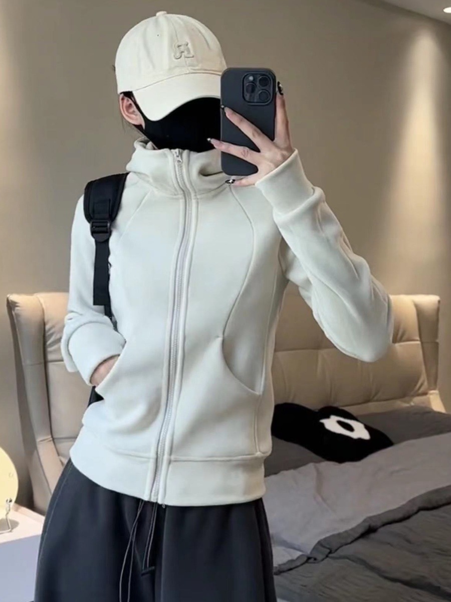 미국 스타일의 간단한 양면 벨벳 두꺼운 스탠드 컷 후드 스웨터 여성의 순수한 뜨거운 소녀 패션 지퍼 어깨 슬리밍 코트 겨울
