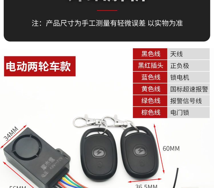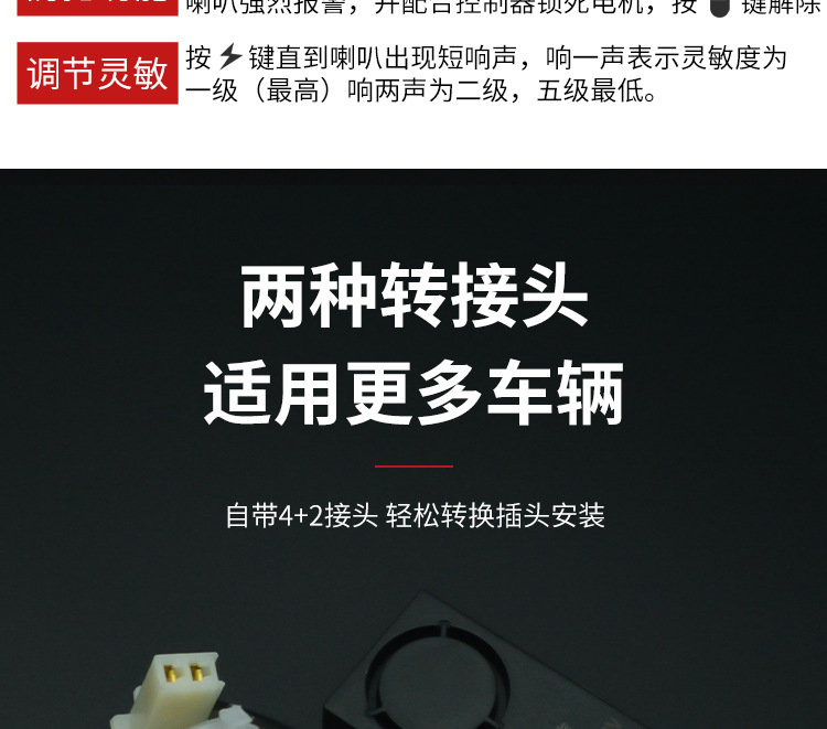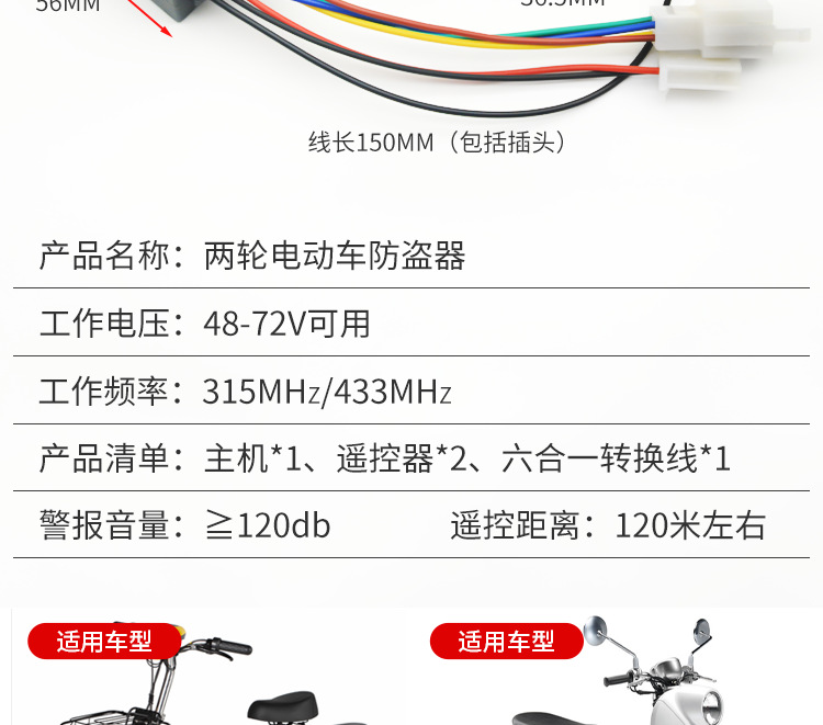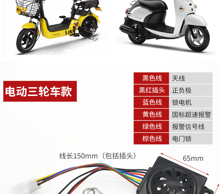 | 包装规格 | 电动两轮车防盗器36-72V, 电动三轮车防盗器36-72V, 小6孔插头防盗器/个, 8孔6线防盗器/个 | 是否跨境出口专供货源 | 否 |