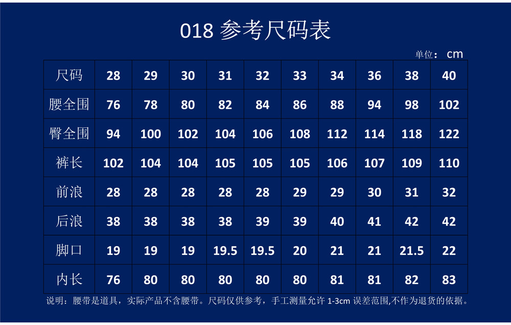 | 颜色 | 黑色, 深灰色, 卡其色, 土绿色 | 尺码 | 29, 30, 31, 32, 33, 34, 36, 38, 40 |