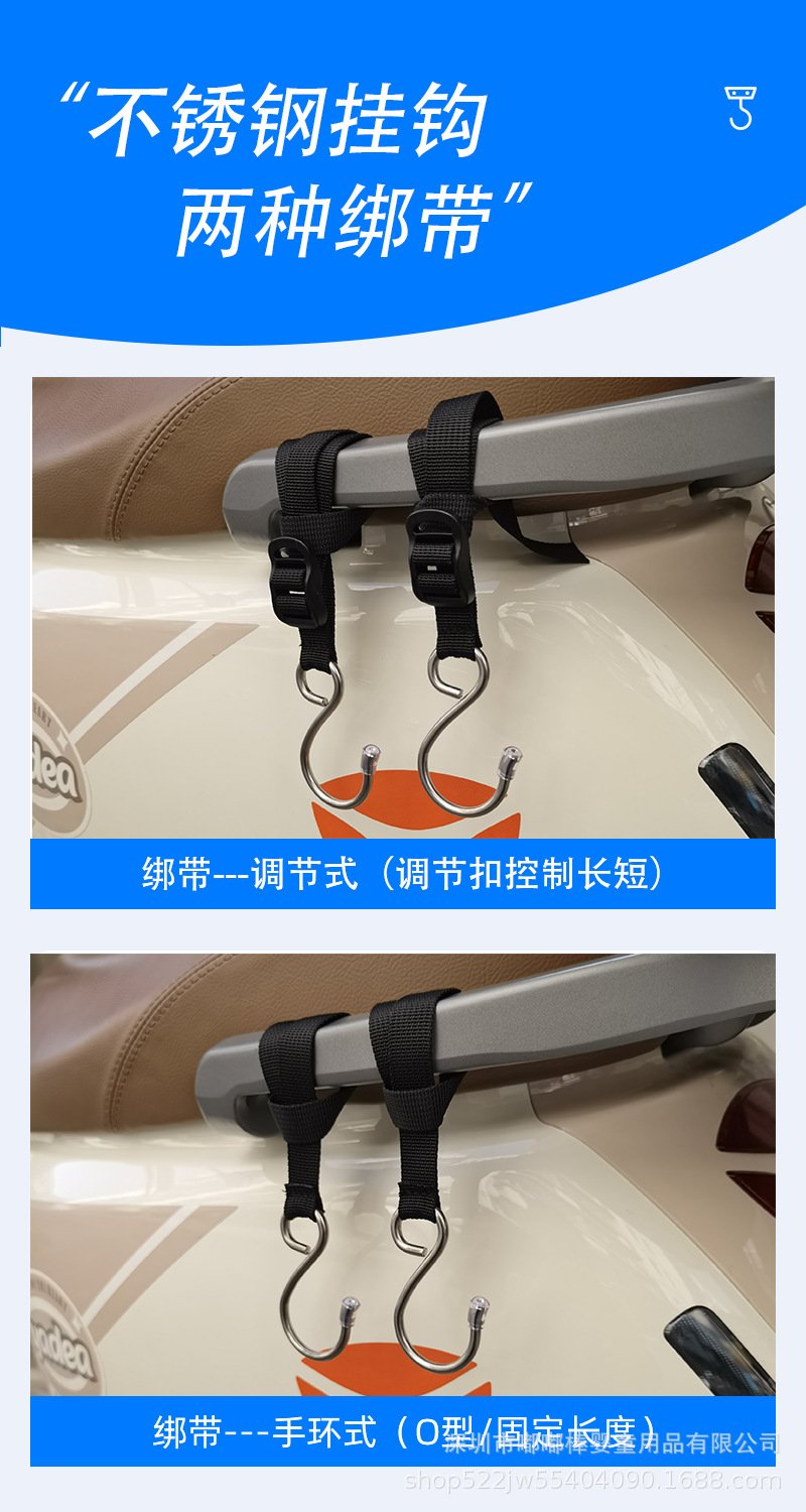 | 产品类别 | 电动车前置挂钩调节绑带挂钩 | 材质 | 不锈钢+尼龙 |
