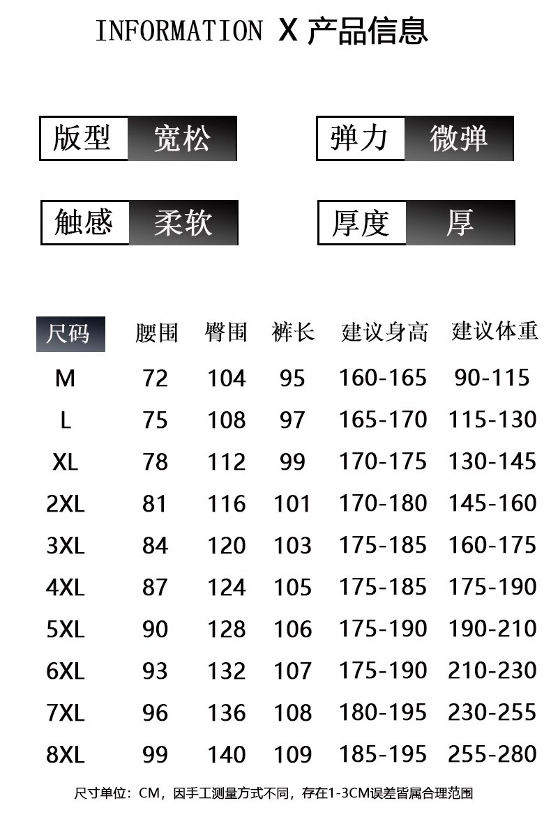 | 颜色 | 任意两条优惠装自由搭配, K111黑色, K111深灰, K112深灰, K112黑色, K610黑色, K006灰色, K006黑色, K116黑色 | 尺码 | M, L, XL, 2XL, 3XL, 4XL, 5XL, 6XL, 7XL, 8XL |