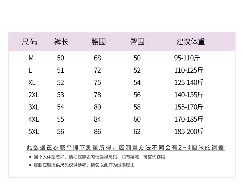 | 尺码 | M码95-110斤, L码110-125斤, XL码125-140斤, 2XL码140-155斤, 3XL码155-170斤, 4XL码170-185斤, 5XL码185-200斤 | 品牌 | 心程悦 |