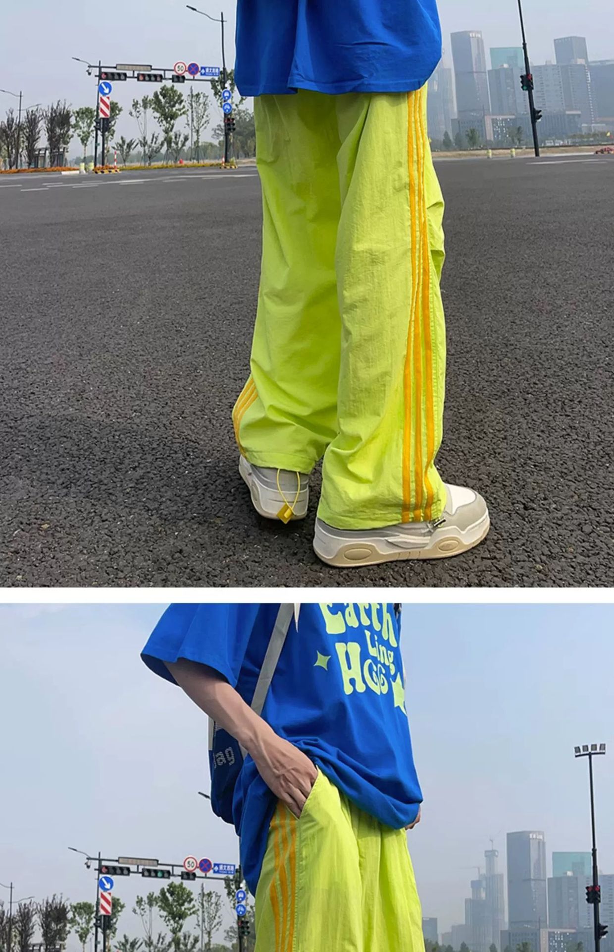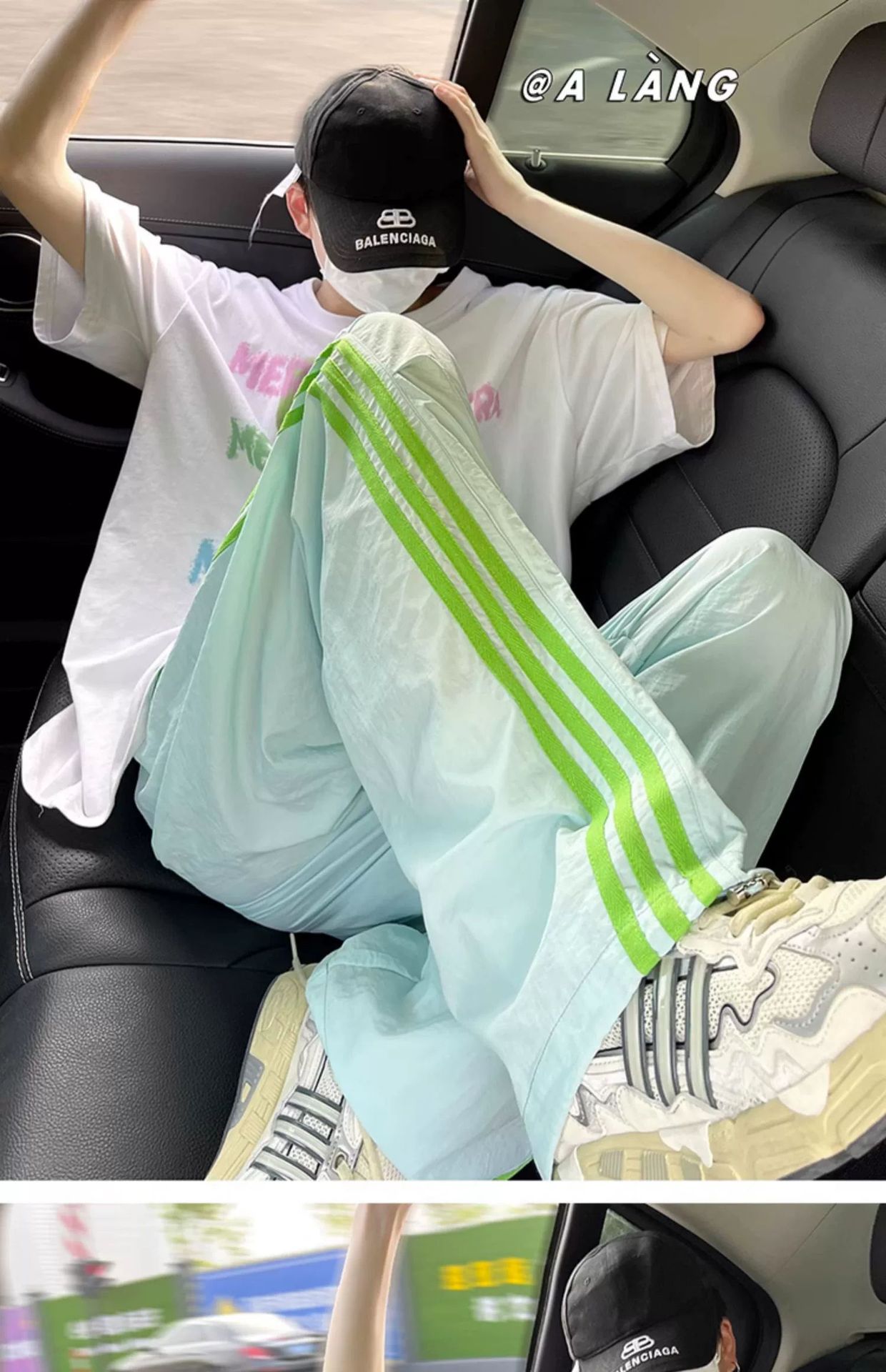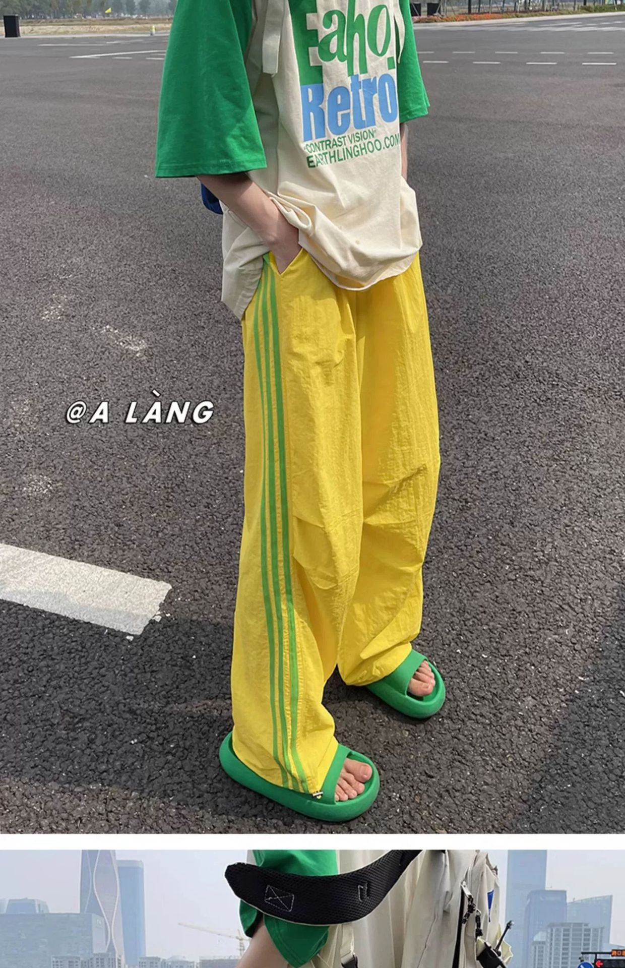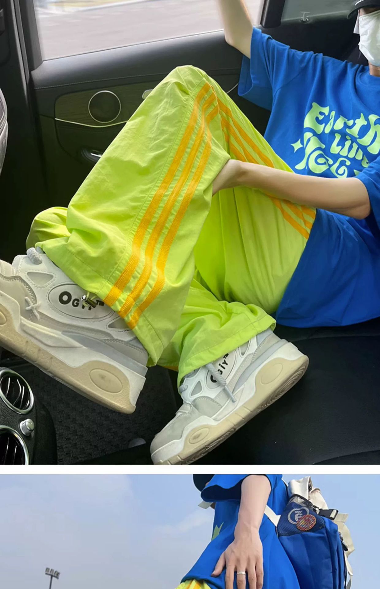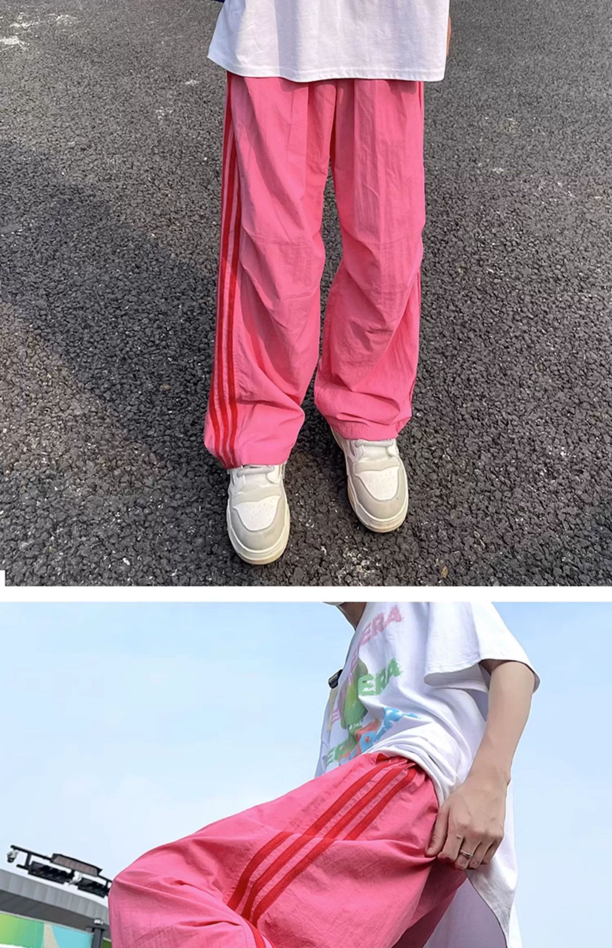 도파민 컬러 착용 낙하산 바지 남성 여름 얇은 아이스 실크 바지 미국식 사이드 스트라이프 빠른 건조 바지