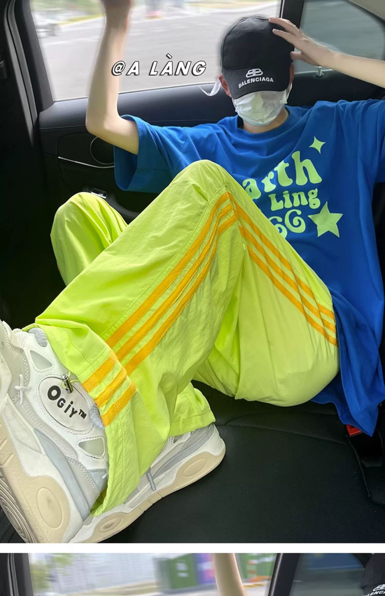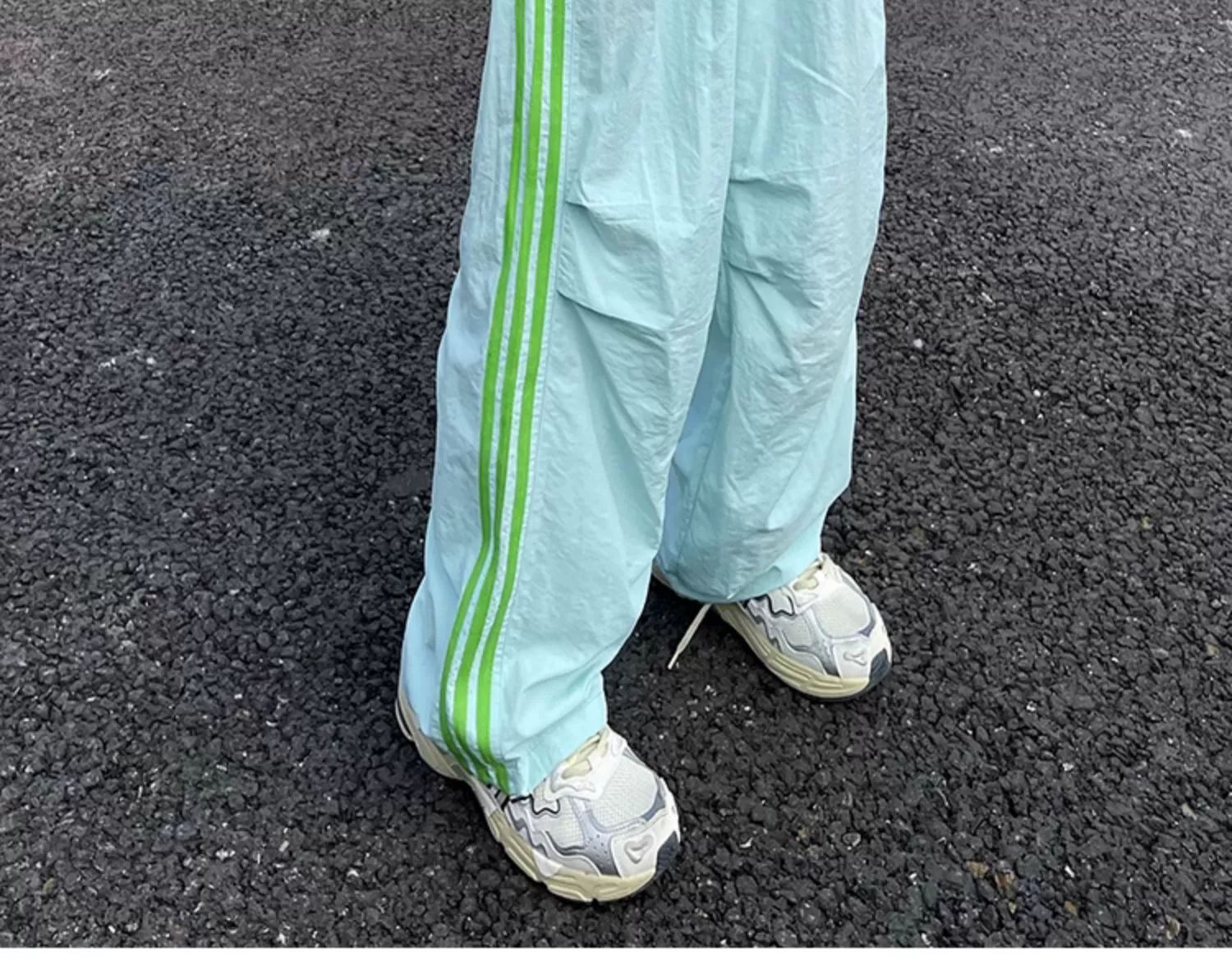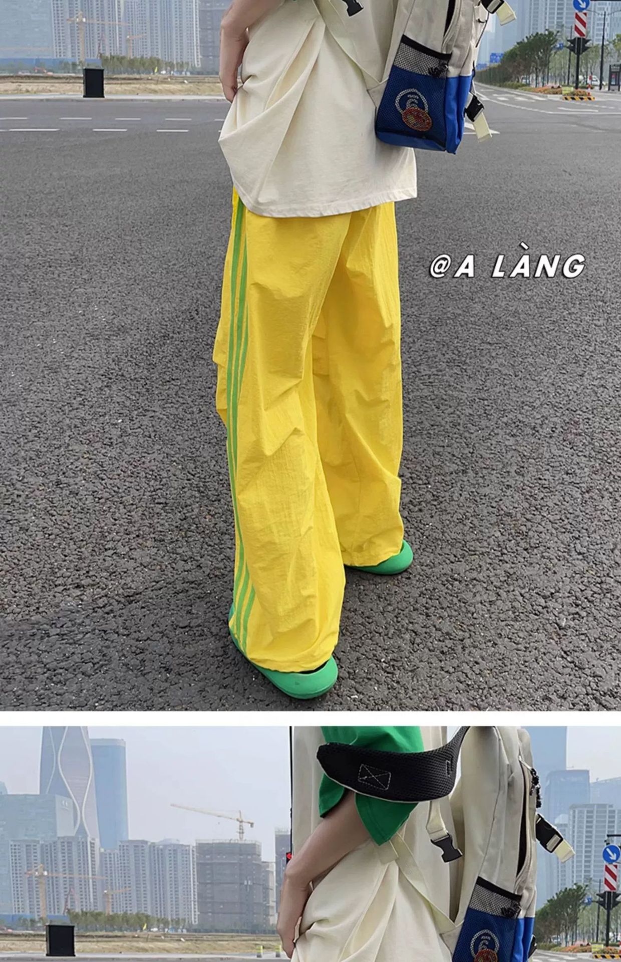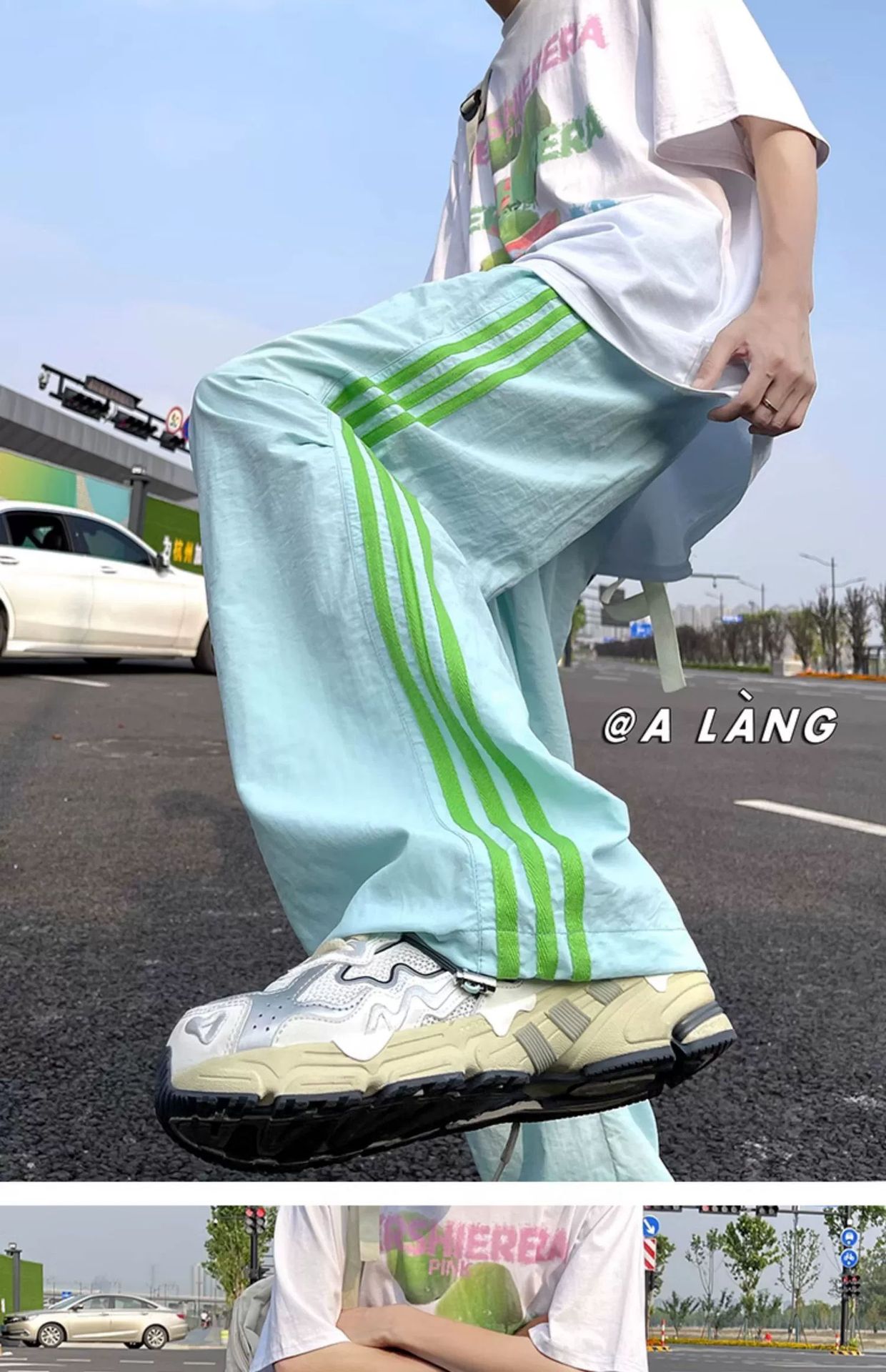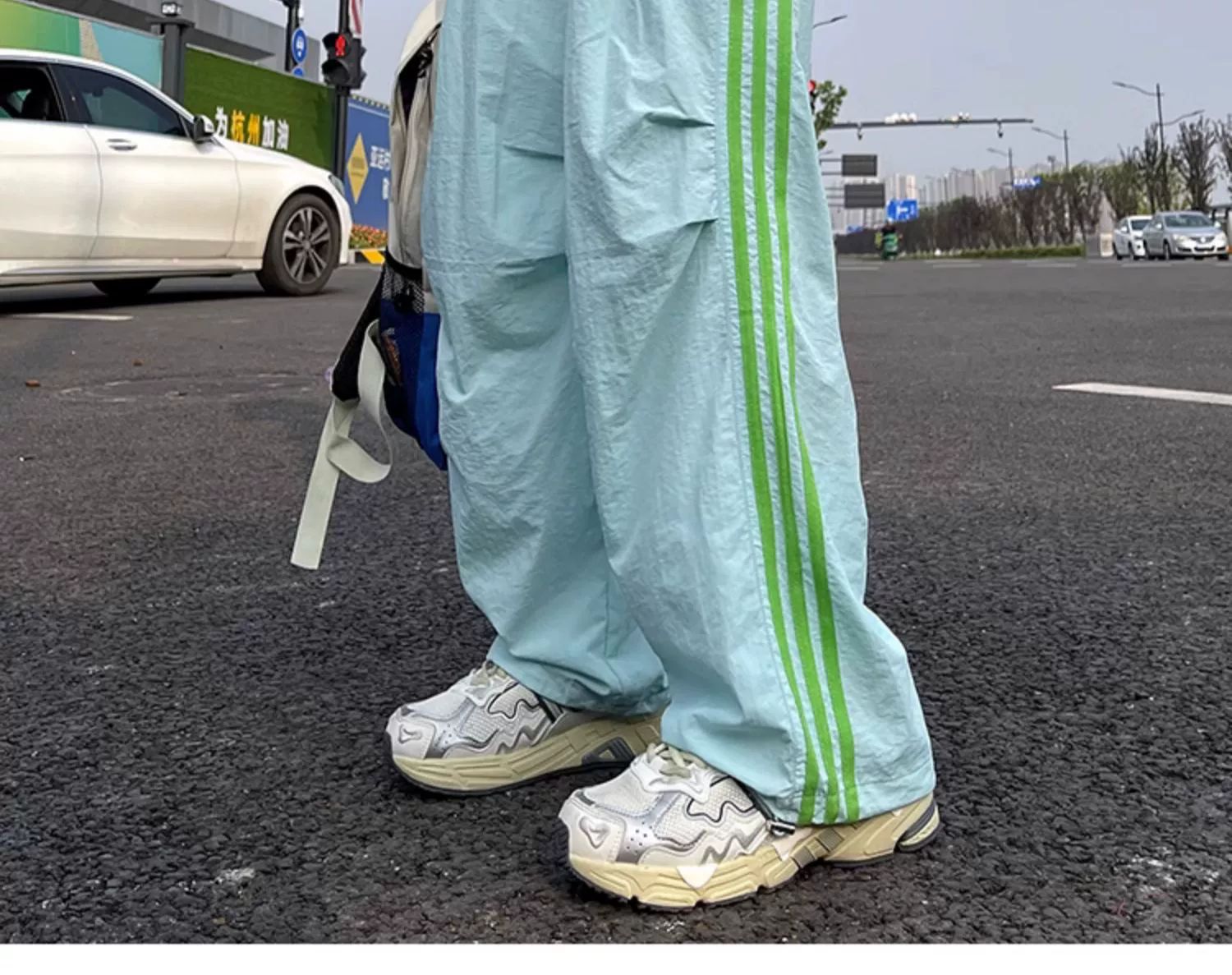 도파민 컬러 착용 낙하산 바지 남성 여름 얇은 아이스 실크 바지 미국식 사이드 스트라이프 빠른 건조 바지